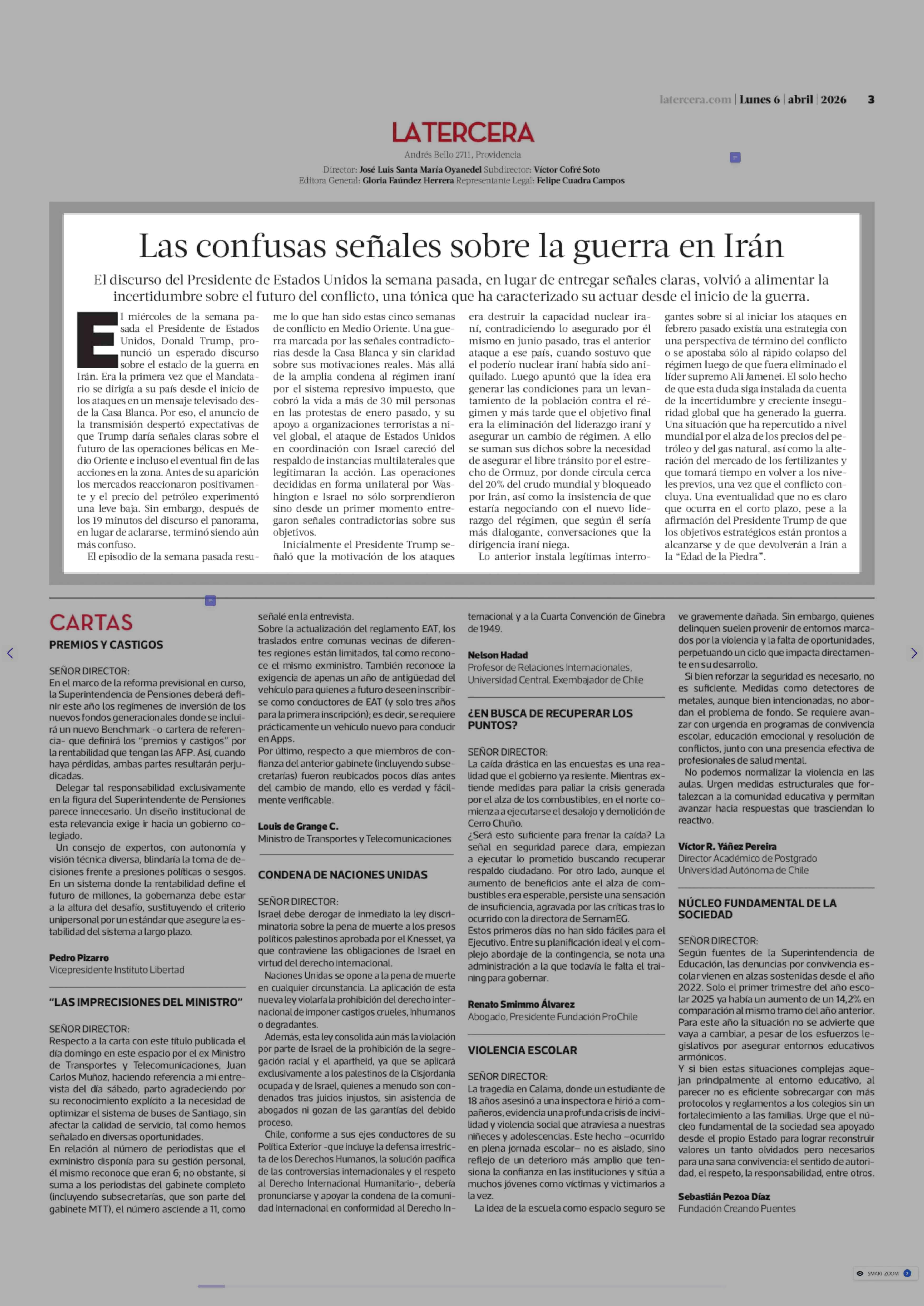 EDITORIAL: Las confusas señales sobre la guerra en Irán 06-04-2026 La Tercera |