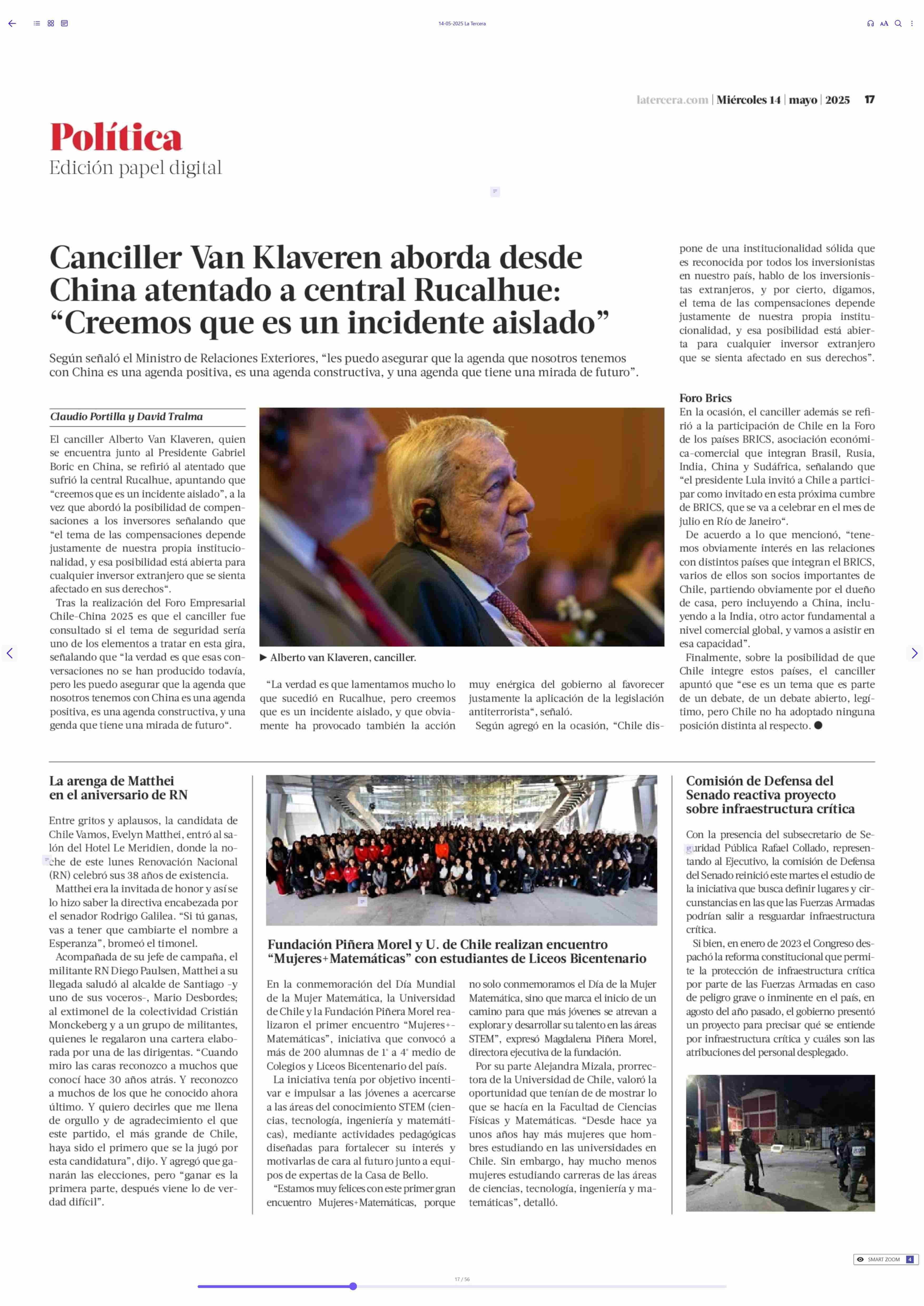 Fundación Piñera Morel y U. de Chile realizan encuentro “Mujeres+ Matemáticas” con estudiantes de Liceos Bicentenario 14-05-2025 La Tercera |
