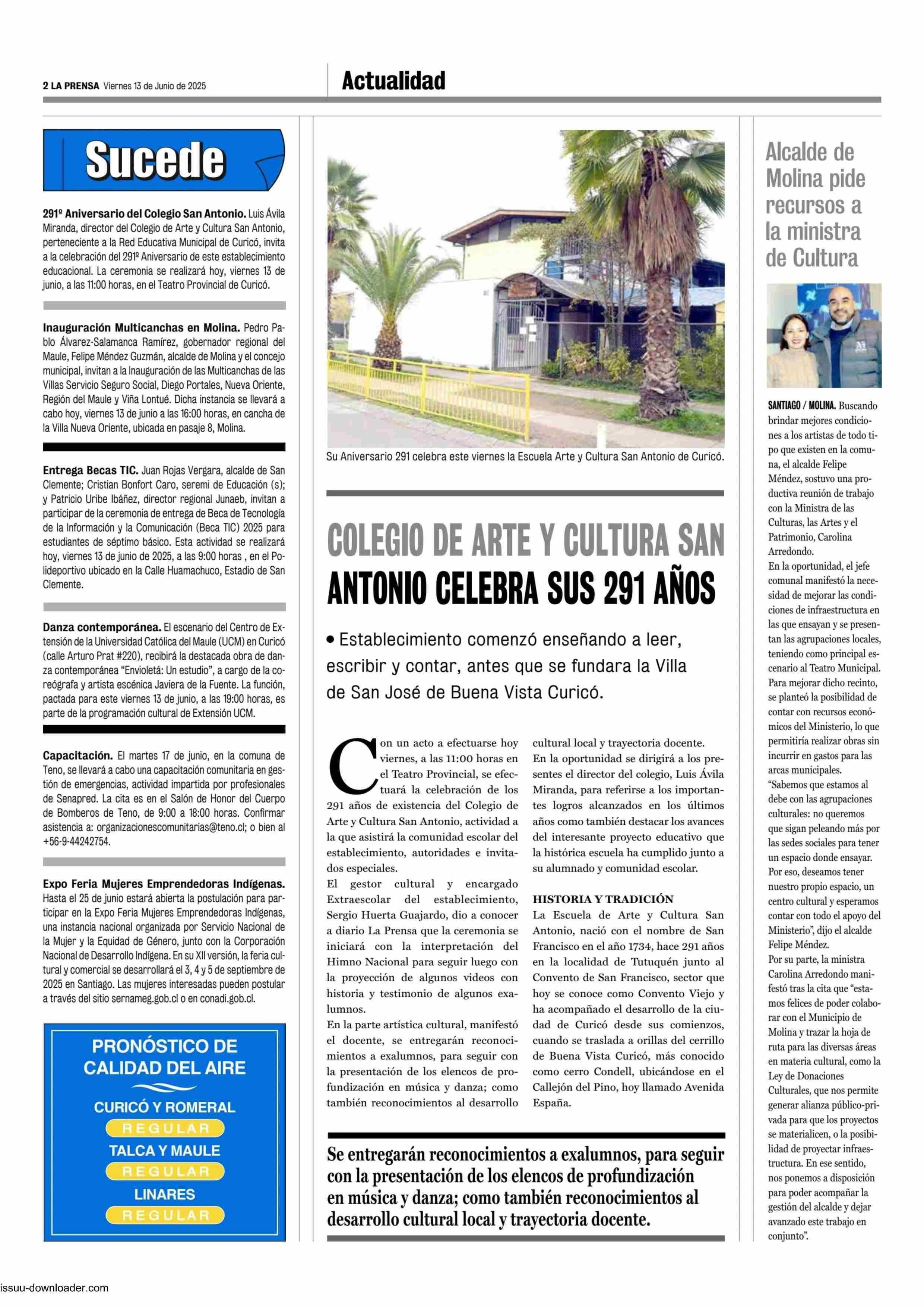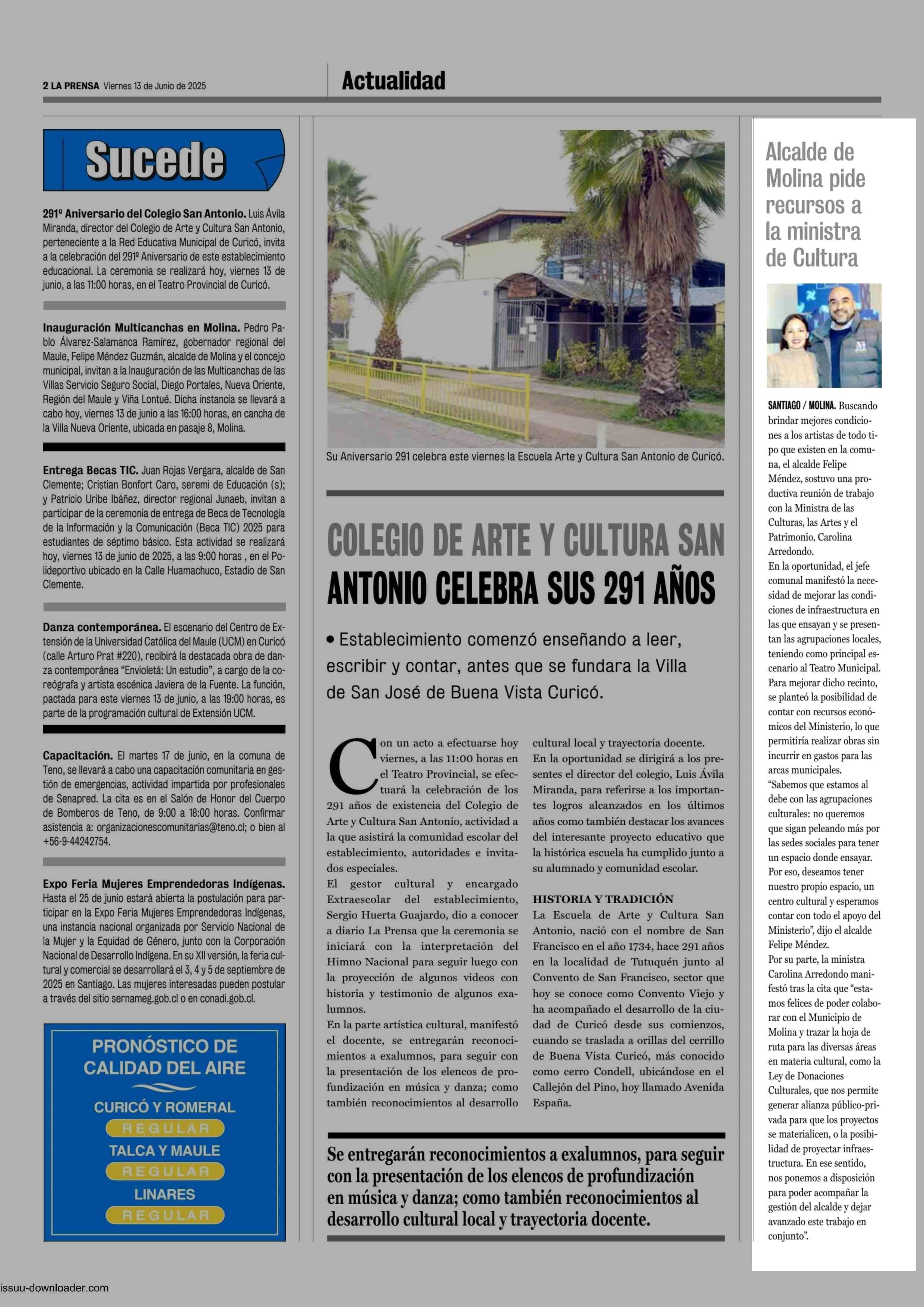 Alcalde de Molina pide recursos a la ministra de Cultura 13-06-2025 La Prensa de Curicó |