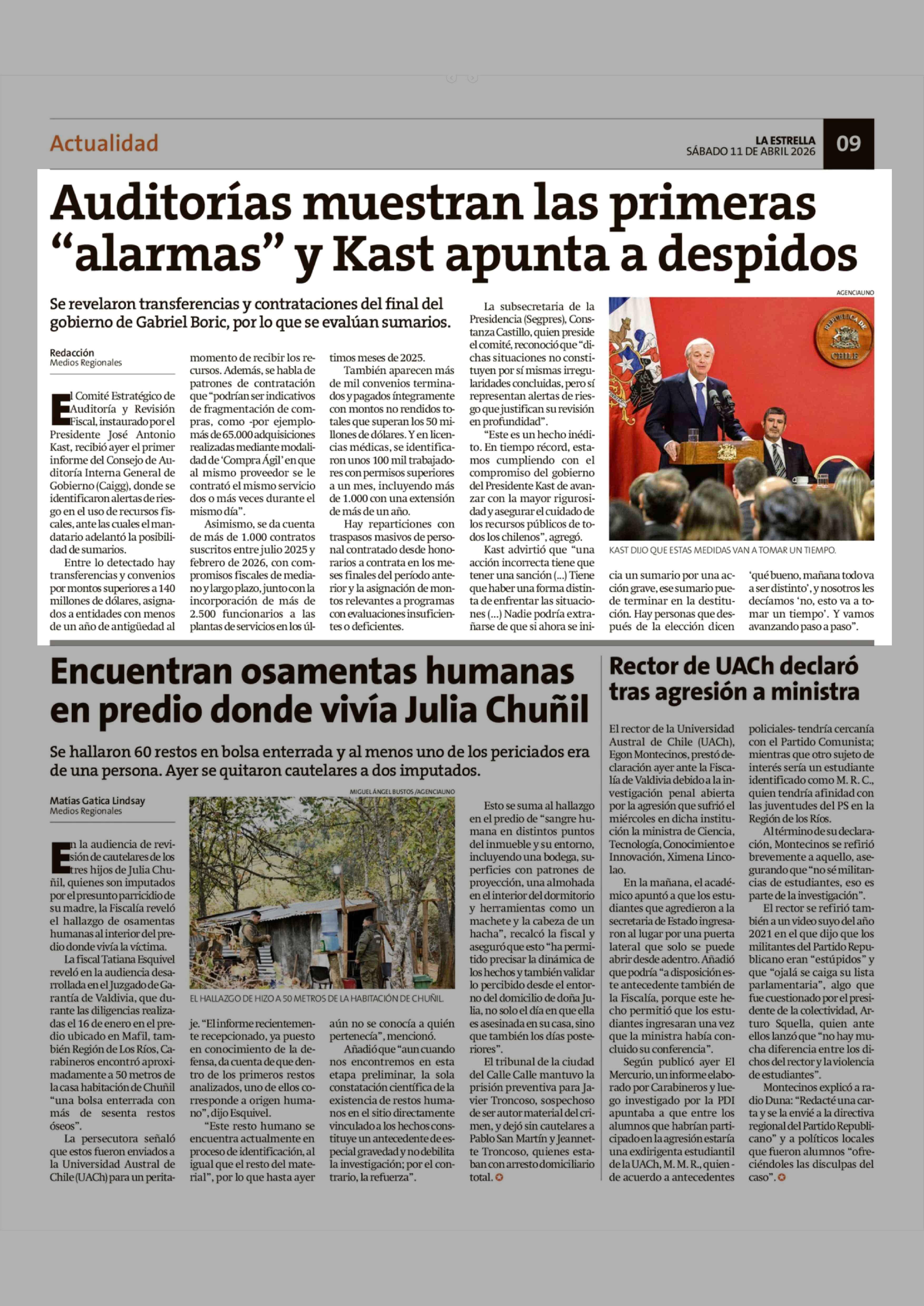 Auditorías muestran las primeras "alarmas" y Kast apunta a despidos 11-04-2026 La Estrella de Chiloé |
