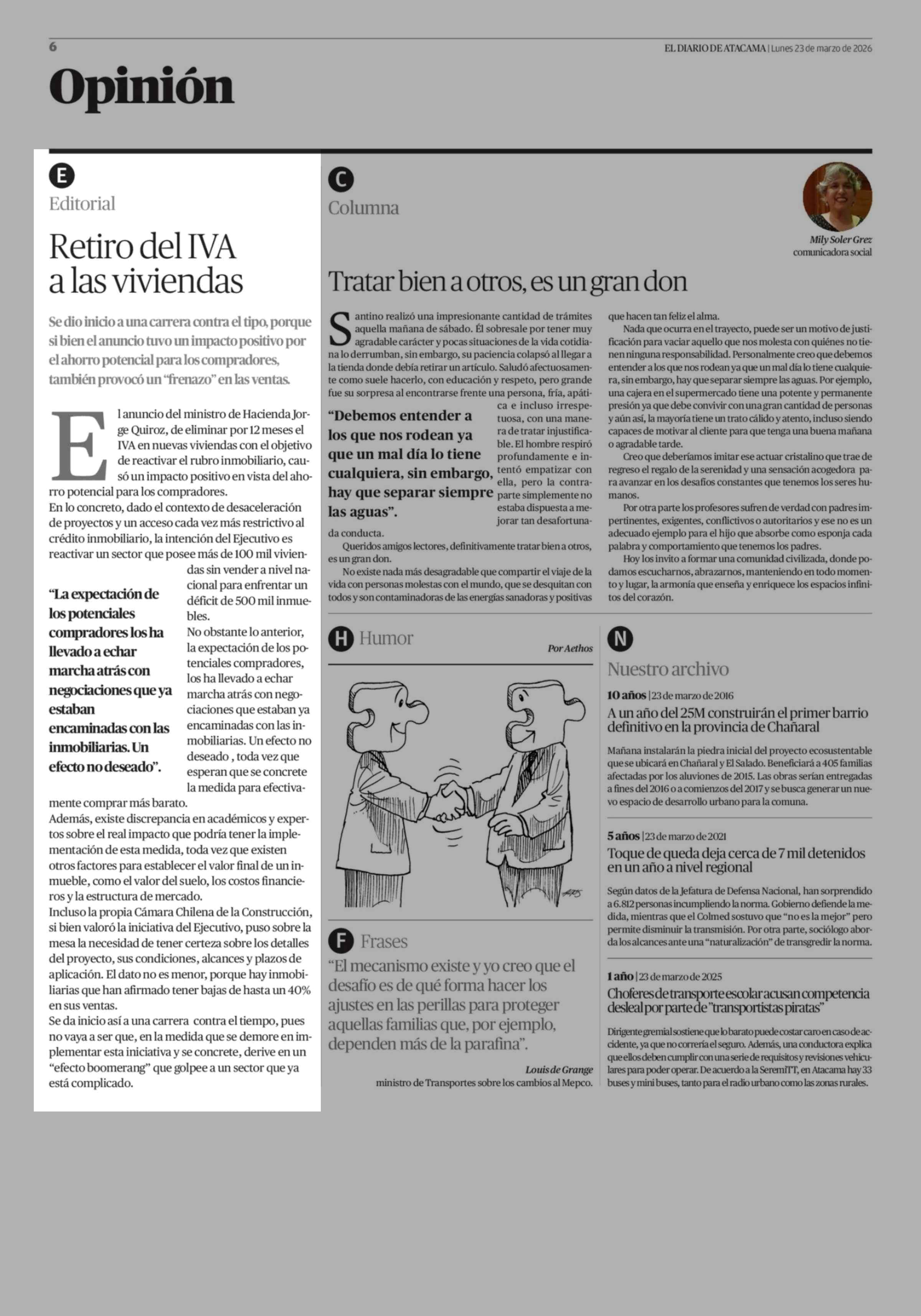 Editorial: Retiro del IVA a las viviendas 23-03-2026 El Diario de Atacama |