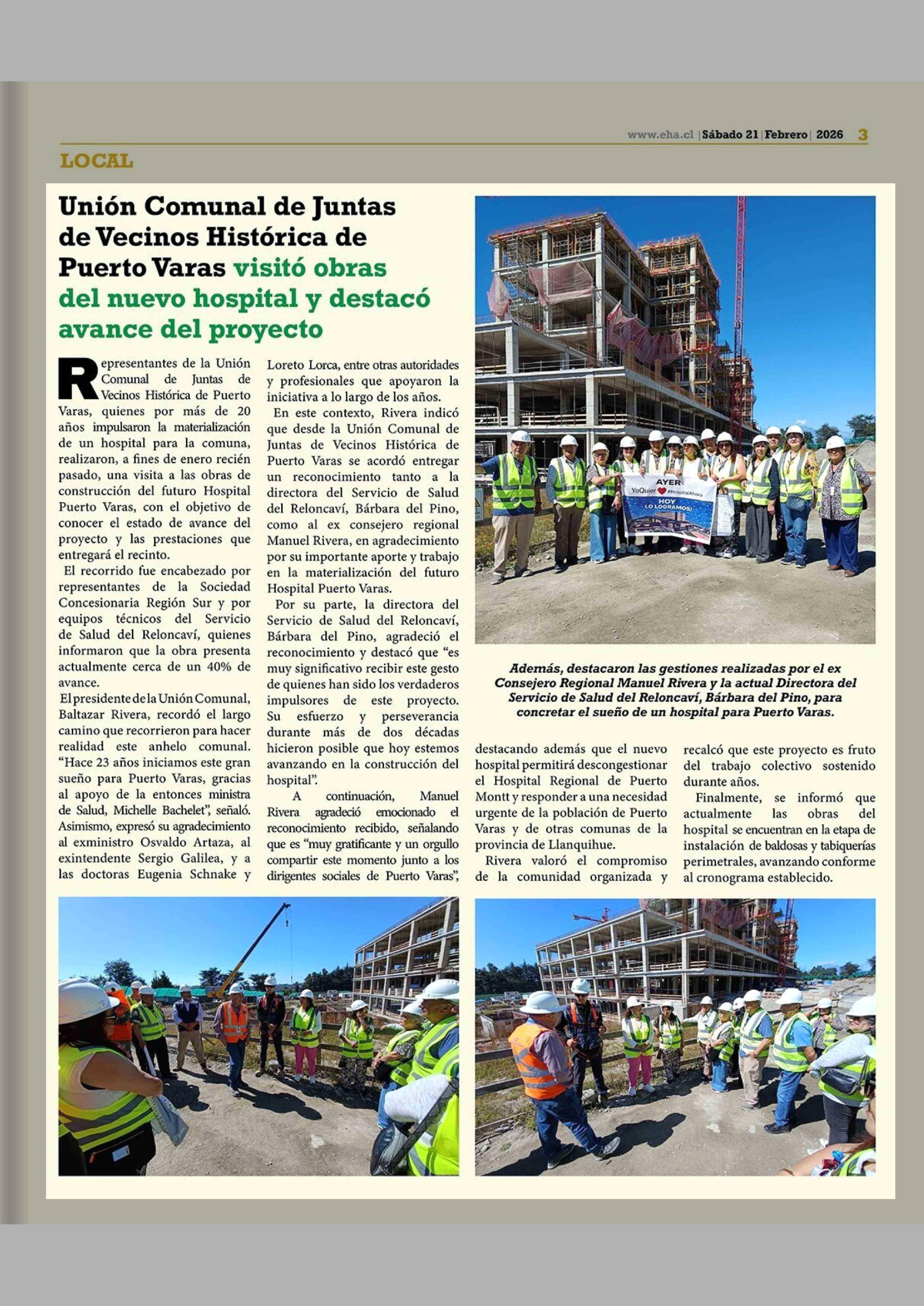 Unión Comunal de Juntas de Vecinos Histórica de Puerto Varas visitó obras del nuevo hospital y destacó avance del proyecto 21-02-2026 El Heraldo Austral |