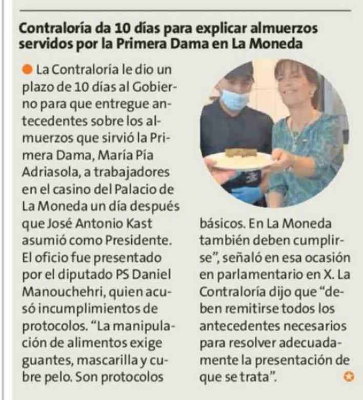 Contraloría da 10 días para explicar almuerzos servidos por la Primera Dama en La Moneda 08-04-2026 La Estrella de Iquique |