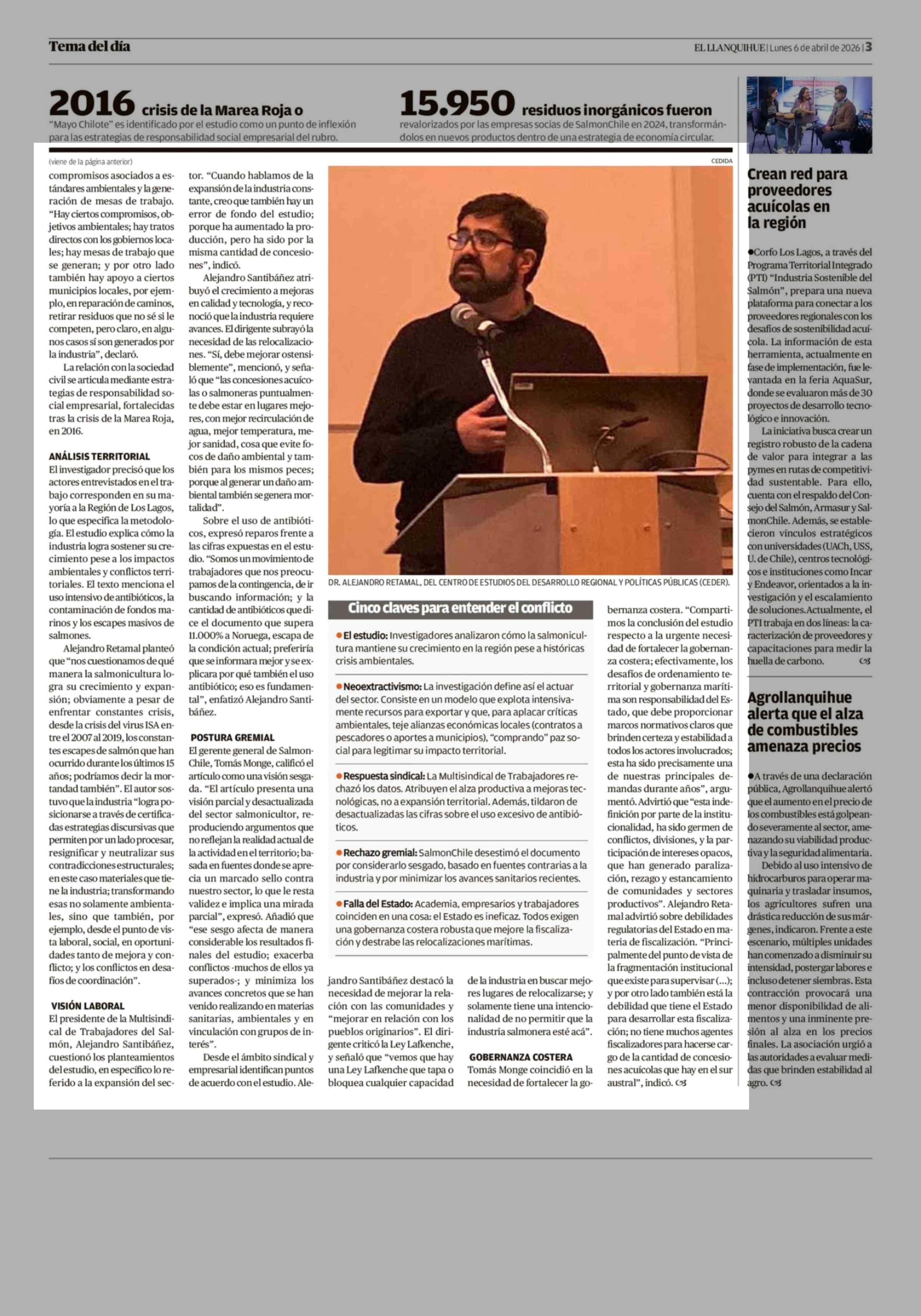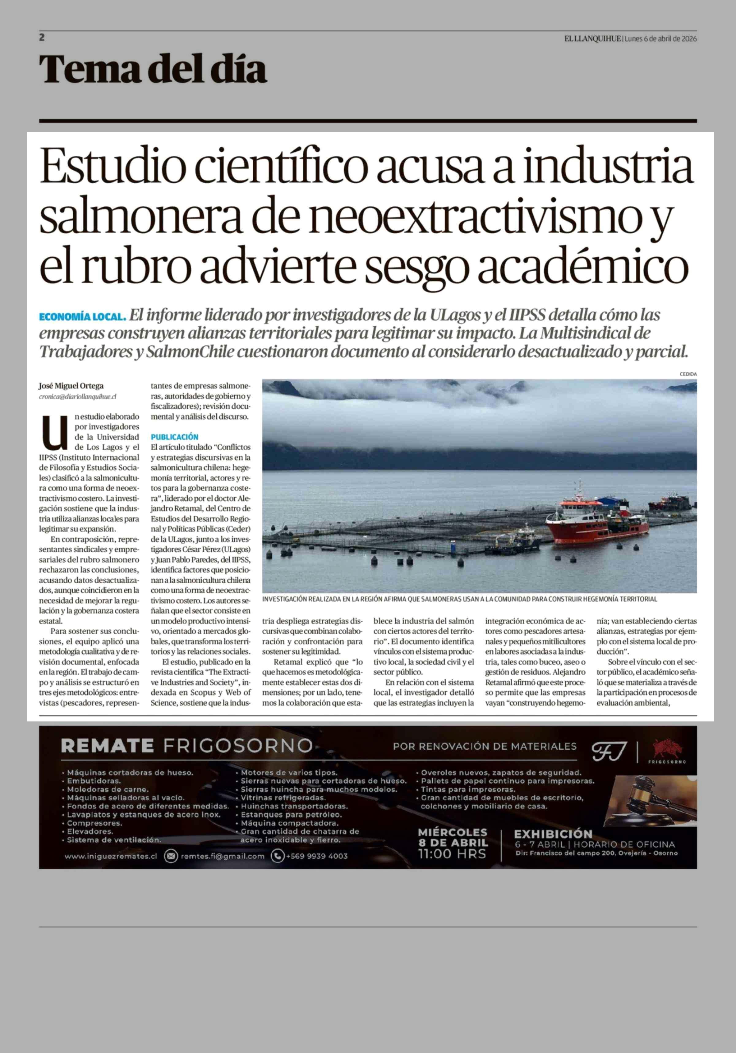 Estudio científico acusa a industria salmonera de neoextractivismo y el rubro advierte sesgo académico 06-04-2026 El Llanquihue |