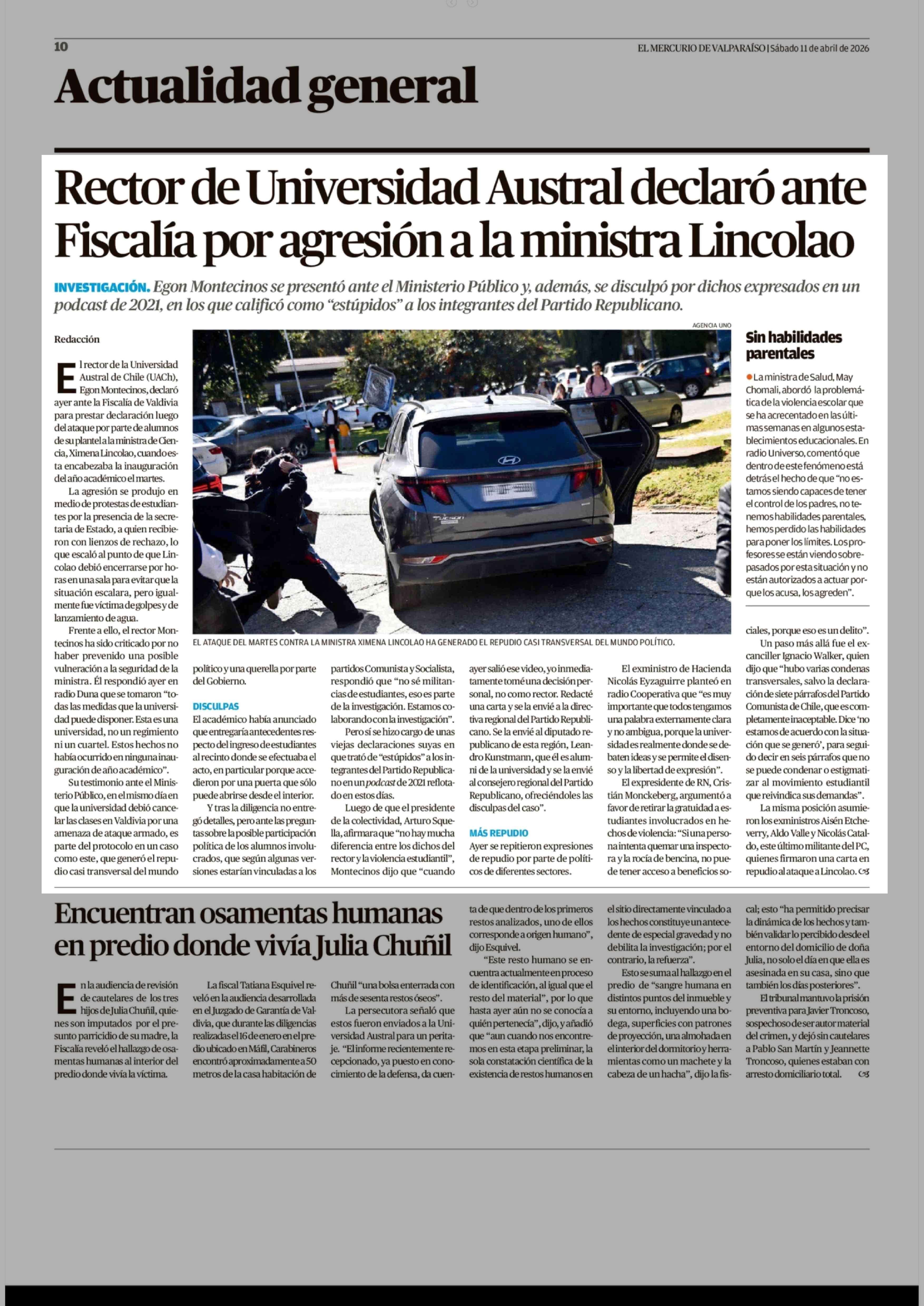 Rector de Universidad Austral declaró ante Fiscalía por agresión a la ministra Lincolao 11-04-2026 El Mercurio de Valparaíso |