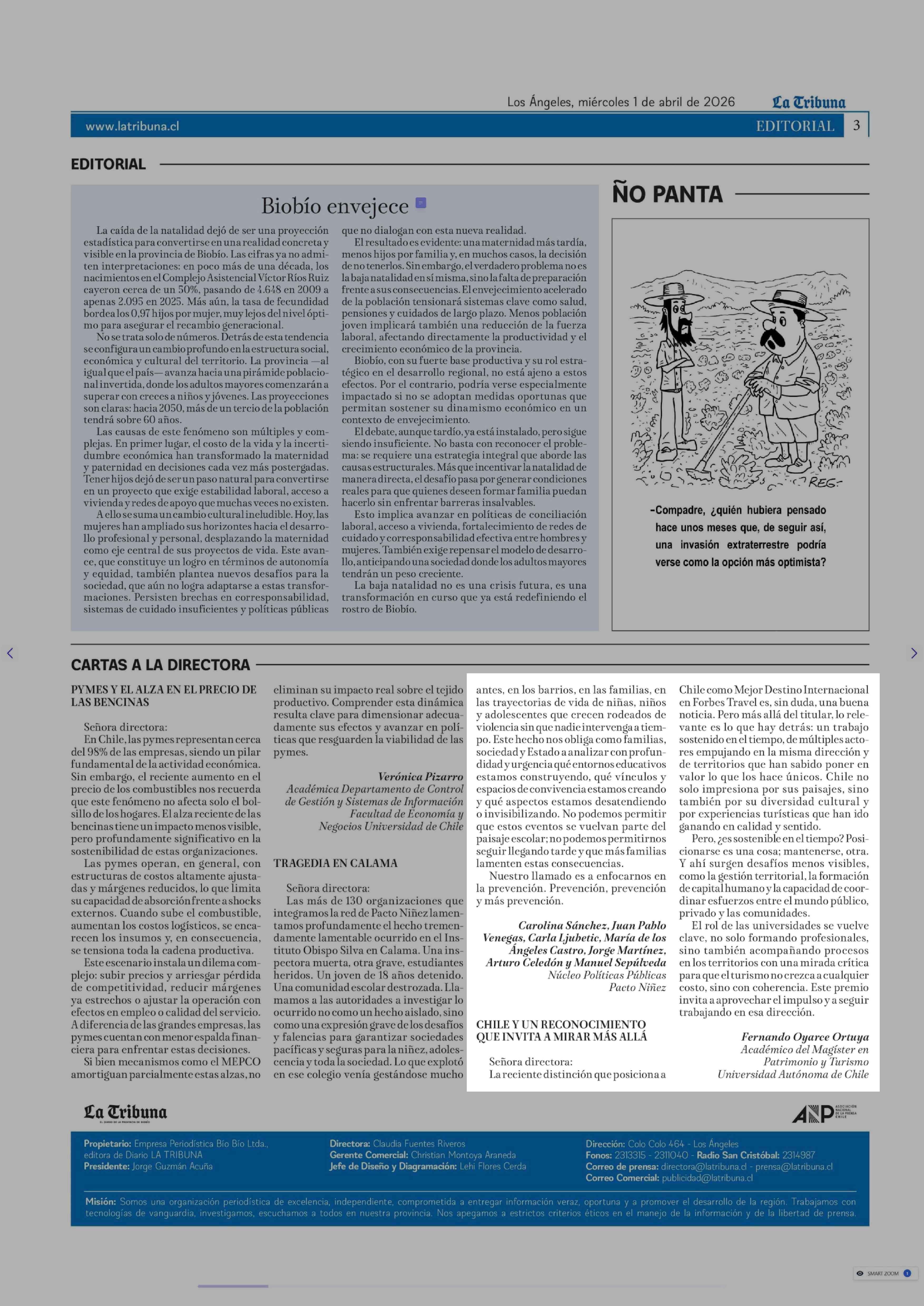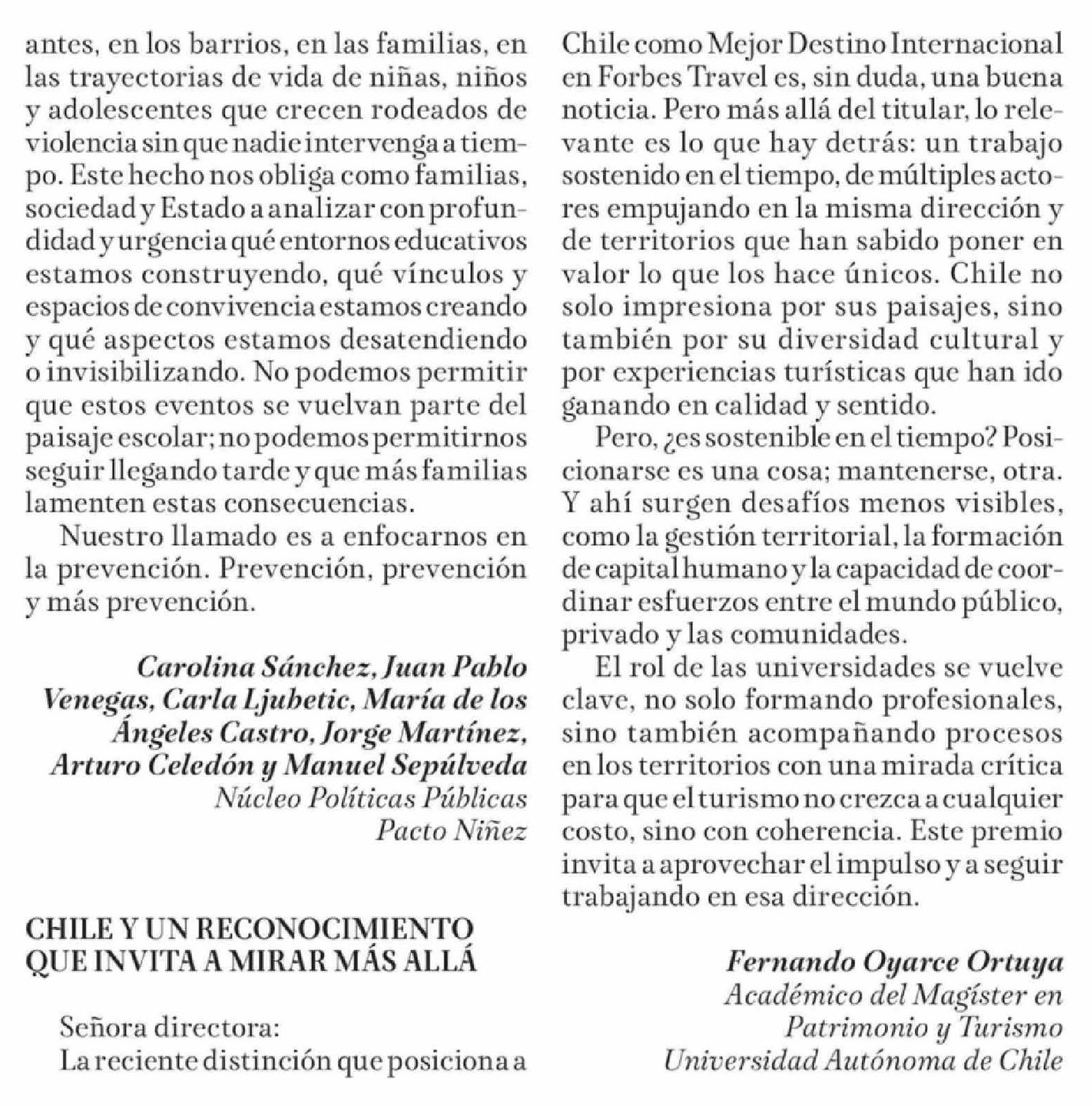Cartas: CHILE Y UN RECONOCIMIENTO QUE INVITA A MIRAR MÁS ALLÁ 01-04-2026 La Tribuna |