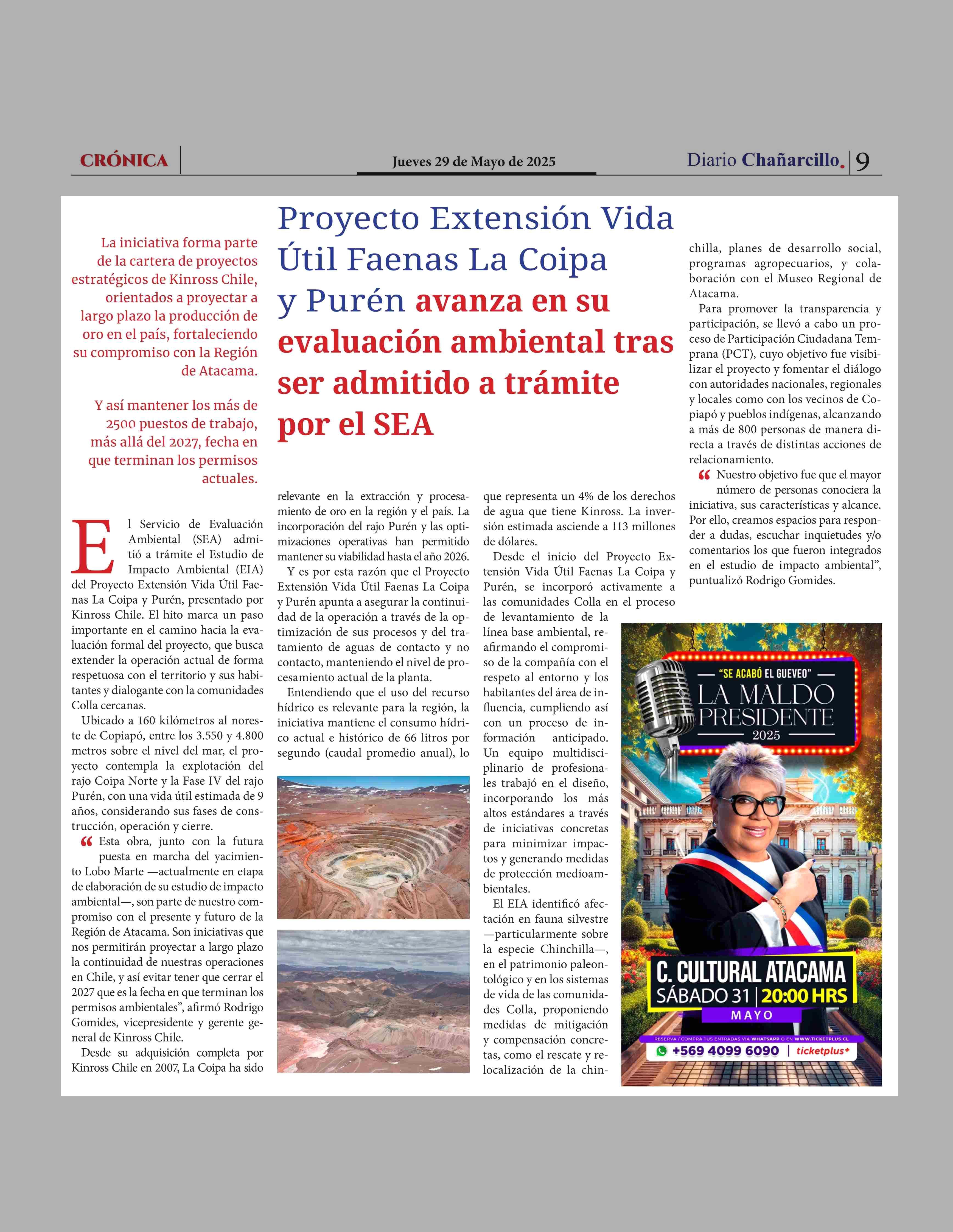 | Título: | El Servicio de Evaluación Ambiental (SEA) admitió a trámite el Estudio de Impacto Ambiental (EIA) del Proyecto Extensión Vida Útil Faenas La Coipa y Purén, presentado por Kinross Chile. El hito marca un paso importante en el camino hacia la evaluación formal del proyecto, que busca extender la opera |