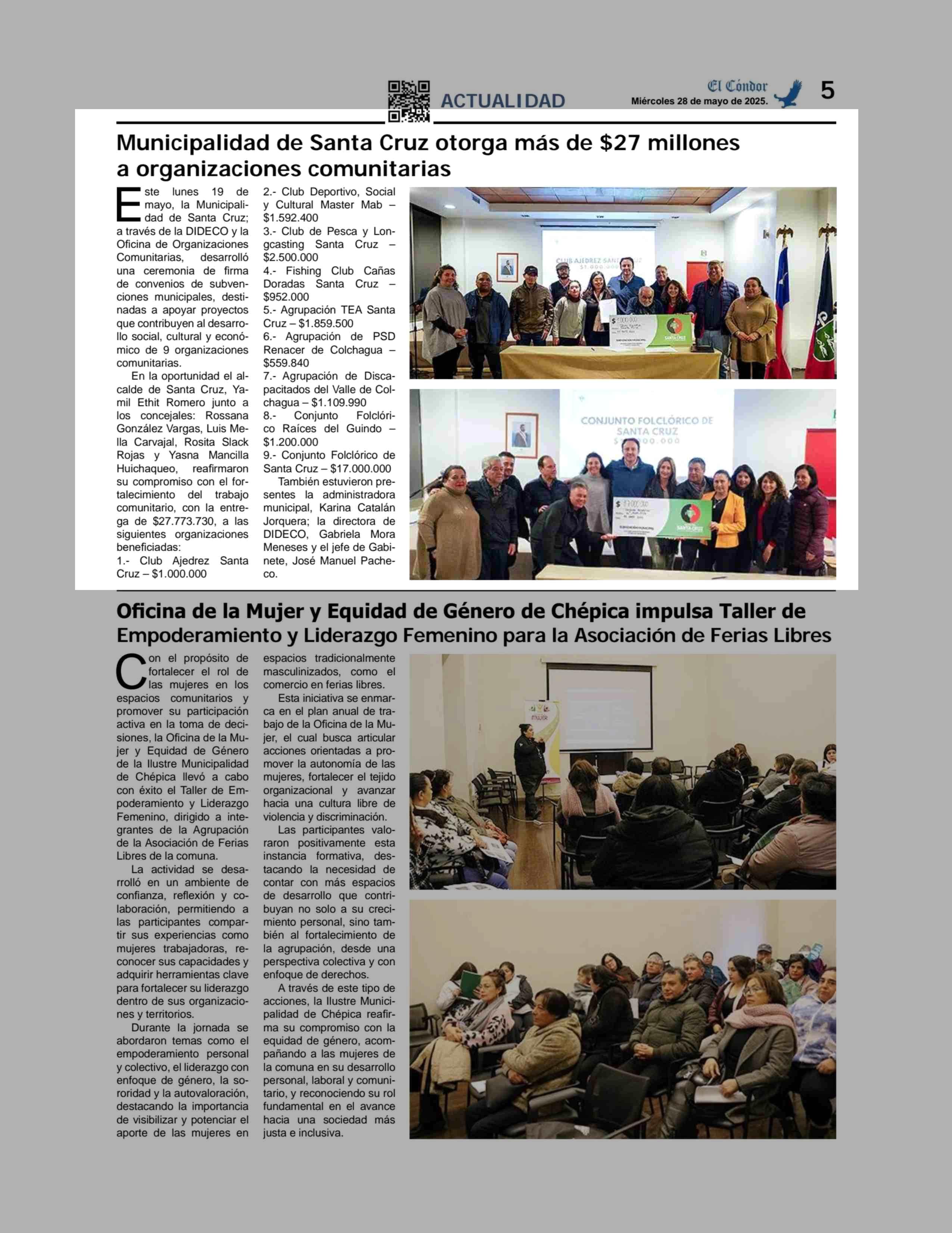 Municipalidad de Santa Cruz otorga más de $27 millones a organizaciones comunitarias 28-05-2025 Diario El Cóndor |