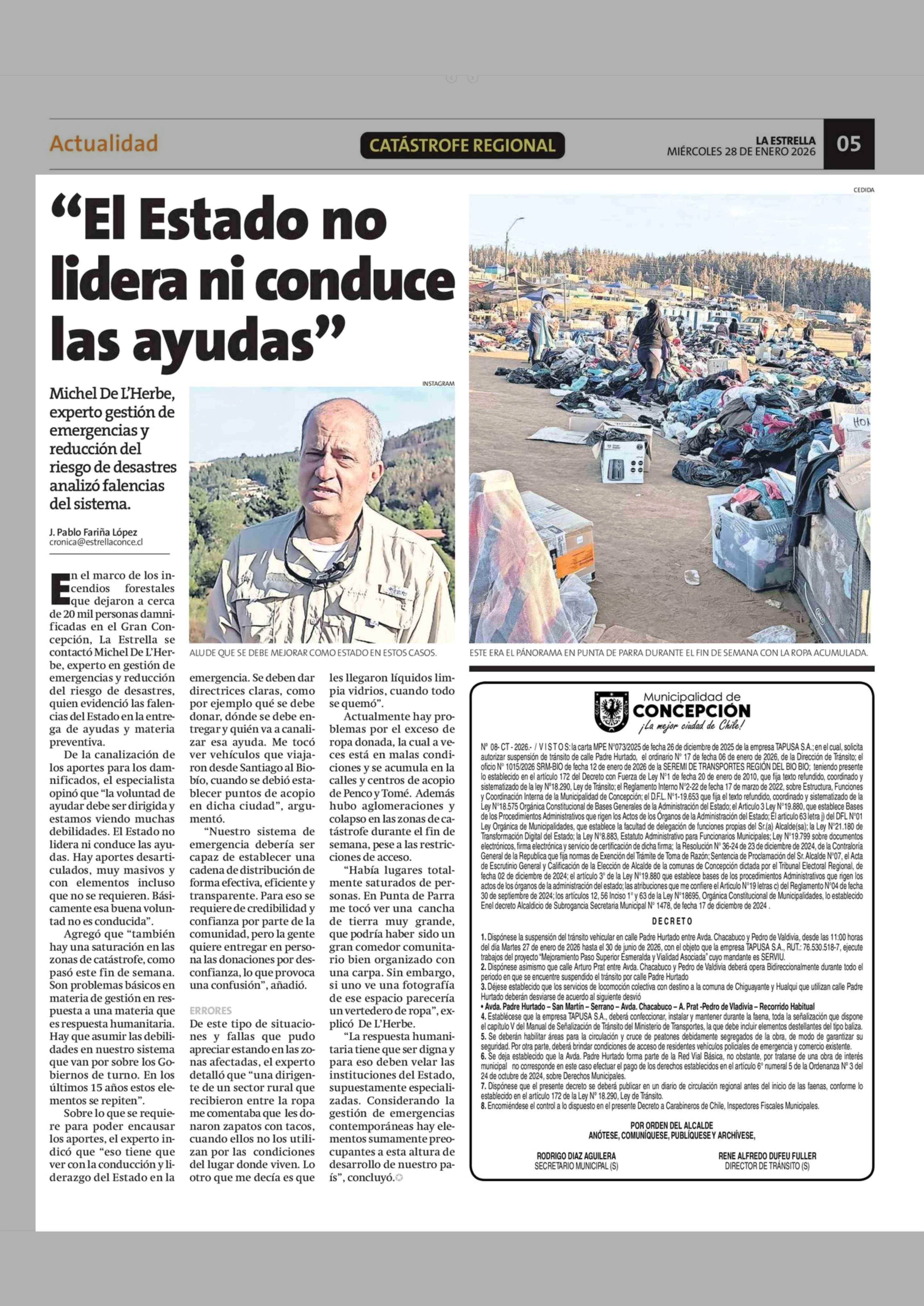 “El Estado no lidera ni conduce las ayudas” 28-01-2026 La Estrella de Concepción |