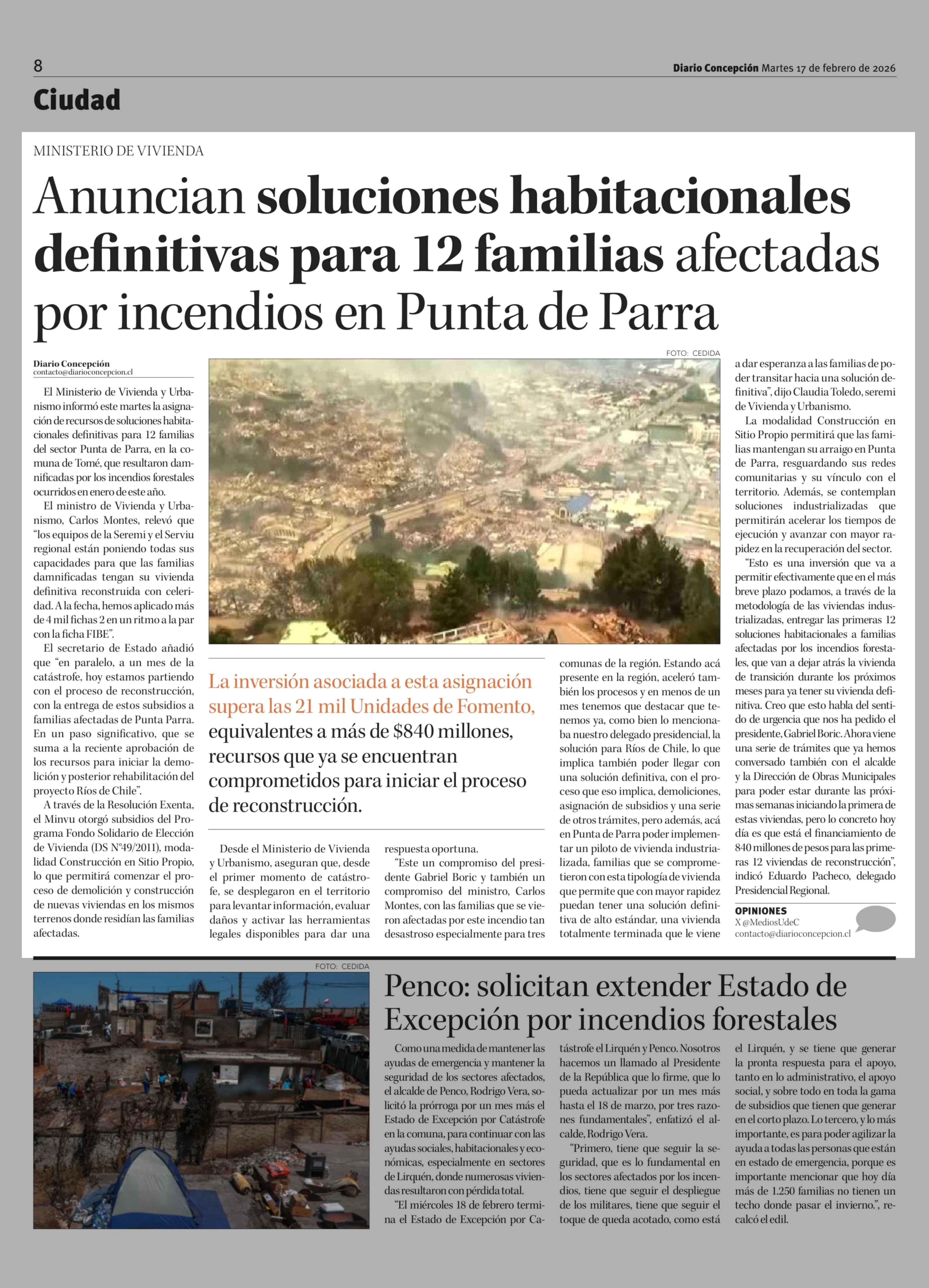 Anuncian soluciones habitacionales definitivas para 12 familias afectadas por incendios en Punta de Parra 17-02-2026 Diario Concepción |