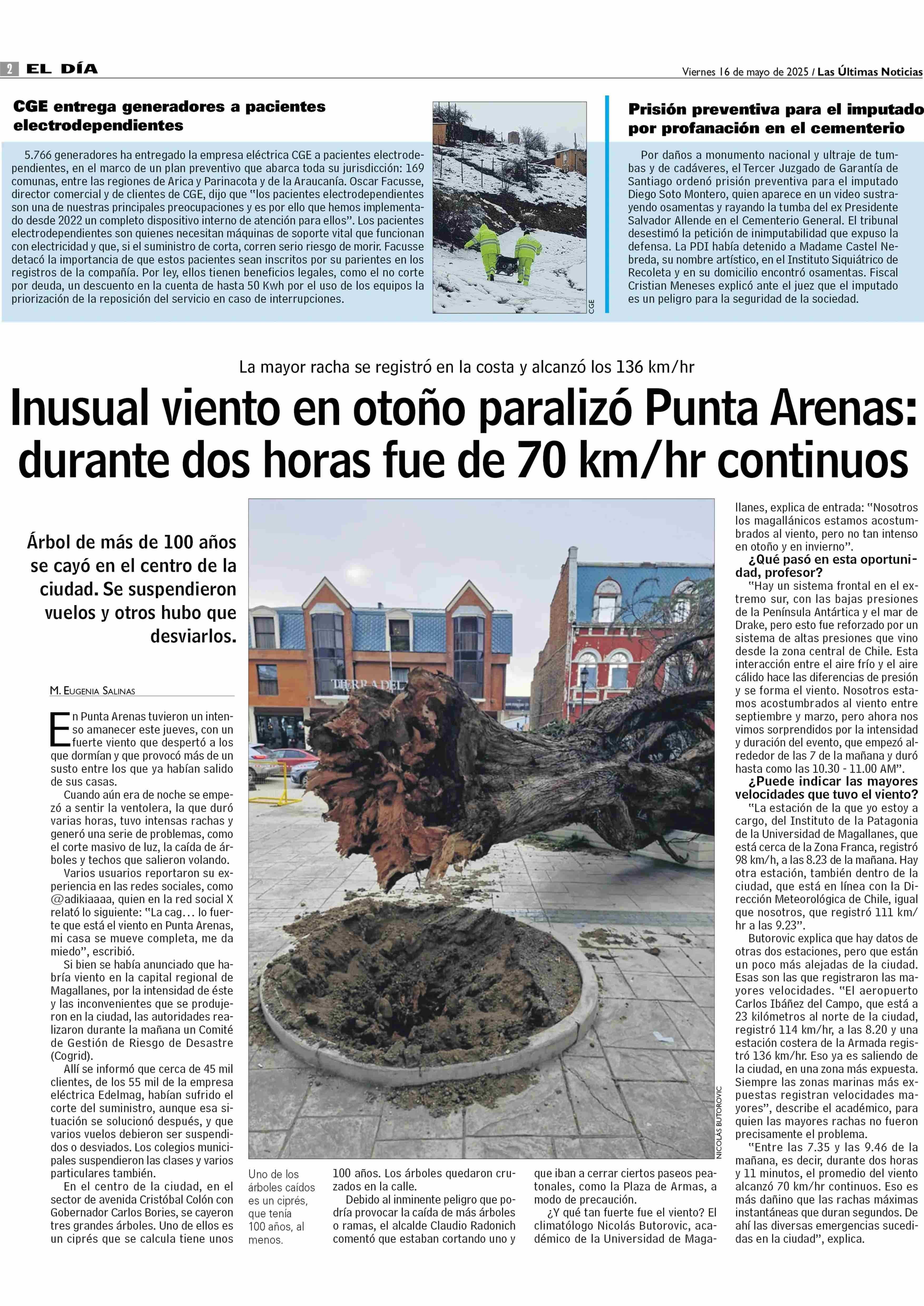 Inusual viento en otoño paralizó Punta Arenas: durante dos horas fue de 70 km/hr continuos 16-05-2025 Las Últimas Noticias |