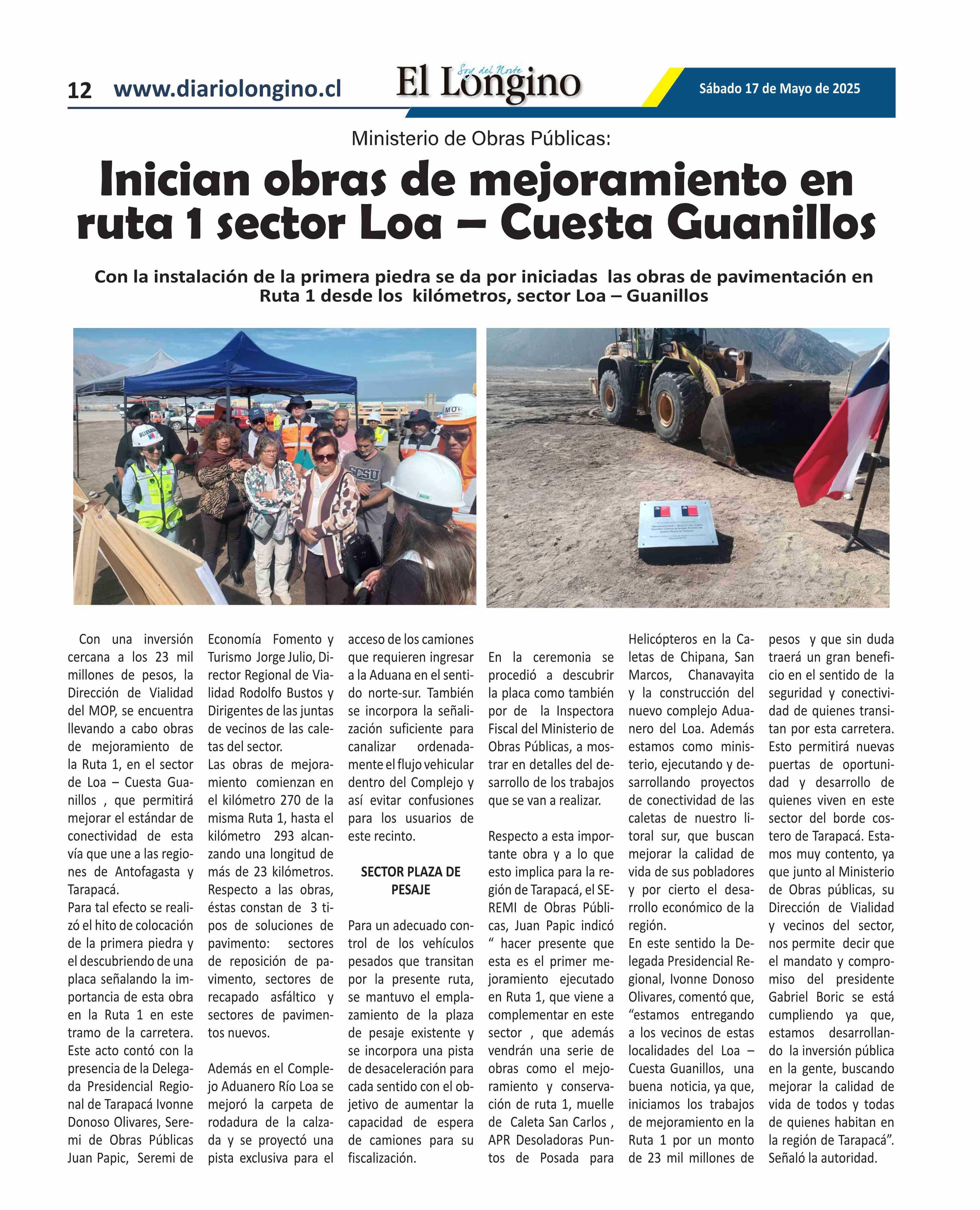 | Título: | Inician obras de mejoramiento en ruta 1 sector Loa – Cuesta Guanillos |
