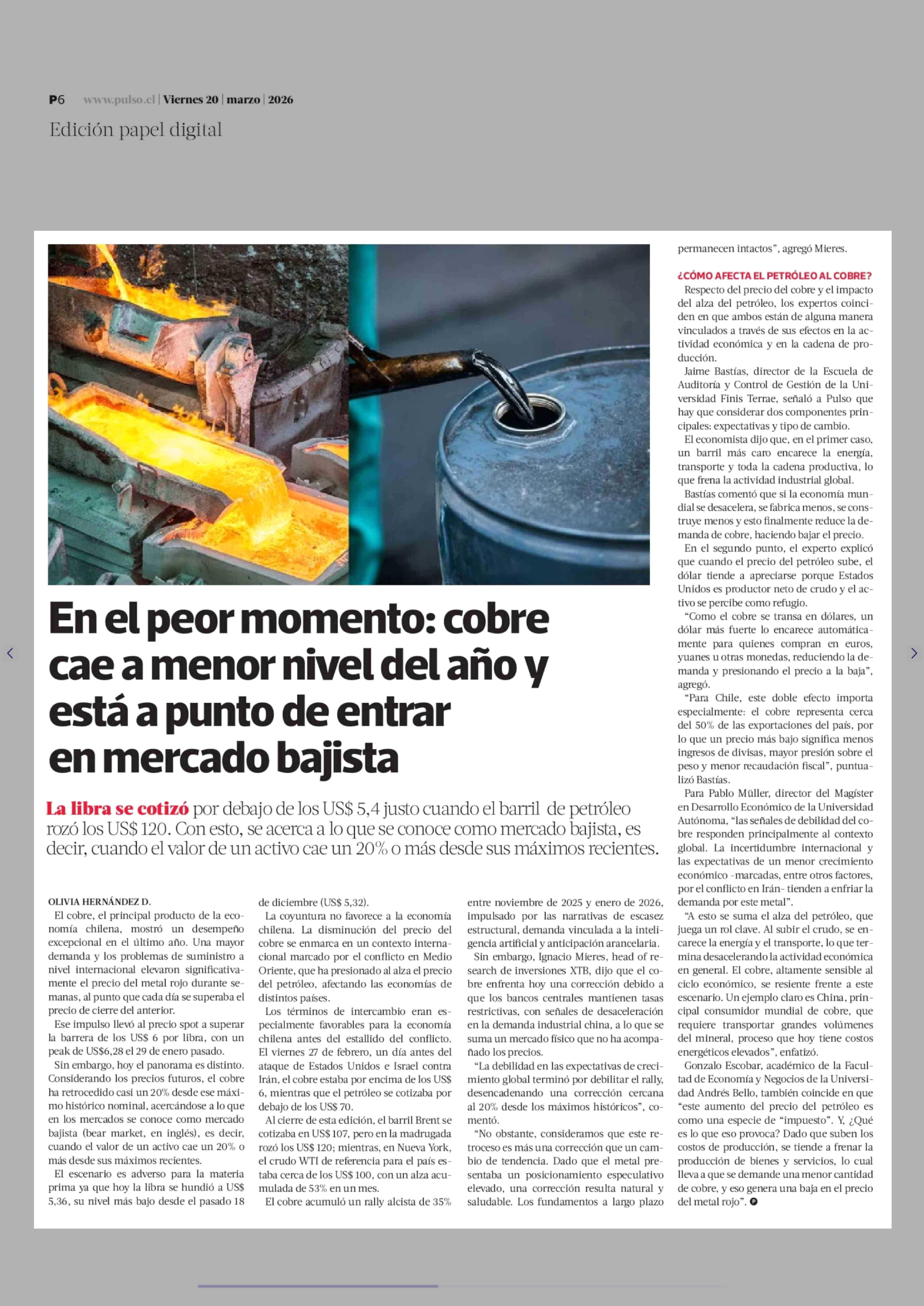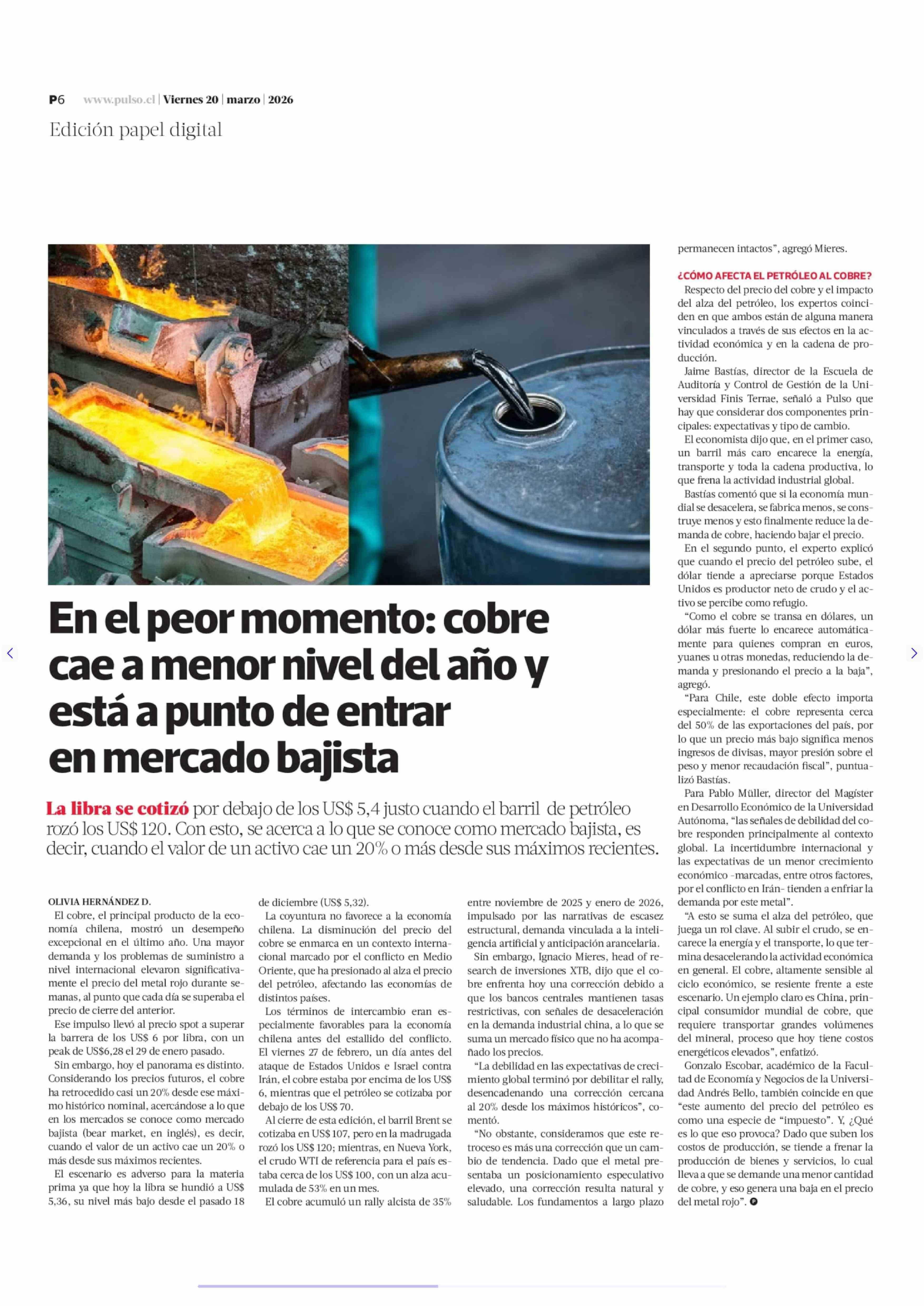En el peor momento: cobre cae a menor nivel del año y está a punto de entrar en mercado bajista 20-03-2026 La Tercera |