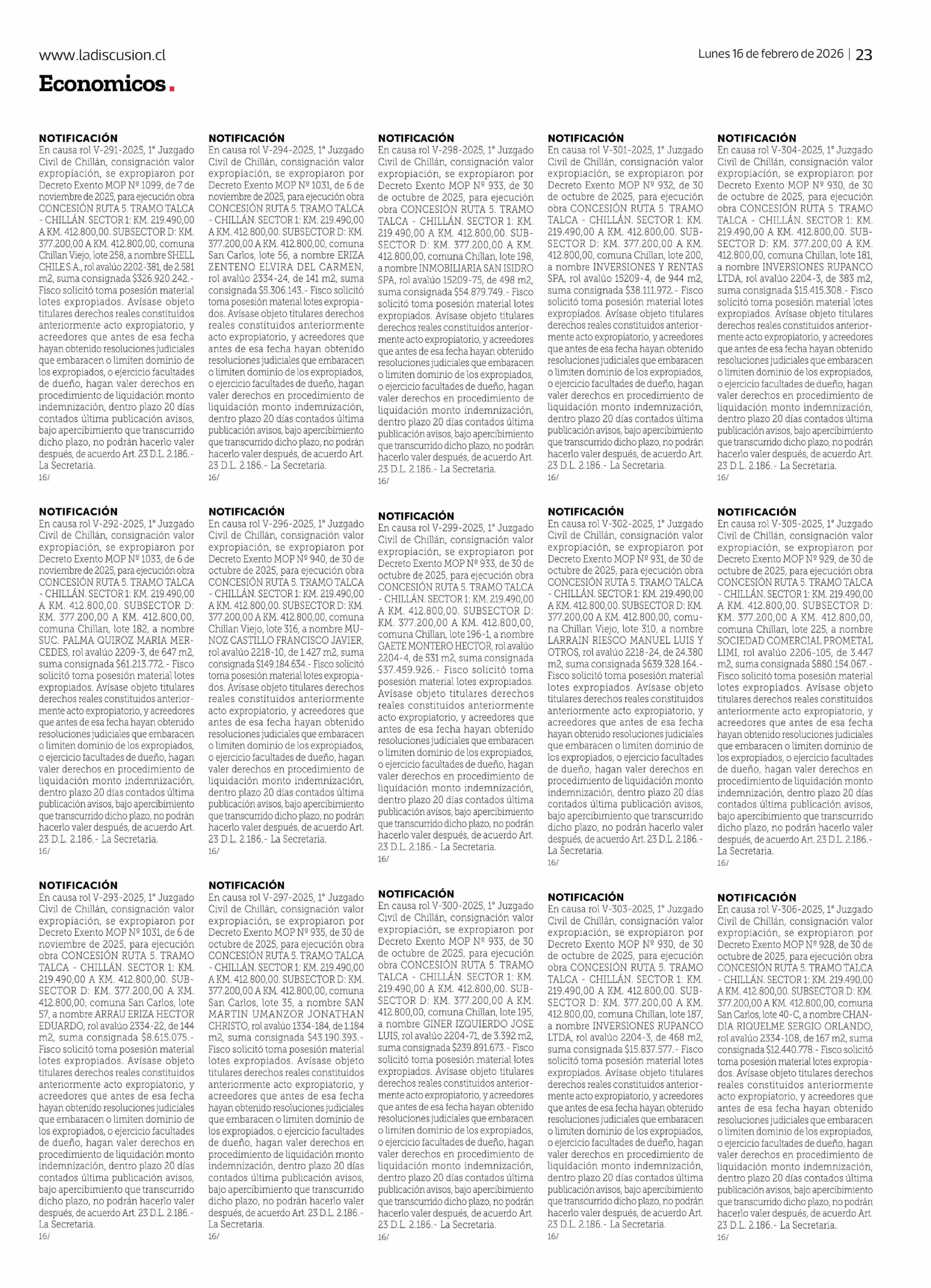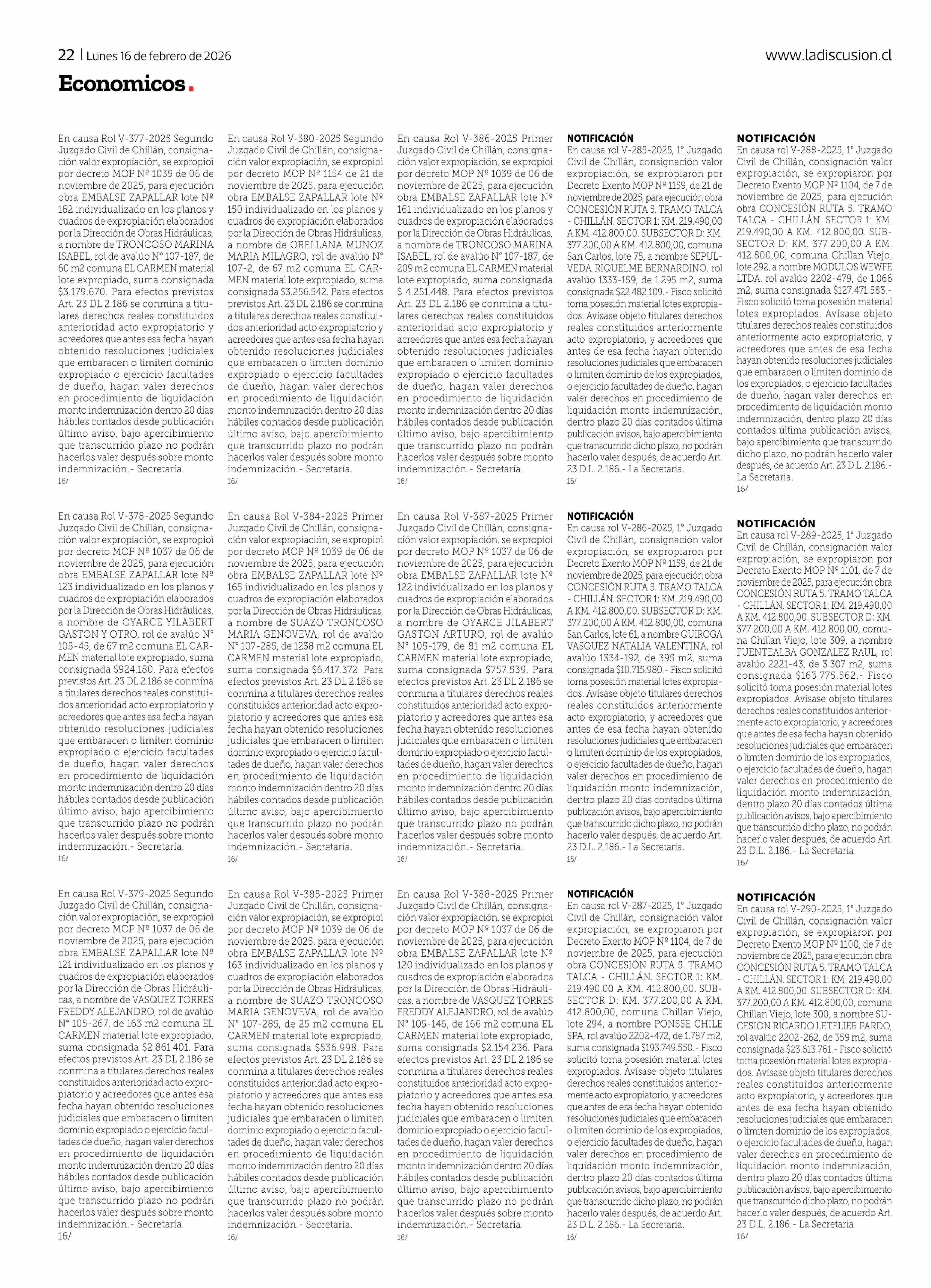 Título: En causa Rol V-377-2025 Segundo Juzgado Civil de Chillán, consignación valor expropiación, se expropioì por decreto MOP Nº 1039 de 06 de noviembre de 2025, para ejecución obra EMBALSE ZAPALLAR lote Nº 162 individualizado en los planos y cuadros de expropiación elaborados por la Dirección de Obras Hi