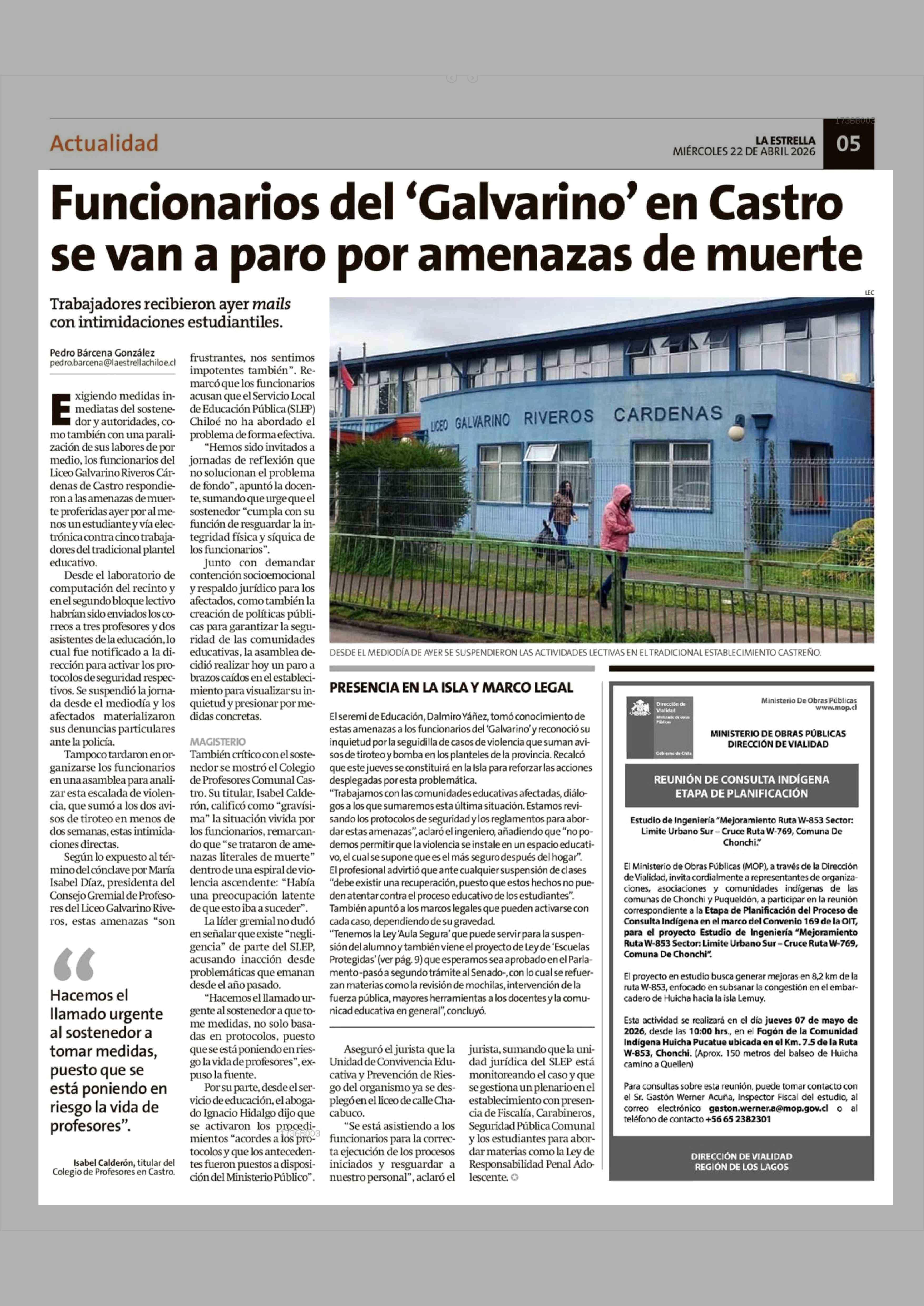 Funcionarios del 'Galvarino' en Castro se van a paro por amenazas de muerte 22-04-2026 La Estrella de Chiloé |