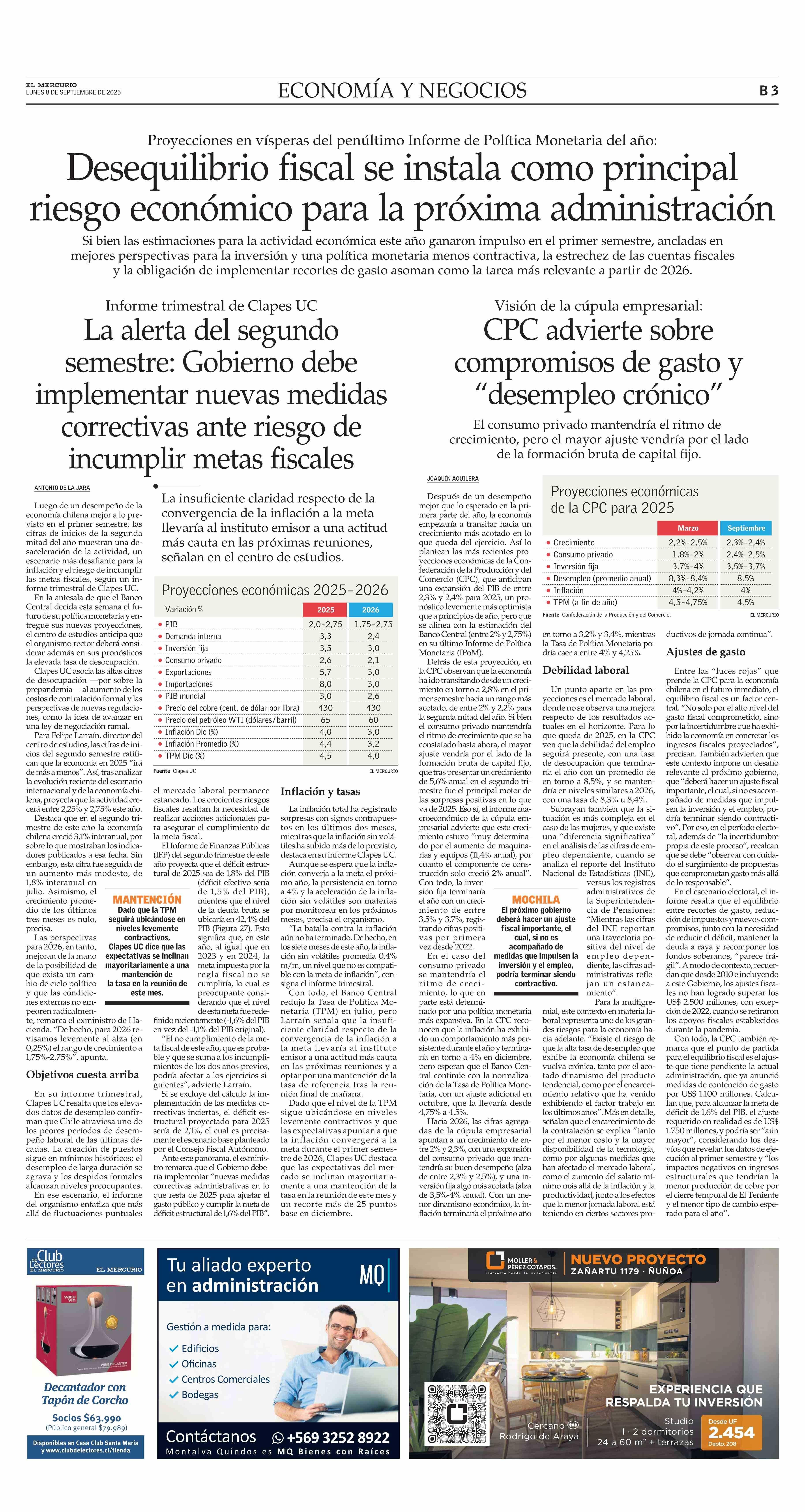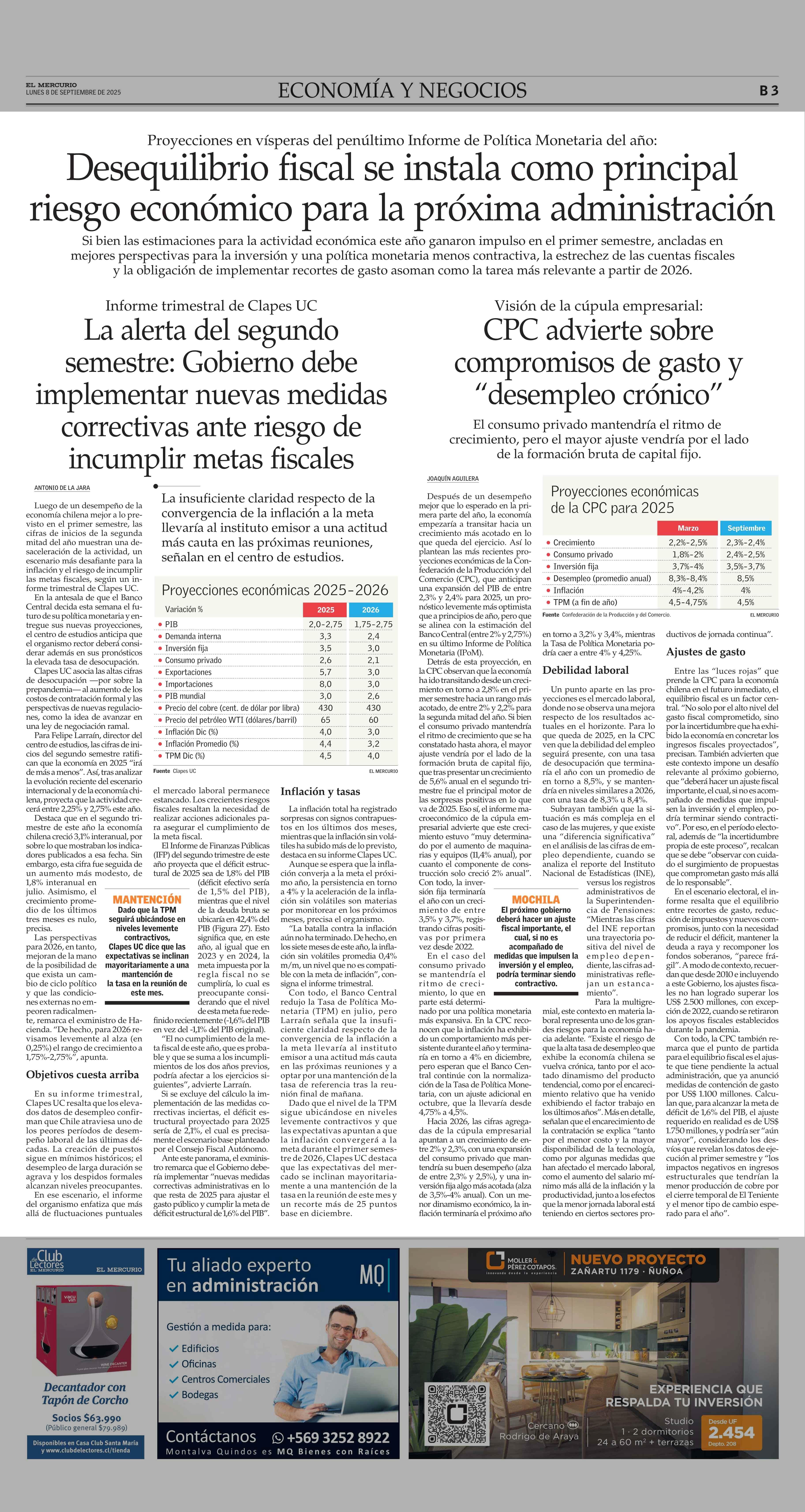 Desequilibrio fiscal se instala como principal riesgo económico para la próxima administración 08-09-2025 El Mercurio |