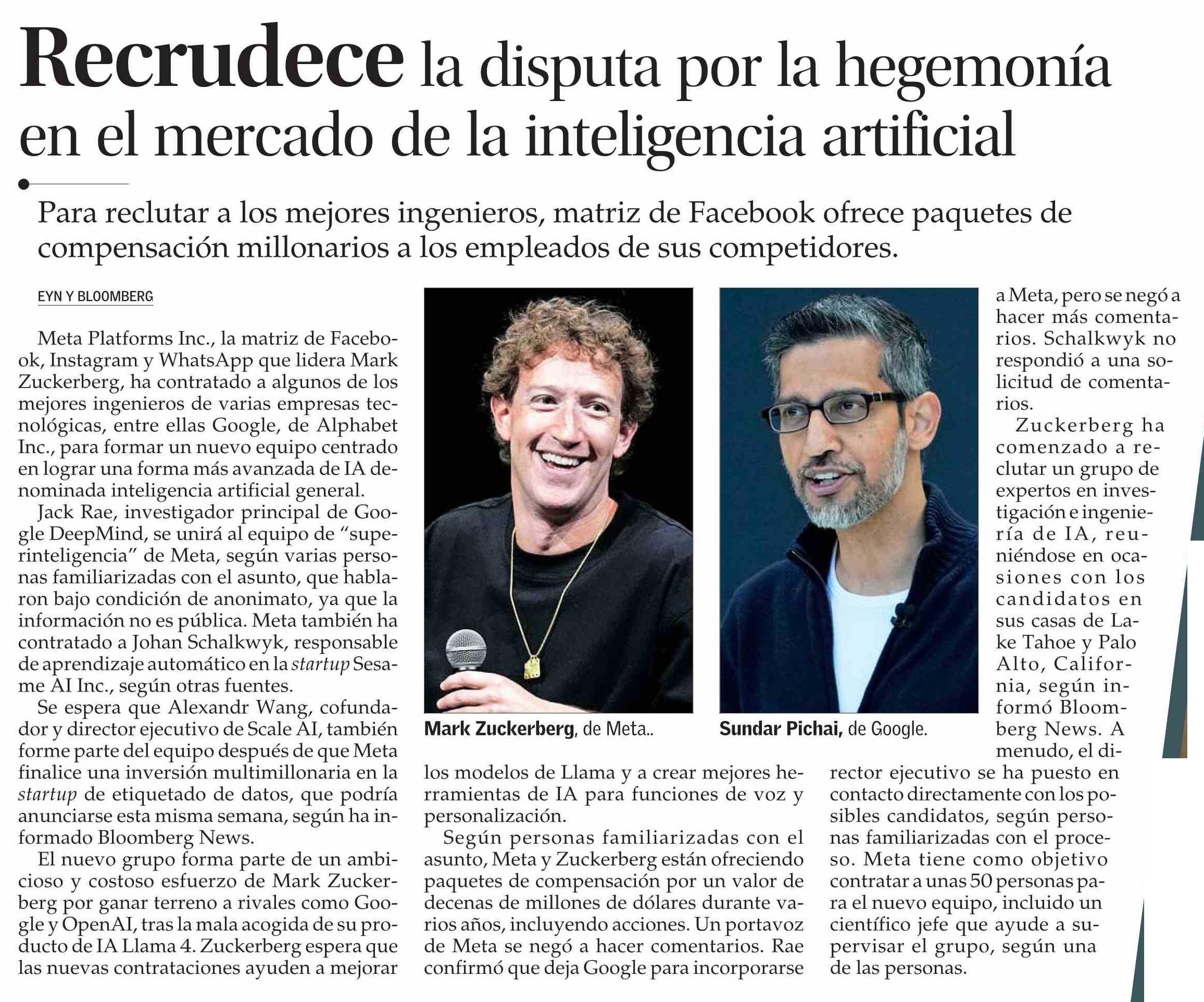 Recrudece la disputa por la hegemonía en el mercado de la inteligencia artificial 12-06-2025 El Mercurio |