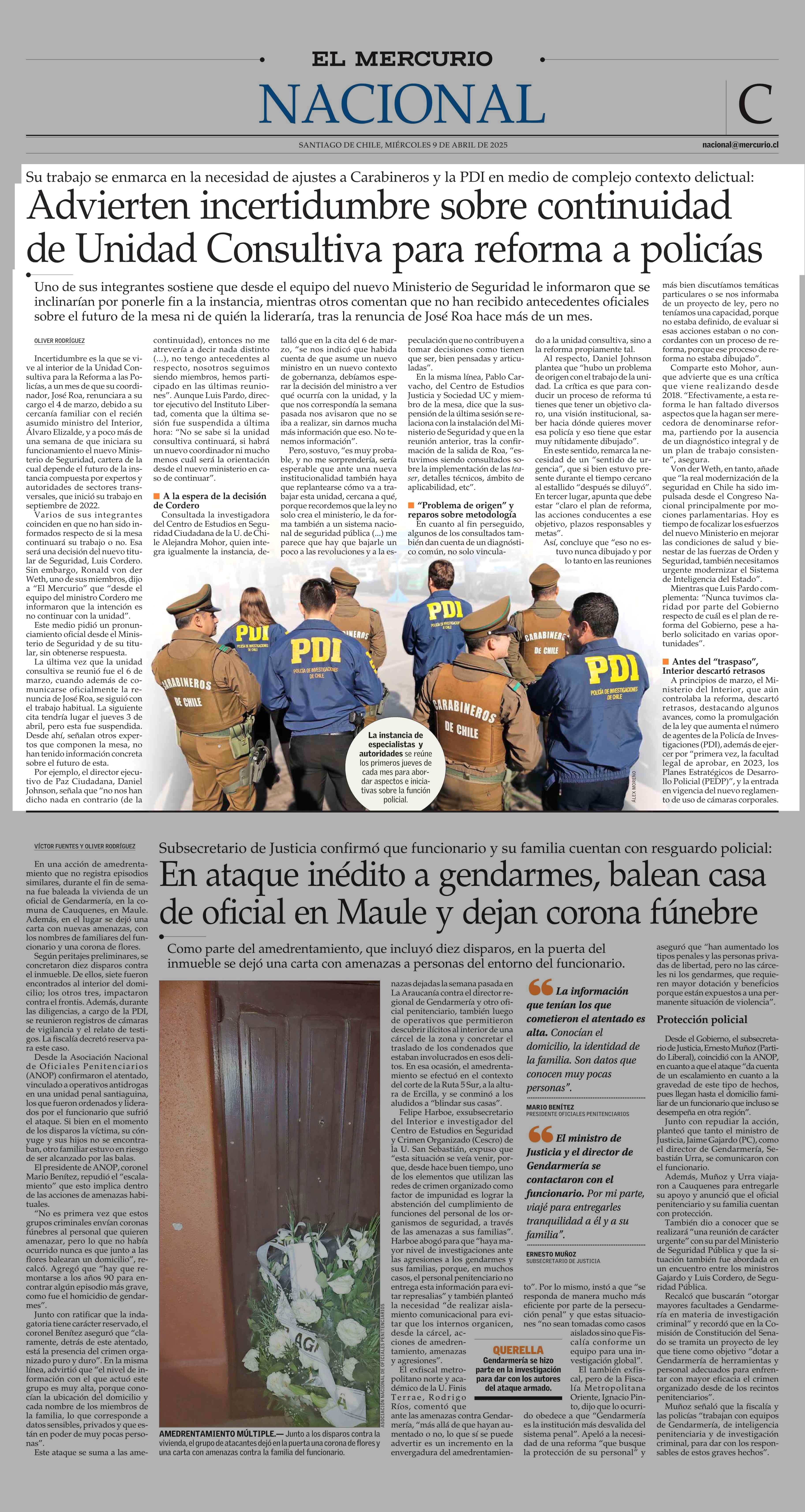 Advierten incertidumbre sobre continuidad de Unidad Consultiva para reforma a policías 09-04-2025 El Mercurio |