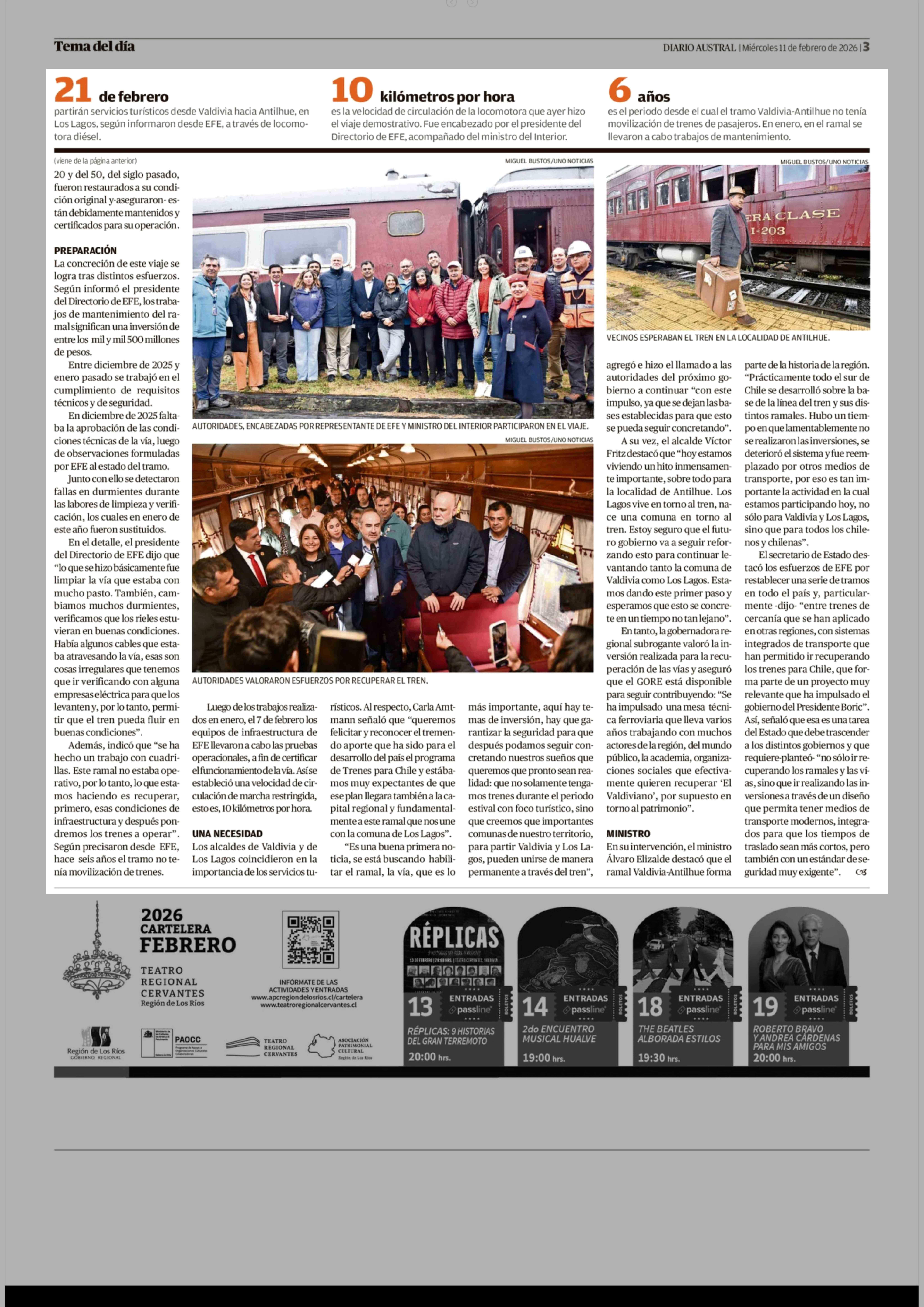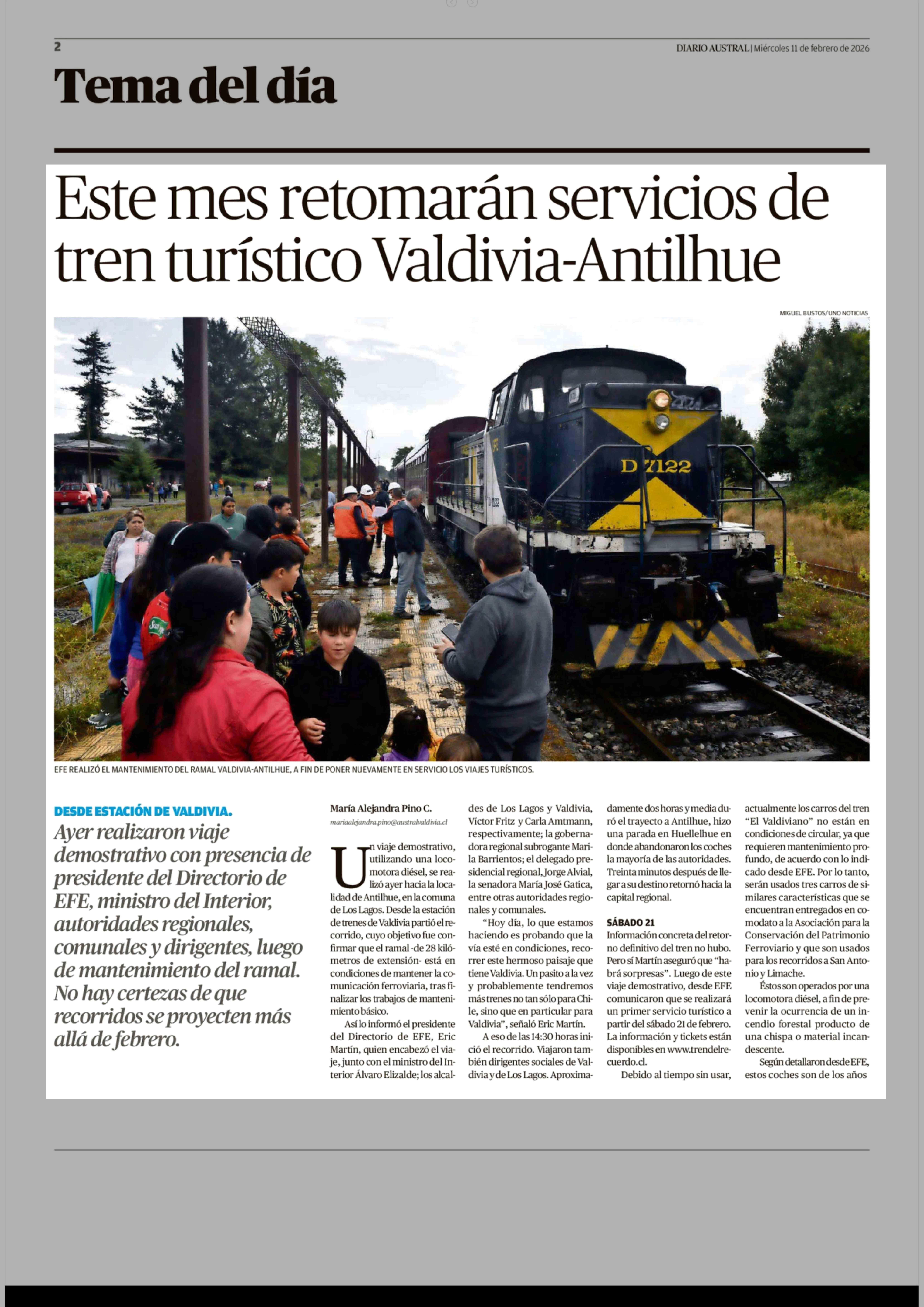 Este mes retomarán servicios de tren turístico Valdivia-Antilhue 11-02-2026 Diario Austral Región de Los Ríos |