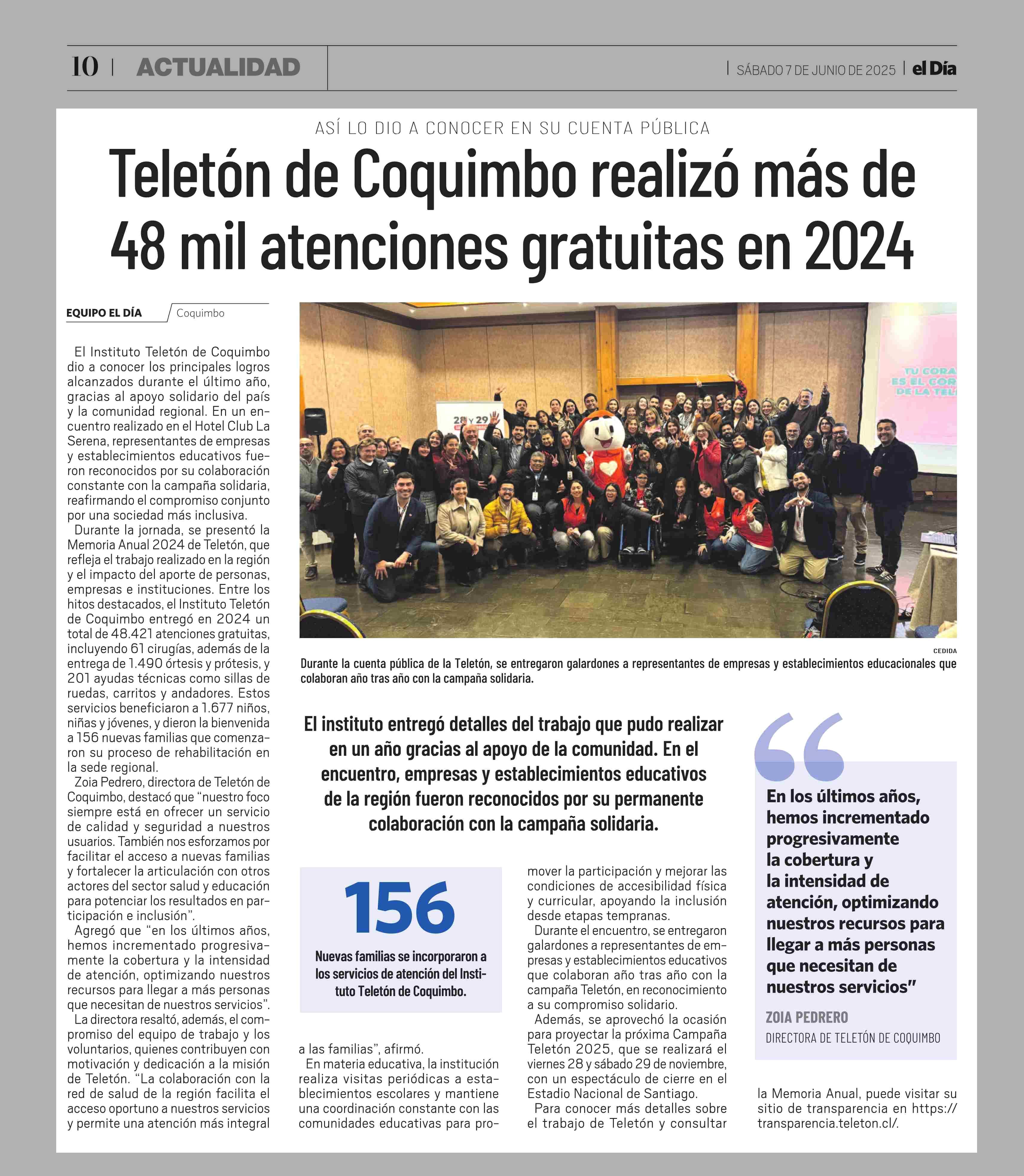 Teletón de Coquimbo realizó más de 48 mil atenciones gratuitas en 2024 07-06-2025 El Día |
