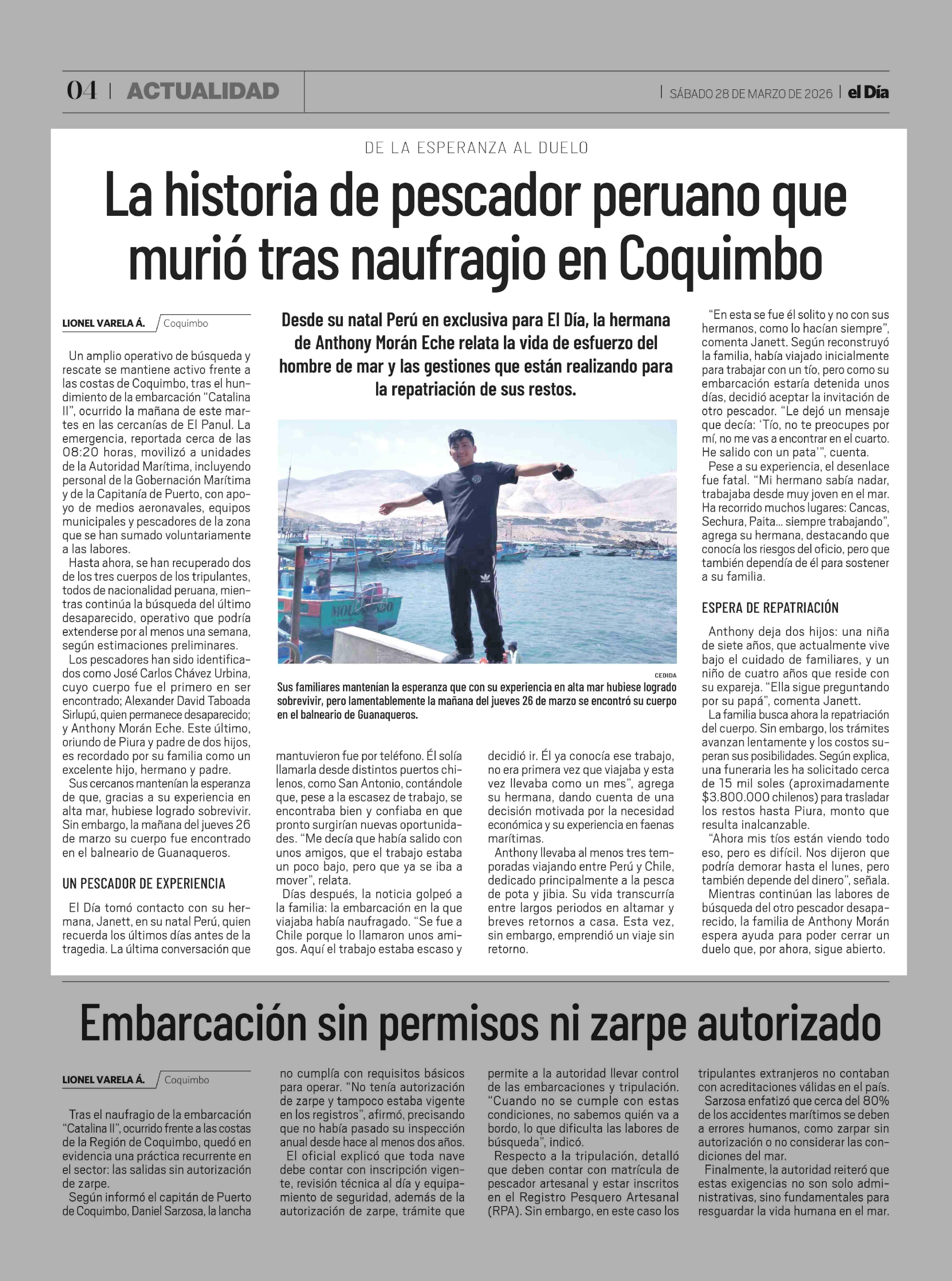 La historia de pescador peruano que murió tras naufragio en Coquimbo 28-03-2026 El Día |