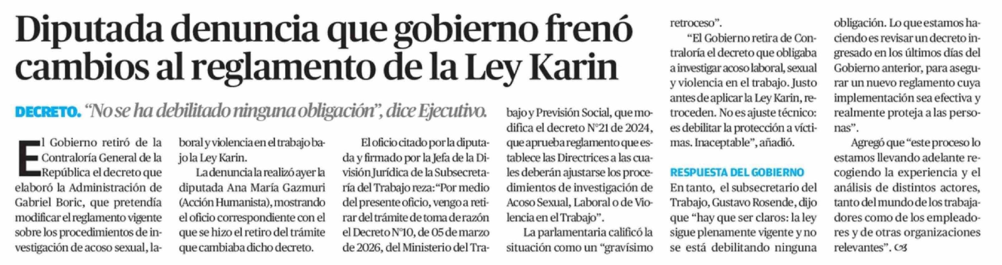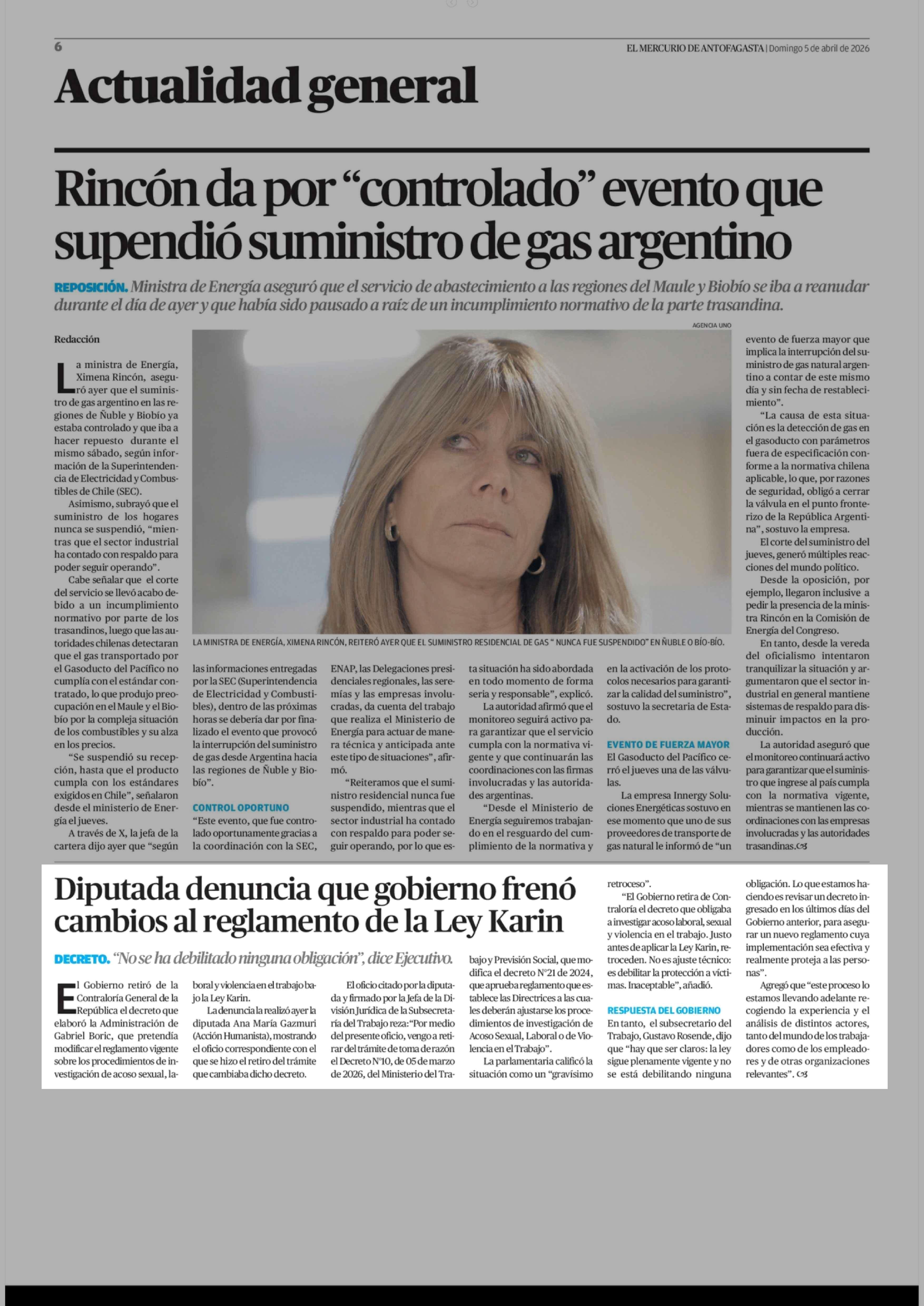 Diputada denuncia que gobierno frenó cambios al reglamento de la Ley Karin 05-04-2026 El Mercurio de Antofagasta |