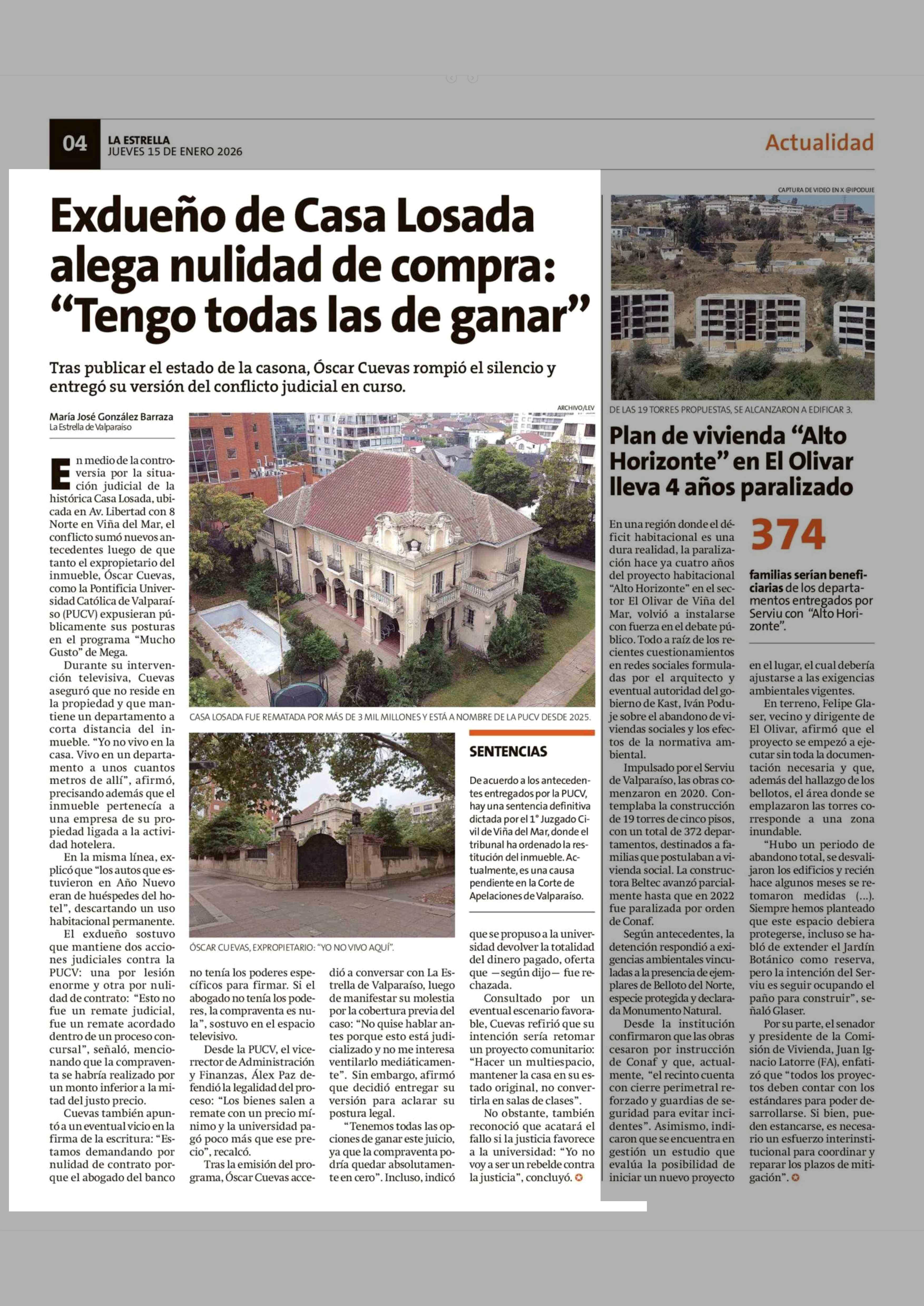 Exdueño de Casa Losada alega nulidad de compra: "Tengo todas las de ganar" 15-01-2026 La Estrella de Valparaíso |