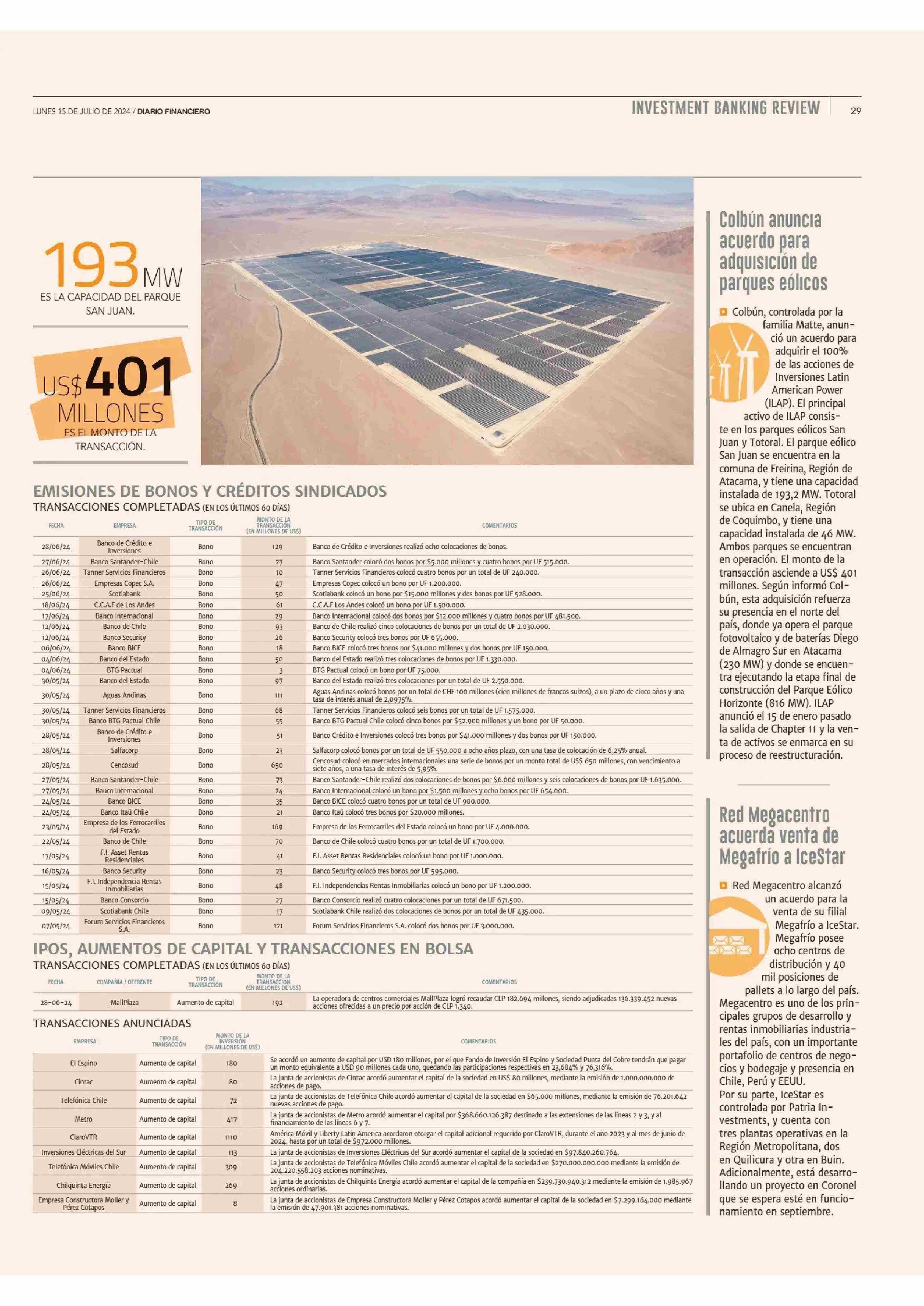 Acuerdo de Colbún con Latin American Power para adquisición de parques eólicos San Juan y Totoral destaca en junio 15-07-2024 Diario Financiero |