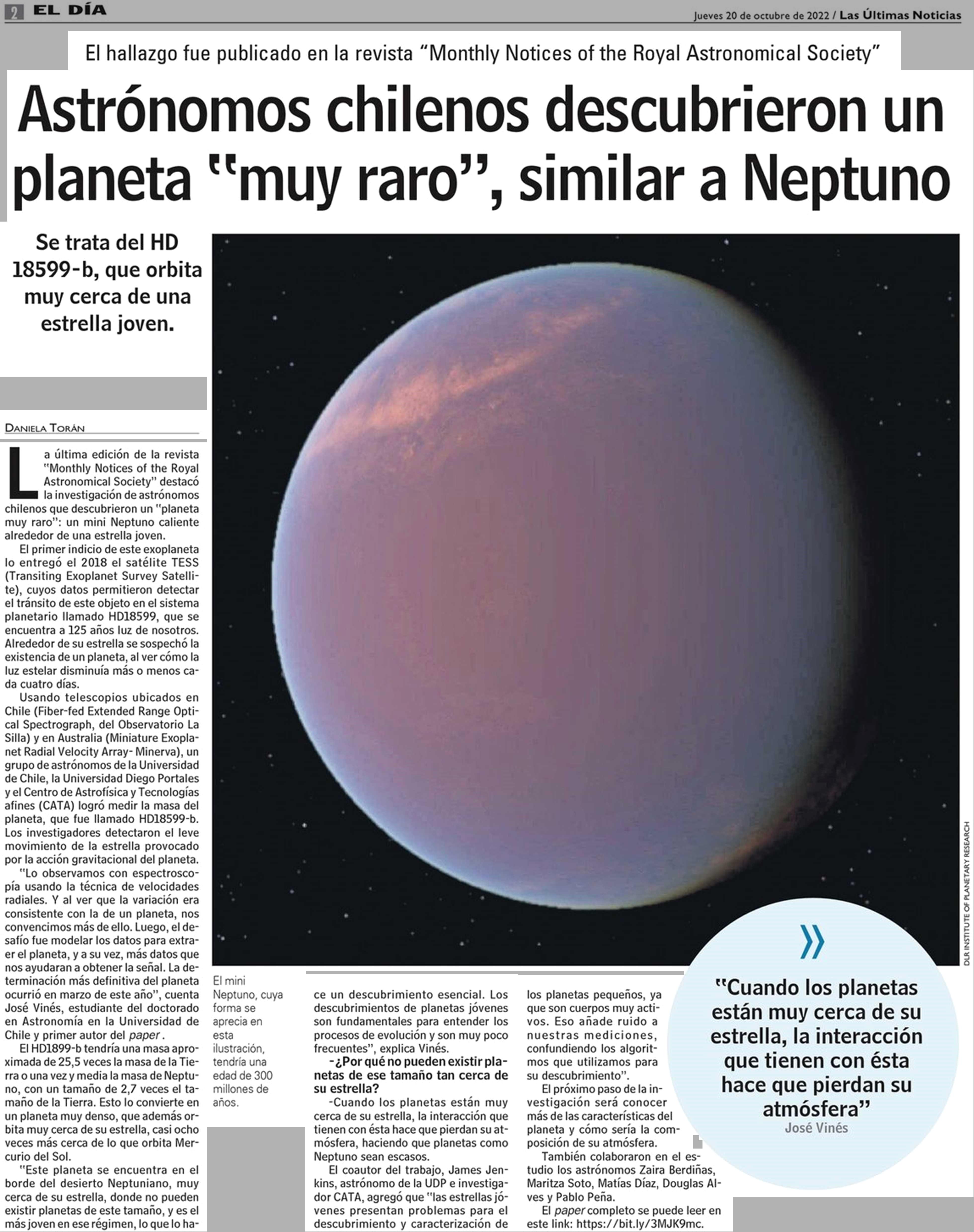 Astrónomos chilenos descubrieron un planeta “muy raro”, similar a Neptuno 20-10-2022 Las Últimas Noticias |