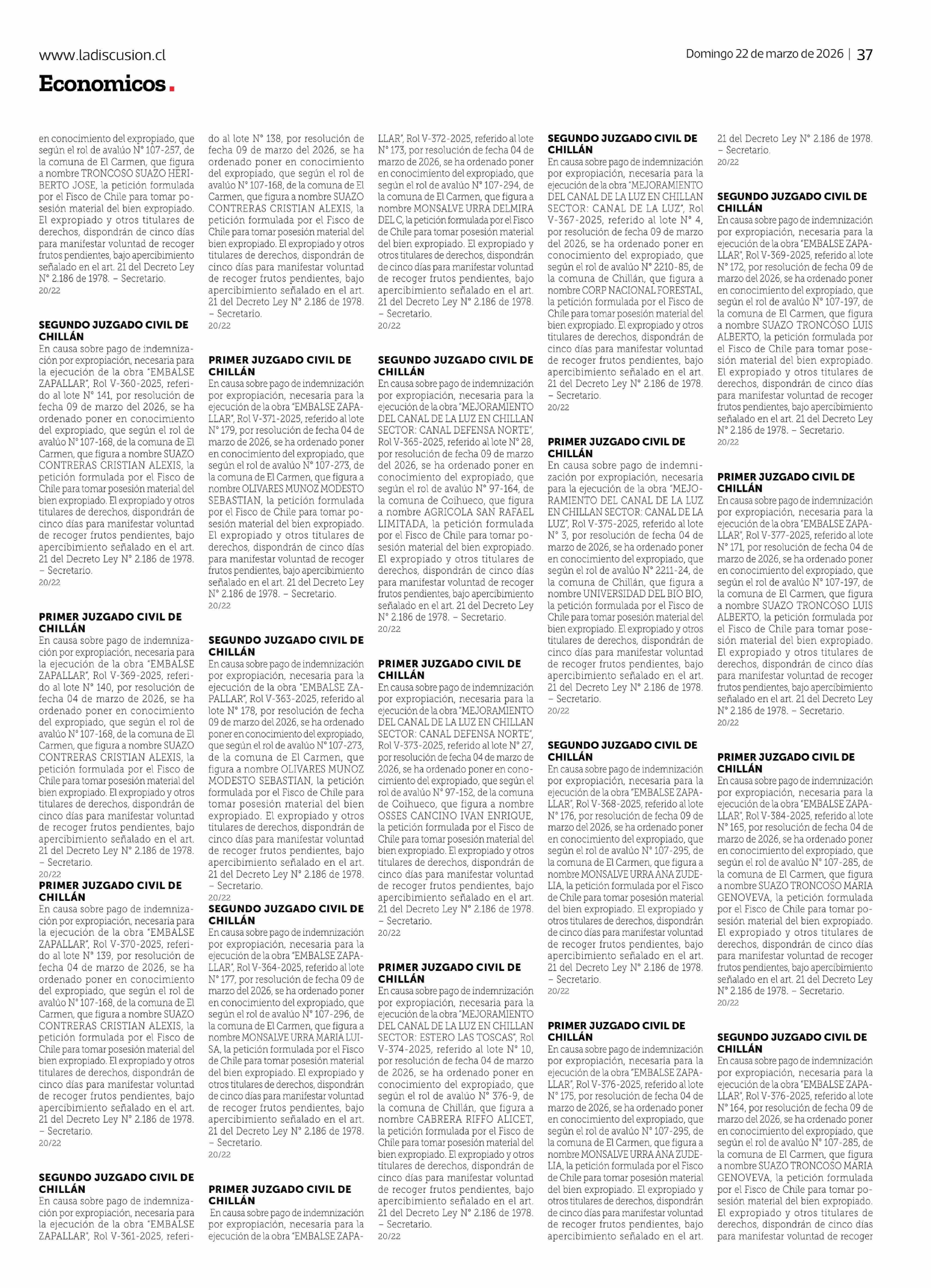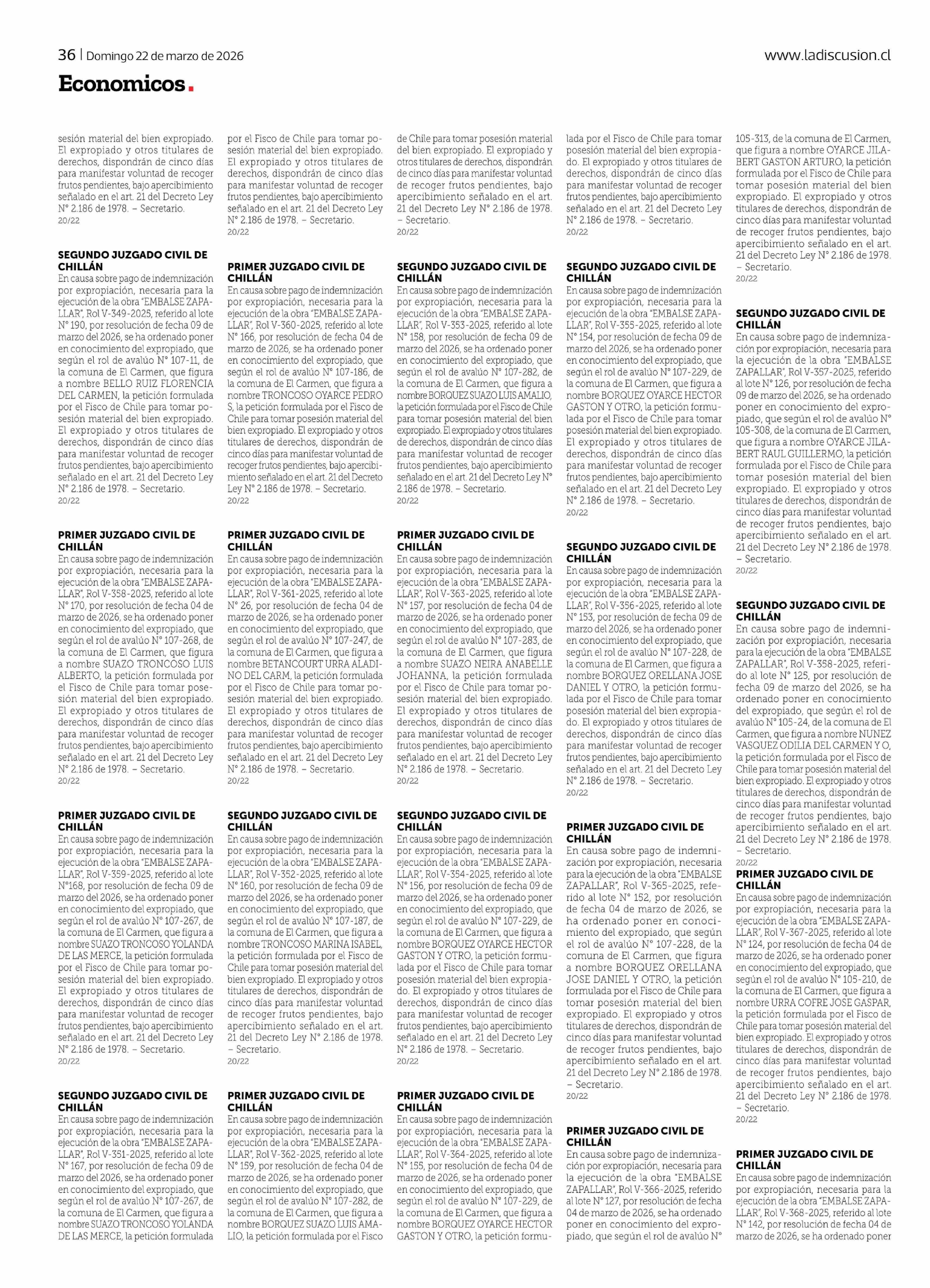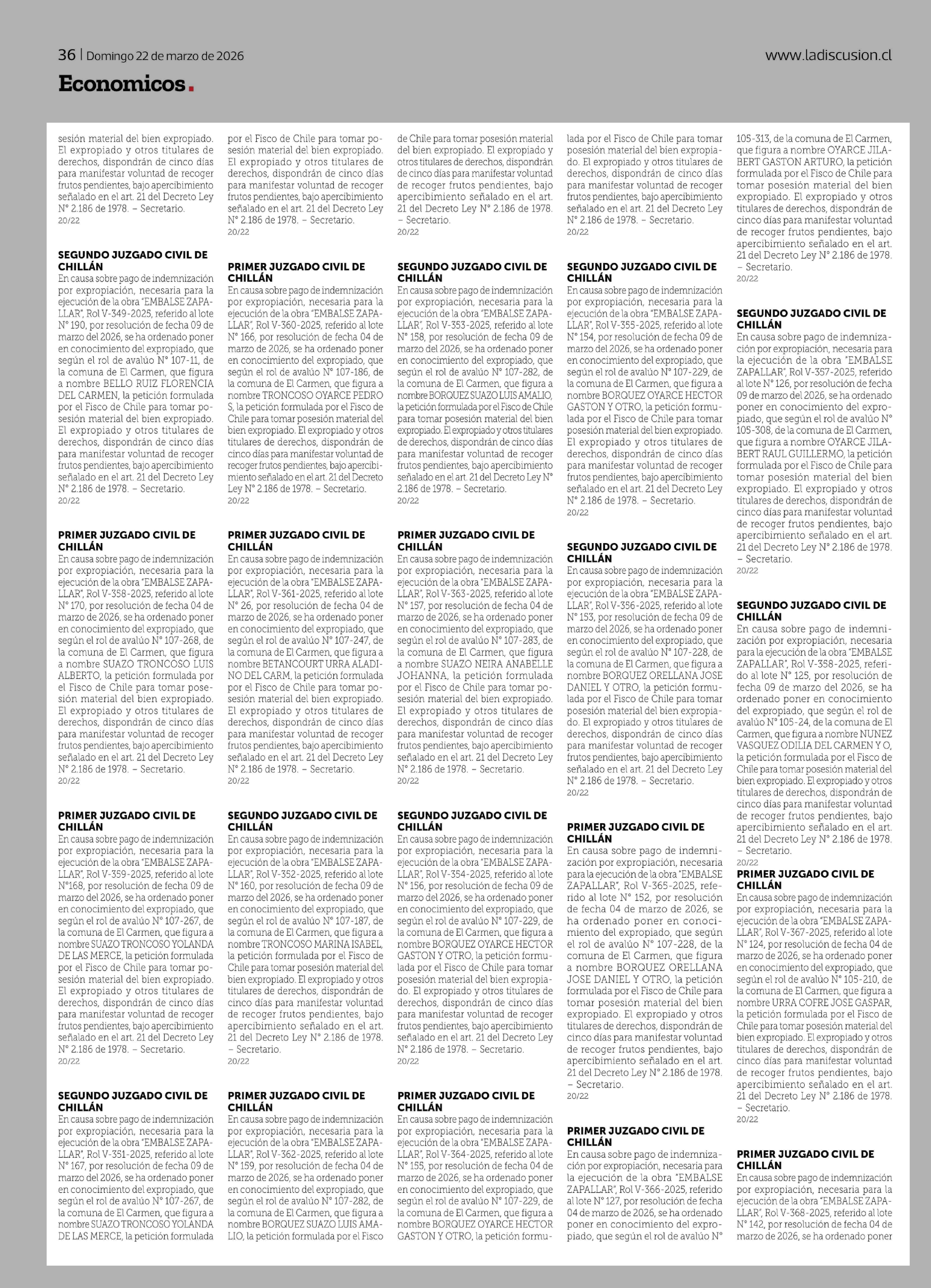 sesión material del bien expropiado. El expropiado y otros titulares de derechos, dispondrán de cinco días para manifestar voluntad de recoger frutos pendientes, bajo apercibimiento señalado en el art. 21 del Decreto Ley Nº 2.186 de 1978. - Secretario. 20/22