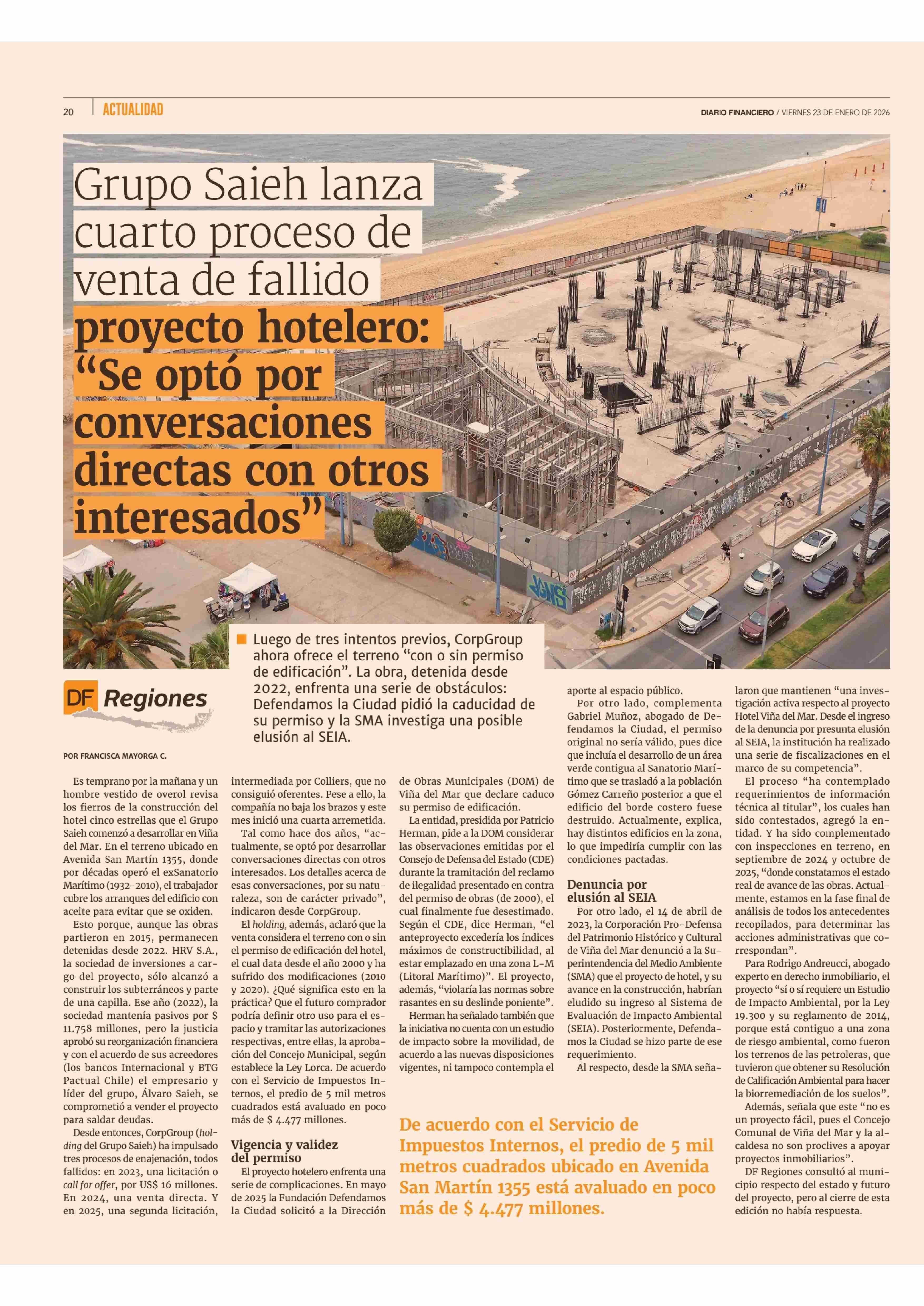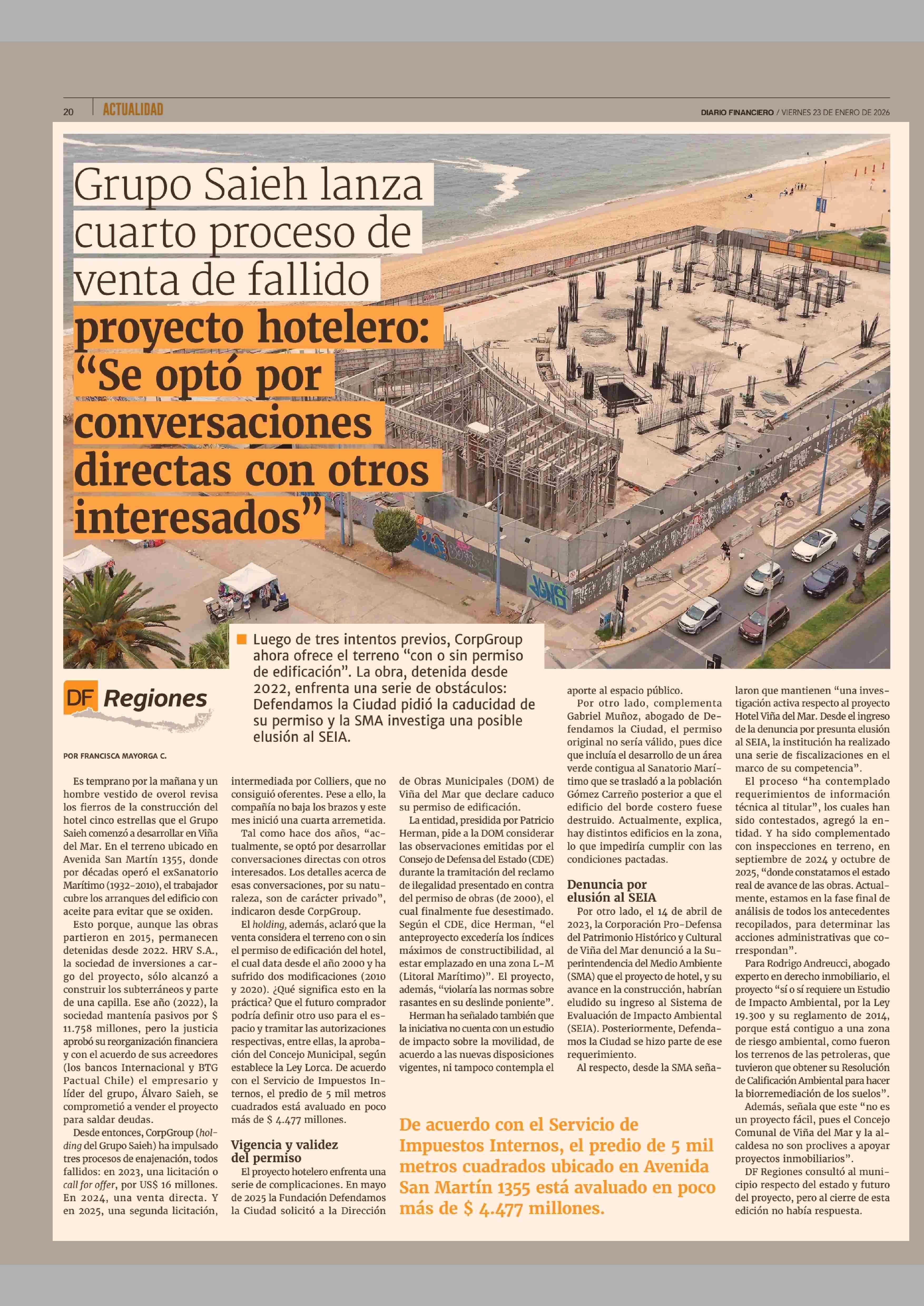 Grupo Saieh lanza cuarto proceso de venta de fallido proyecto hotelero: "Se optó por conversaciones directas con otros interesados" 23-01-2026 Diario Financiero |