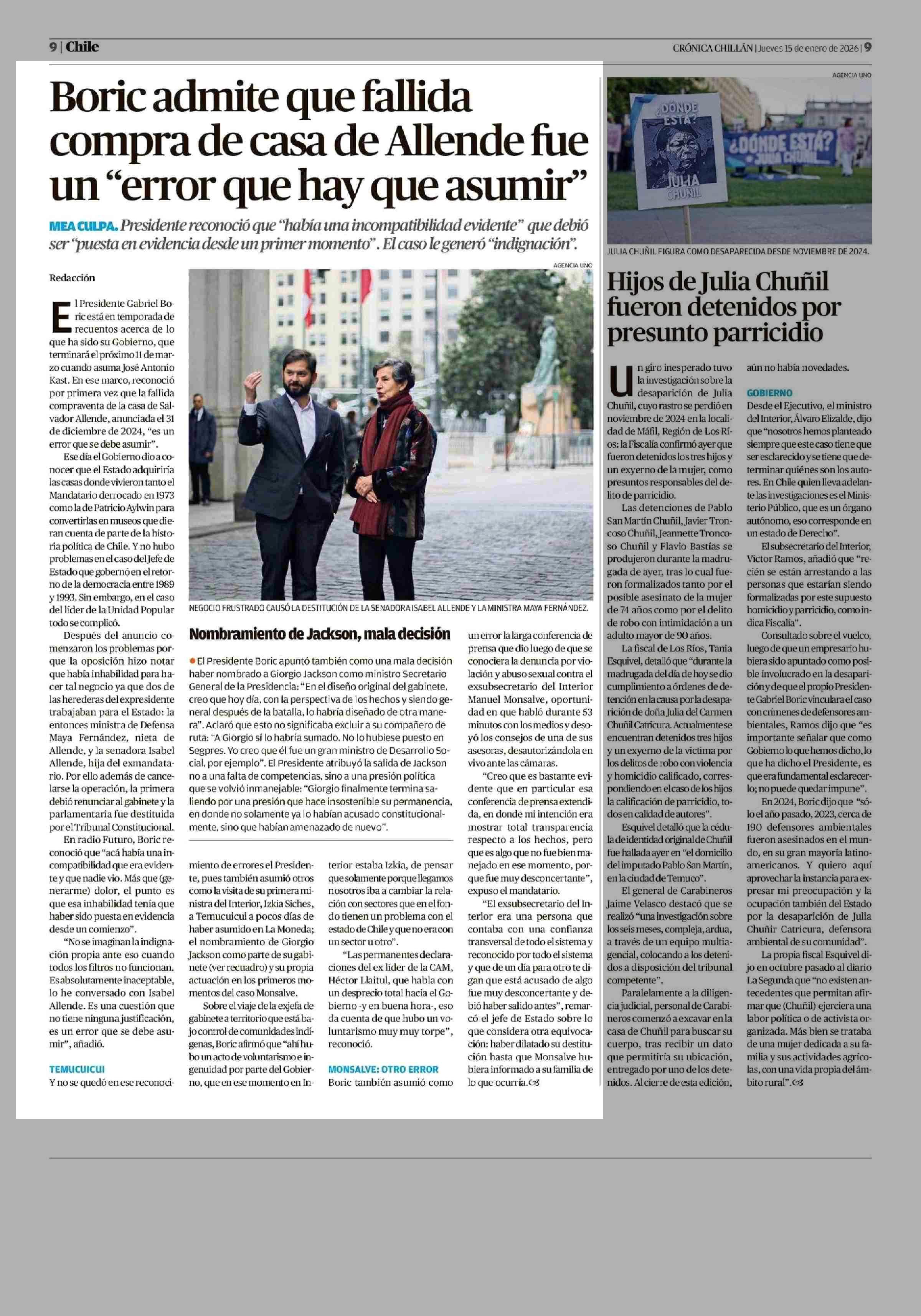 Boric admite que fallida compra de casa de Allende fue un “error que hay que asumir” 15-01-2026 Crónica de Chillán |
