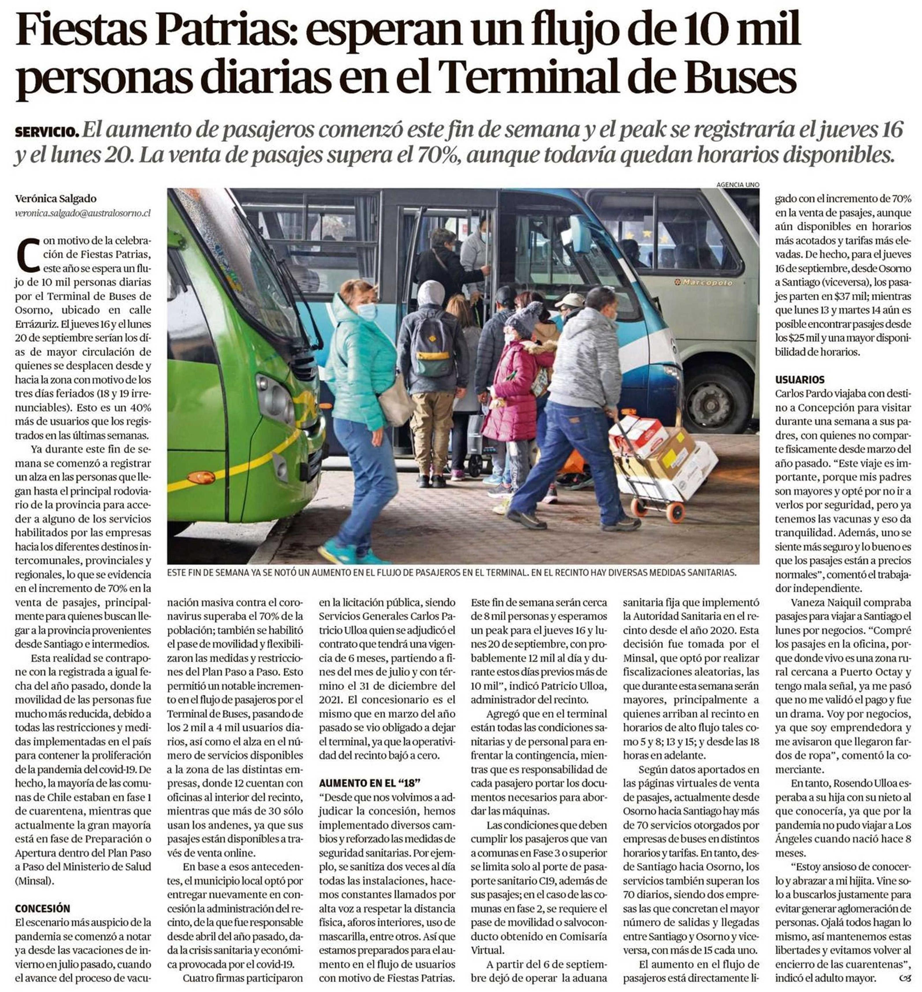 Fiestas Patrias: esperan un flujo de 10 mil personas diarias en el Terminal de Buses 12-09-2021 El Austral de Osorno |