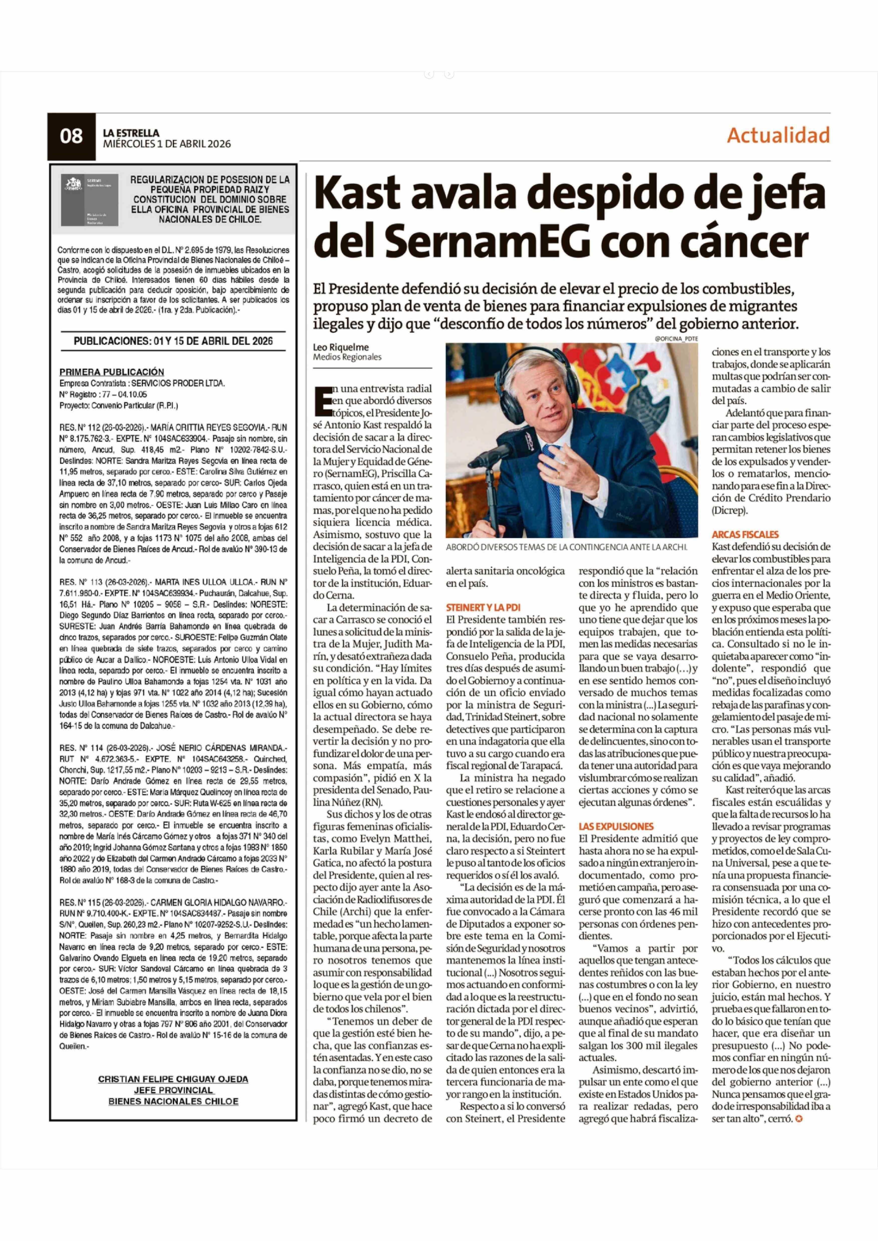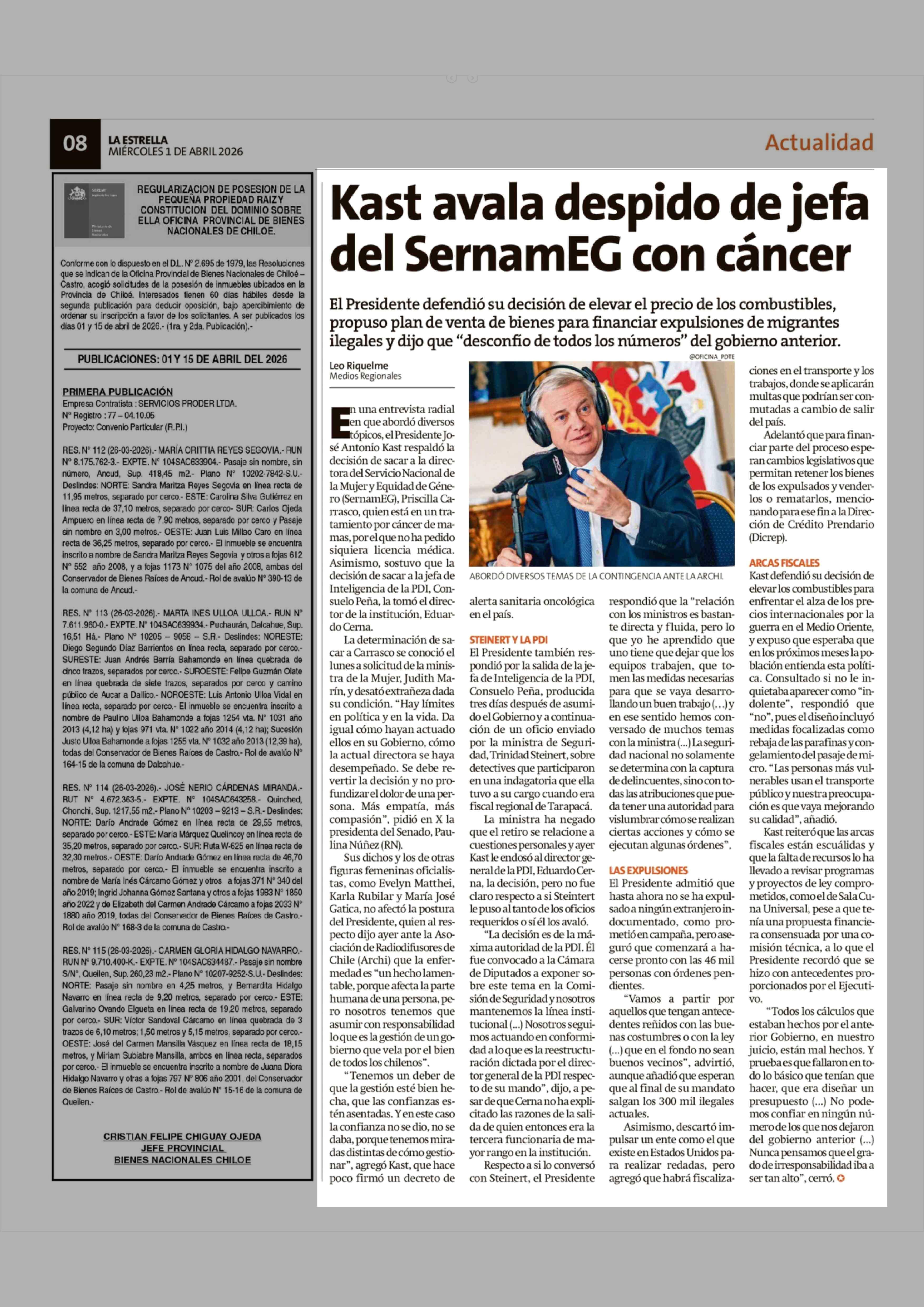 Kast avala despido de jefa del SernamEG con cáncer 01-04-2026 La Estrella de Chiloé |