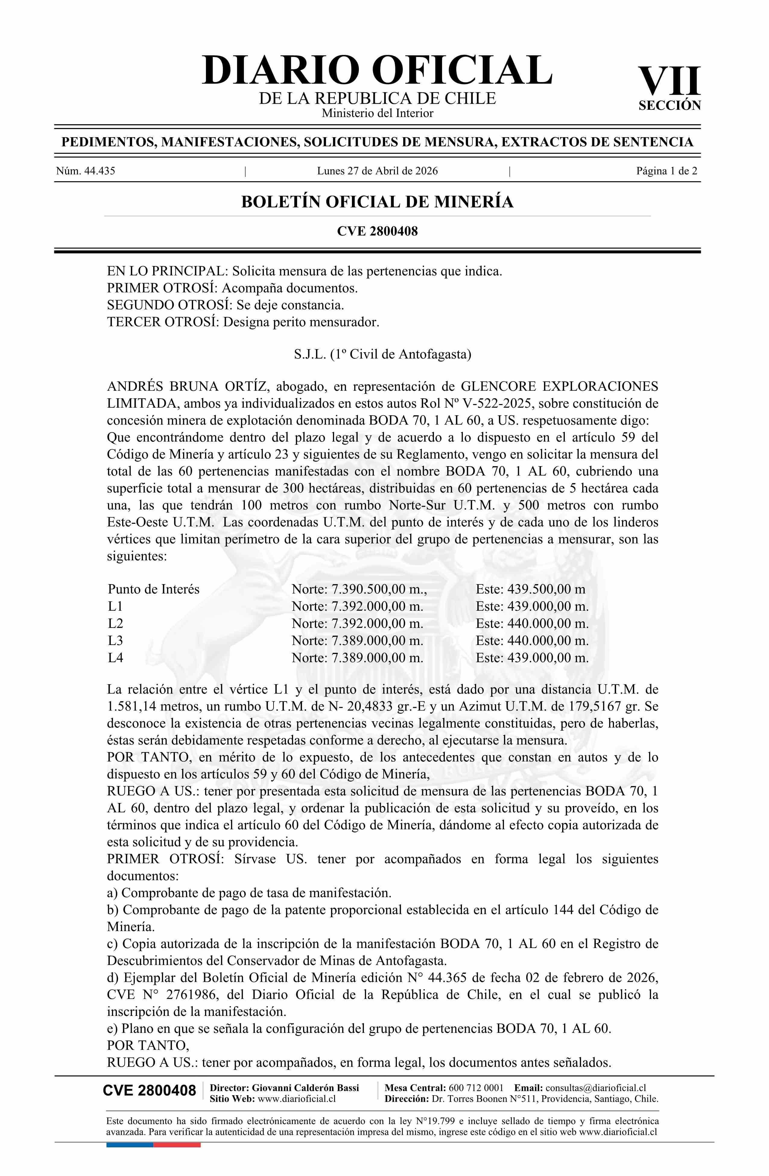 Título: BODA 70, 1 AL 60 / Glencore Exploraciones Limitada