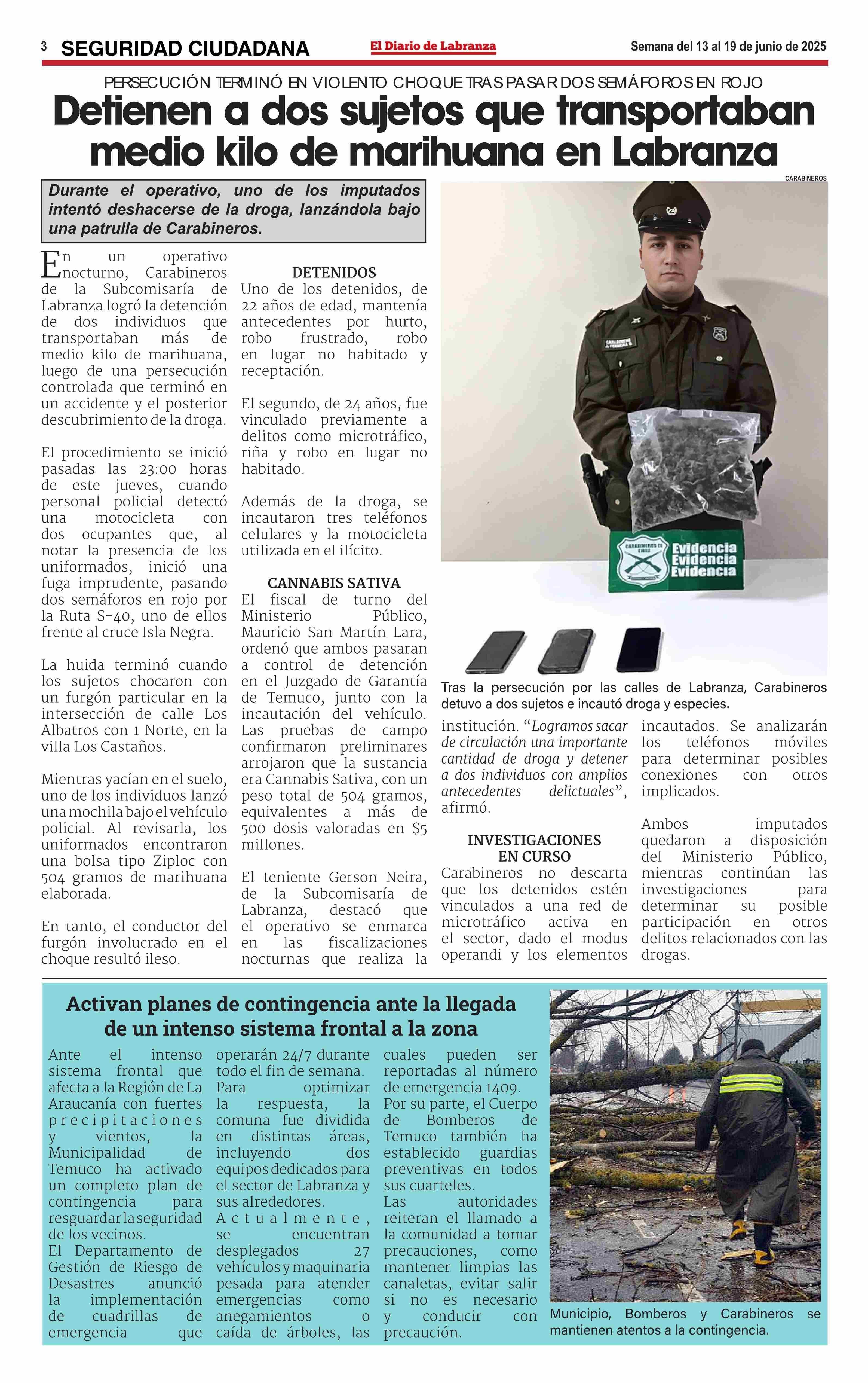 Detienen a dos sujetos que transportaban medio kilo de marihuana en Labranza 17-06-2025 EL DIARIO DE LABRANZA |