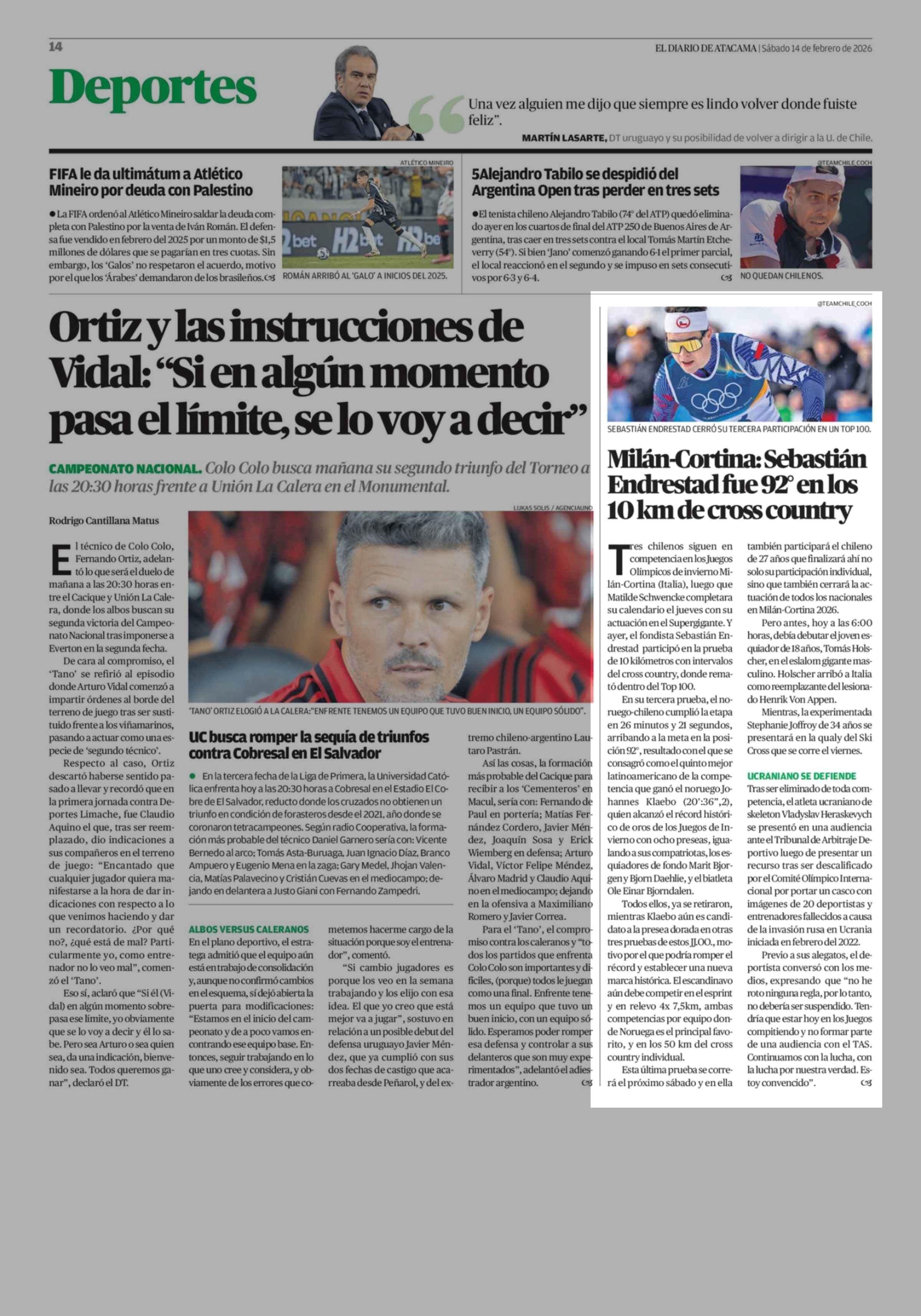 Milán-Cortina: Sebastián Endrestad fue 92° en los 10 km de cross country 14-02-2026 El Diario de Atacama |