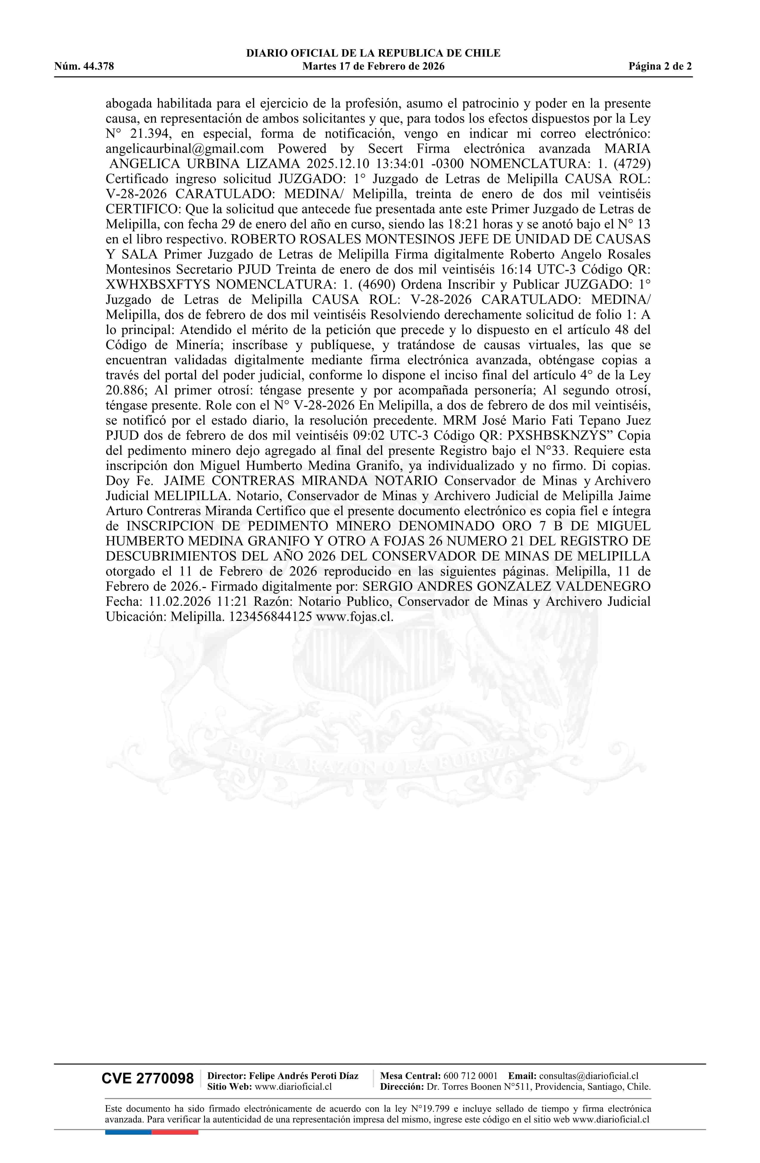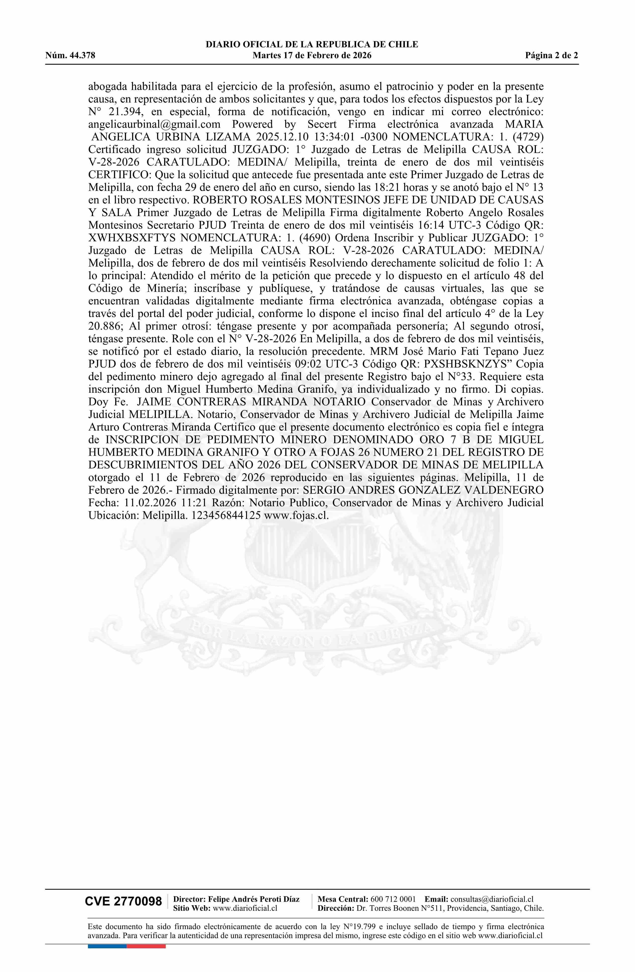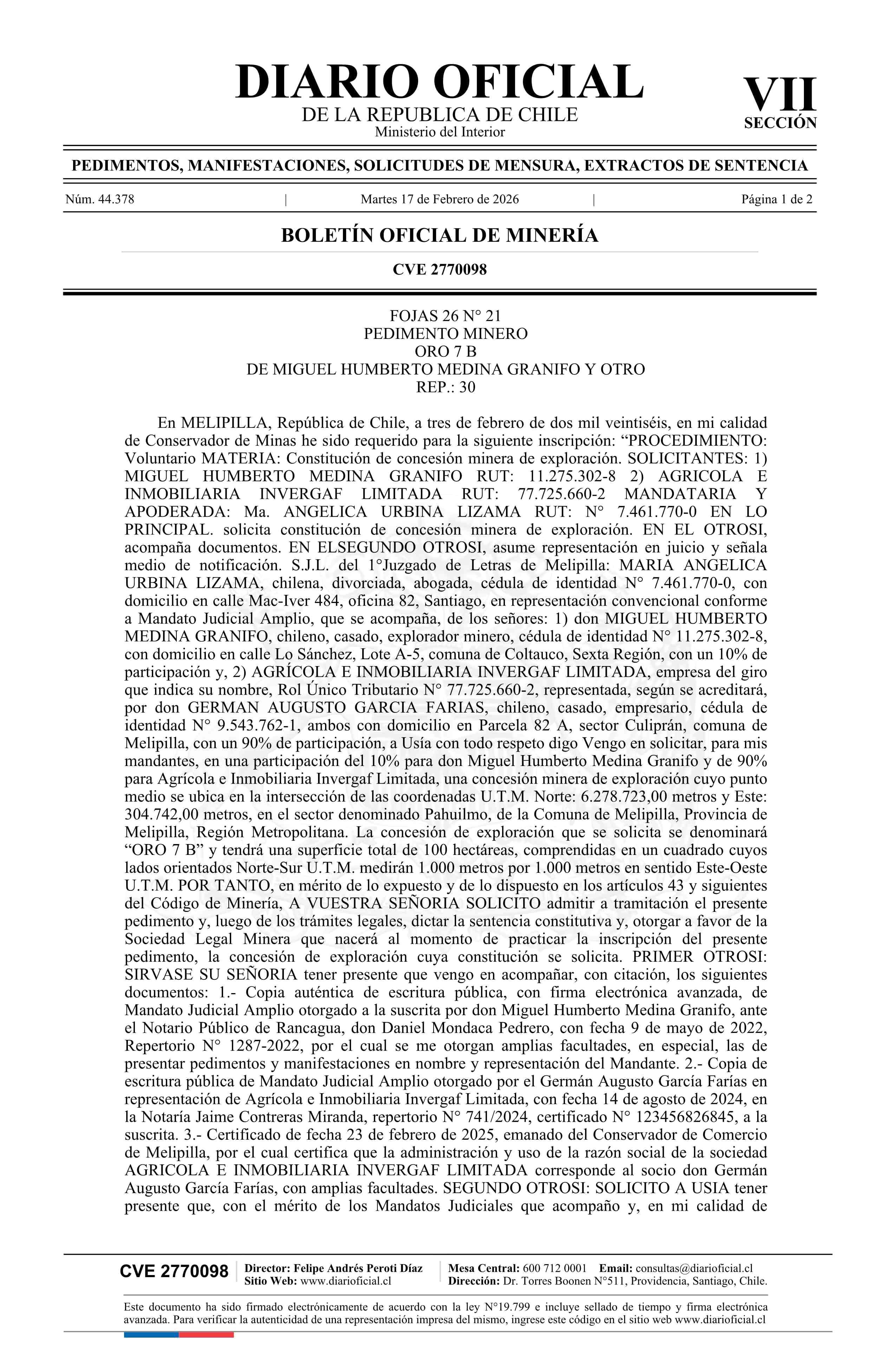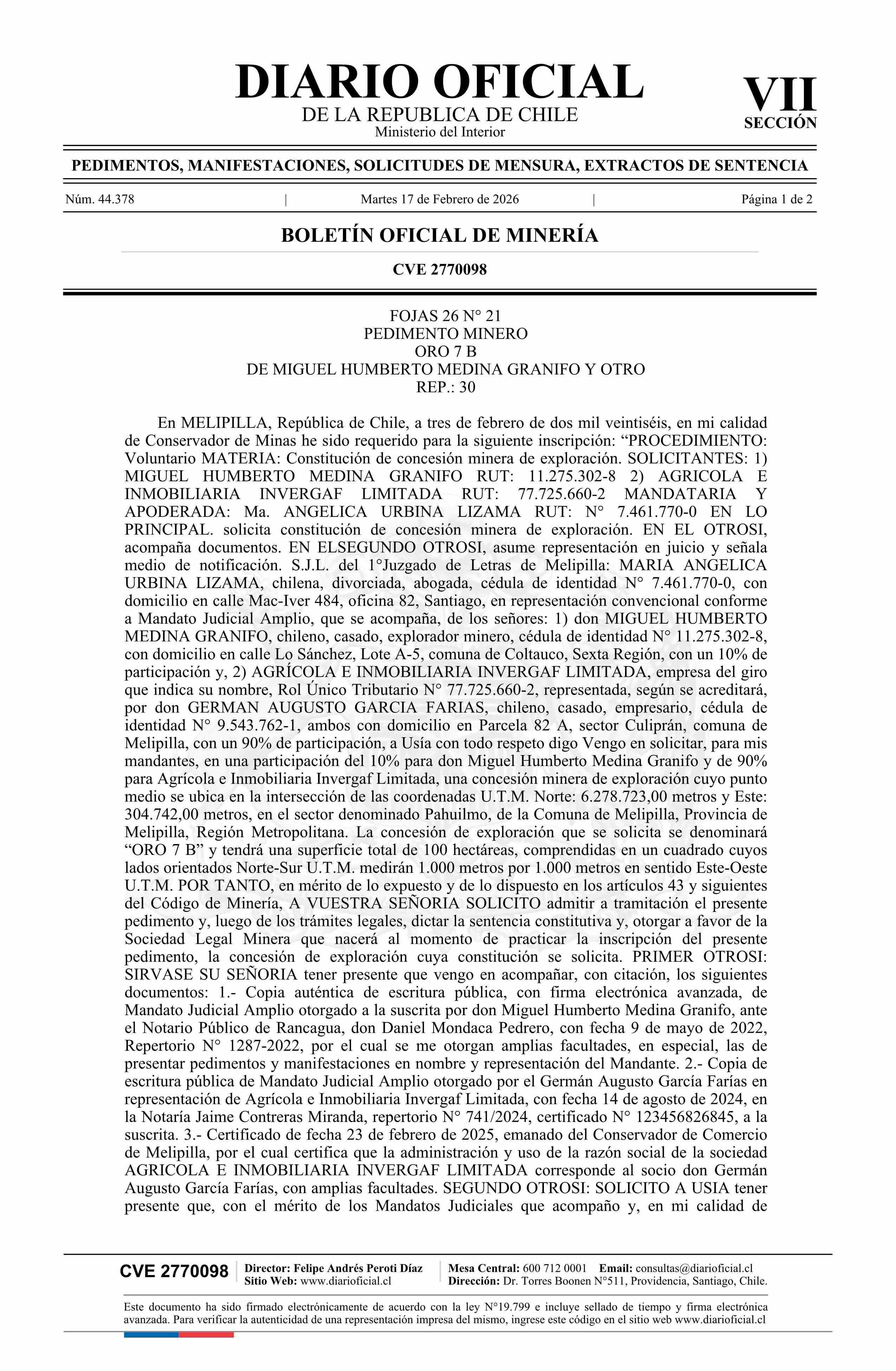 ORO 7 B / Medina Granifo Miguel Humberto y otro 17-02-2026 DIARIO OFICIAL CHILE - BOLETÍN OFICIAL DE MINERÍA |