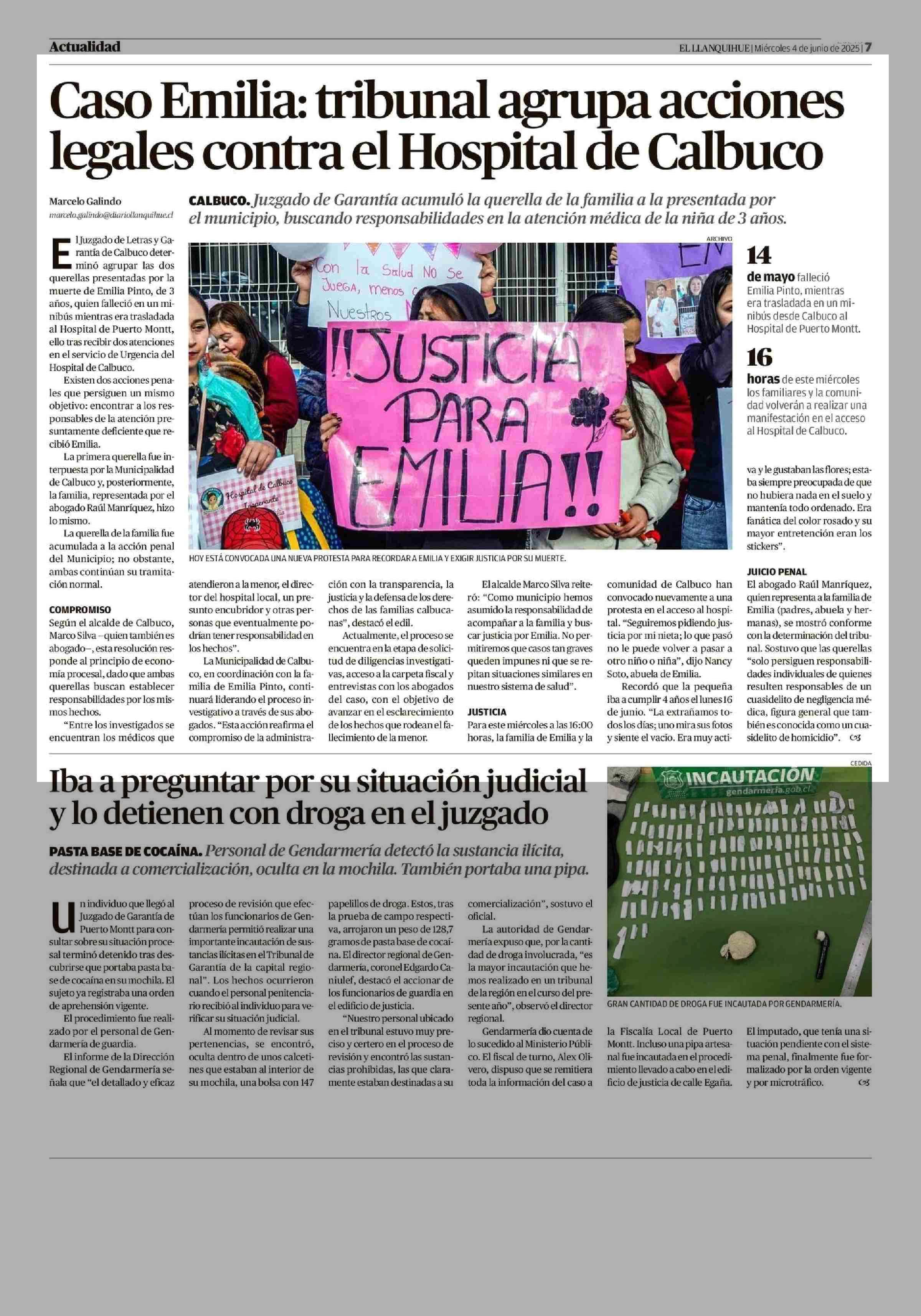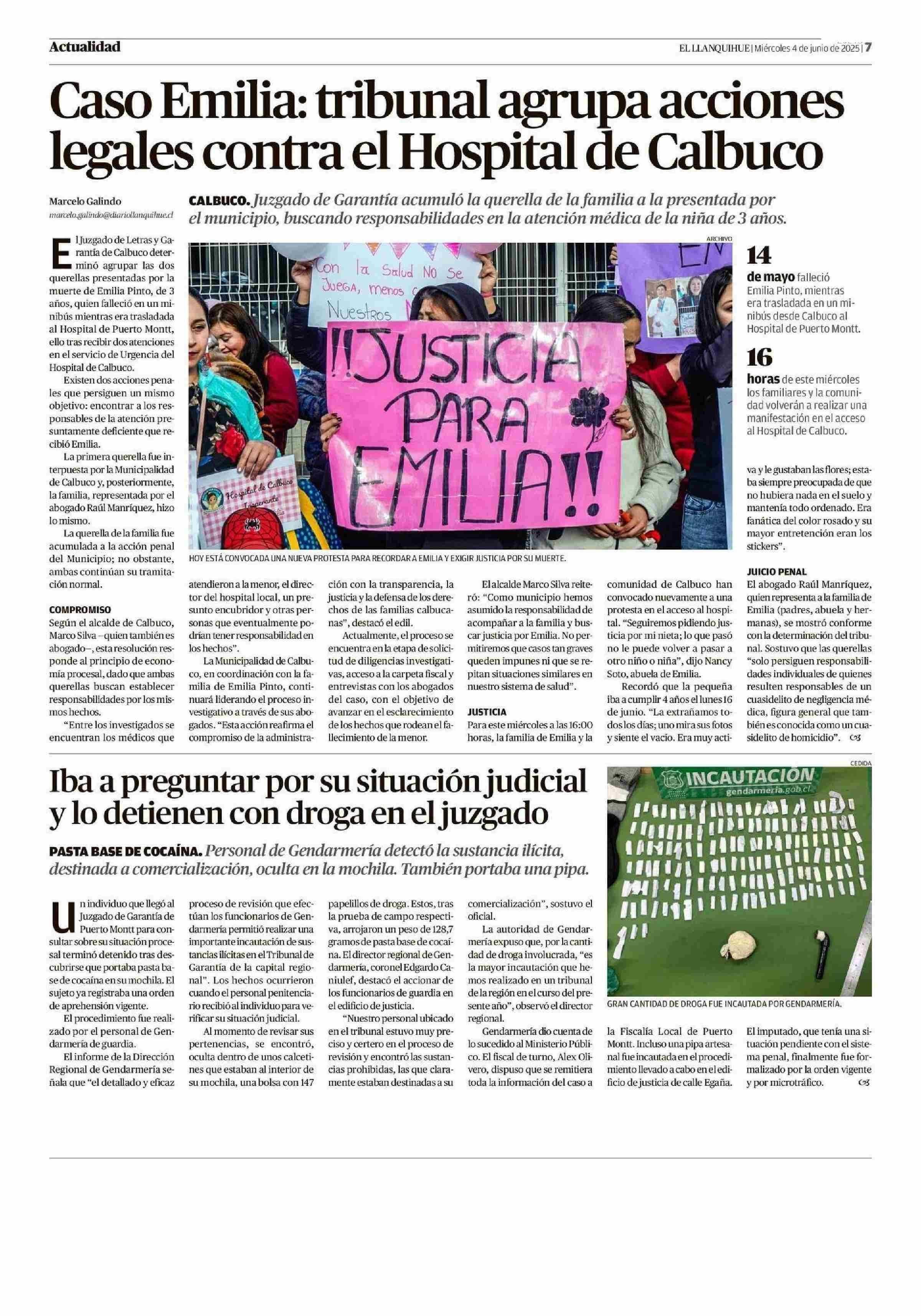 Caso Emilia: tribunal agrupa acciones legales contra el Hospital de Calbuco 04-06-2025 El Llanquihue |