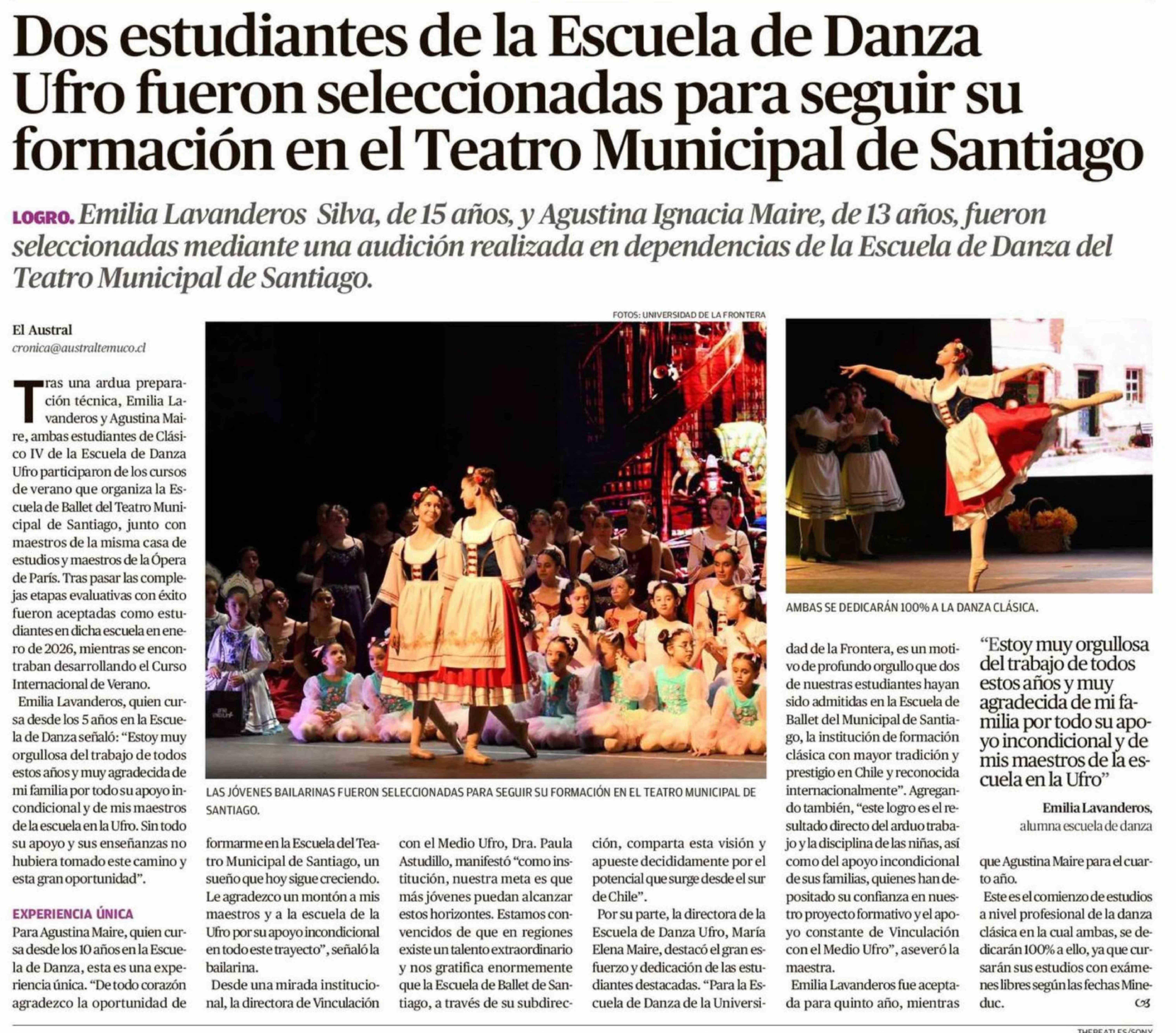 Título: Dos estudiantes de la Escuela de Danza Ufro fueron seleccionadas para seguir su formación en el Teatro Municipal de Santiago