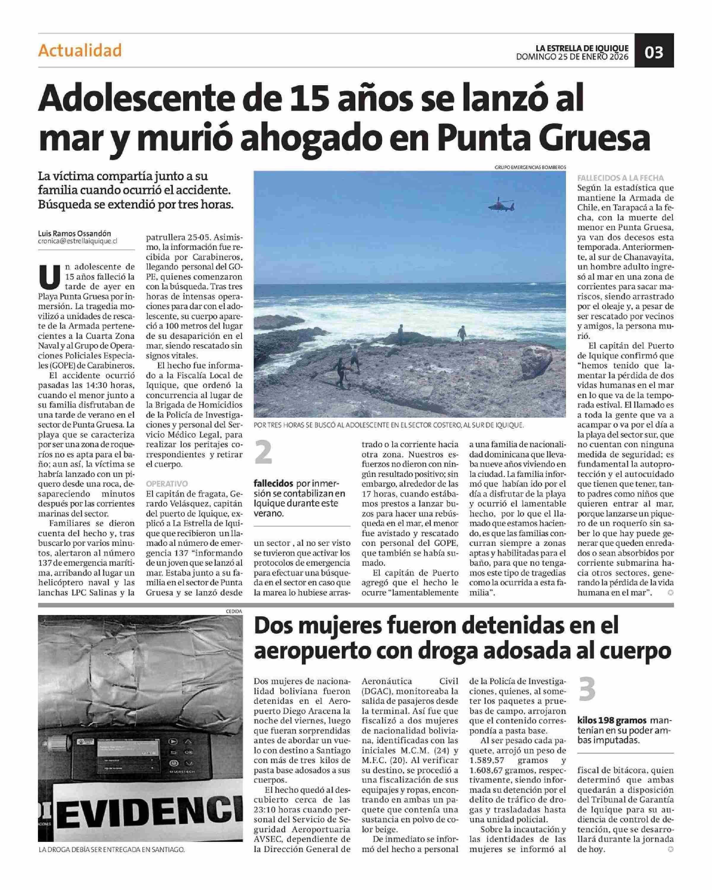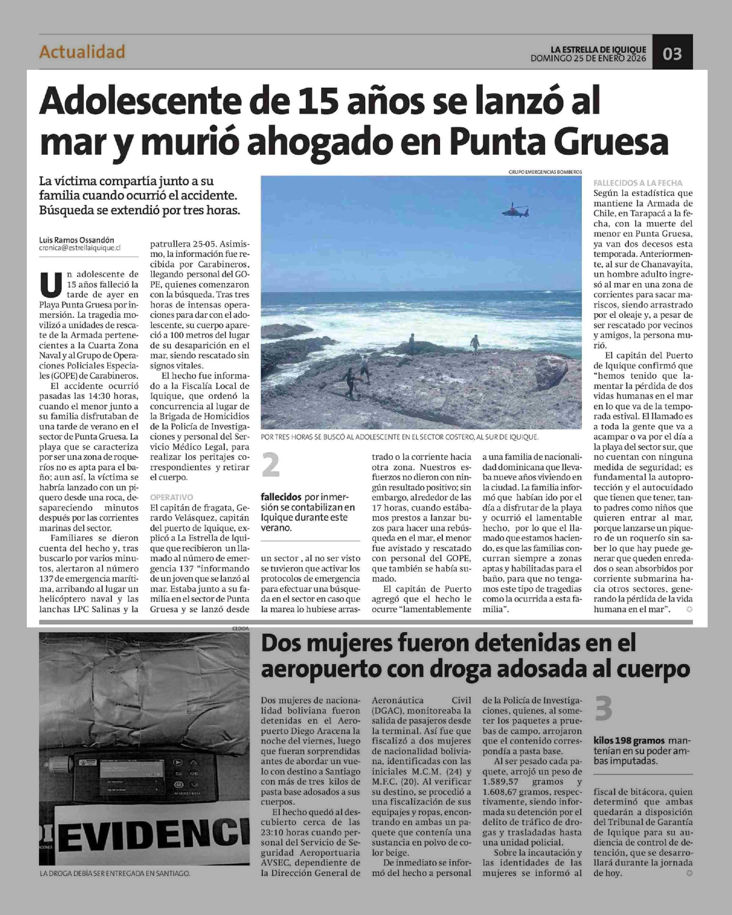 Adolescente de 15 años se lanzó al mar y murió ahogado en Punta Gruesa 25-01-2026 La Estrella de Iquique |