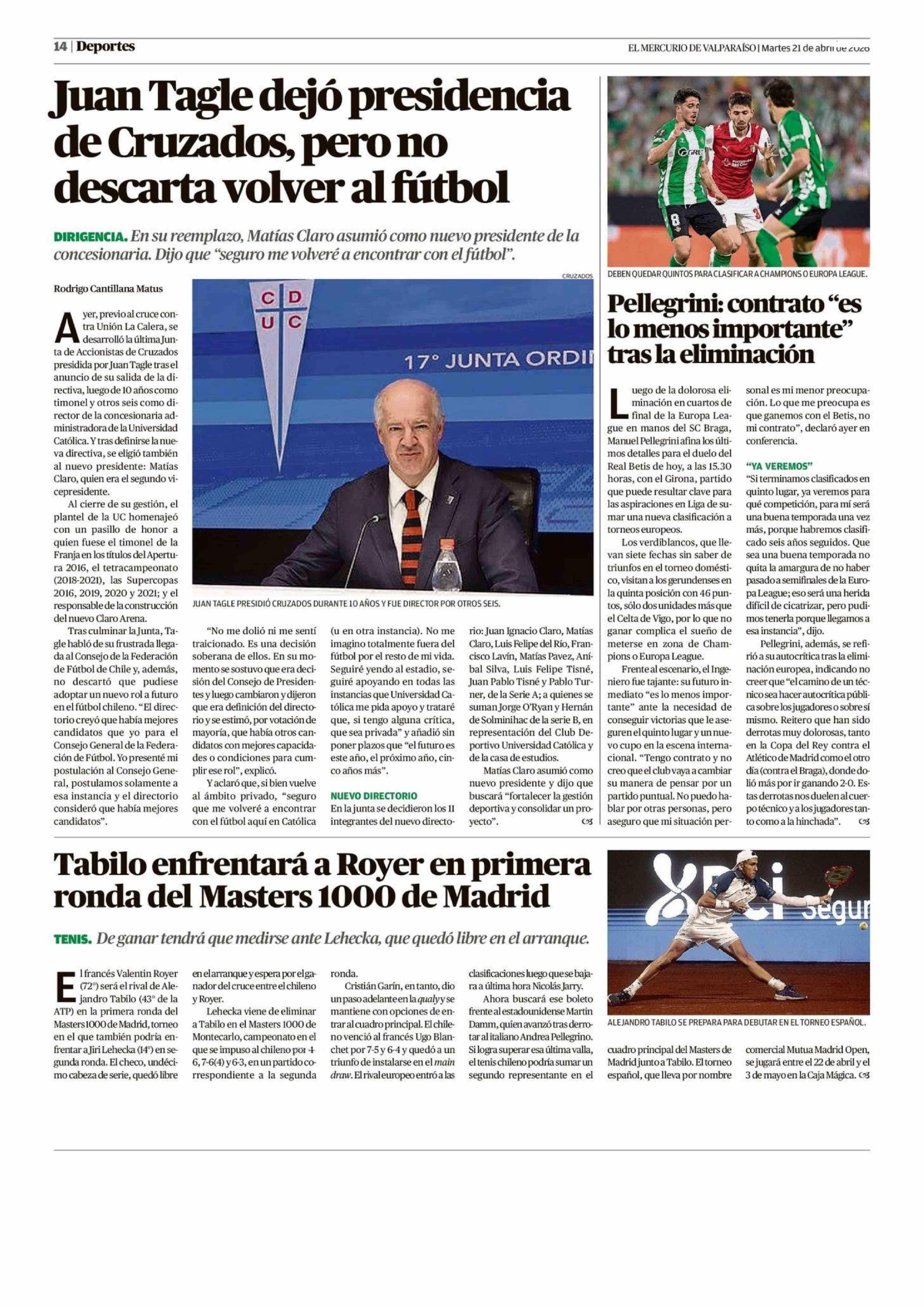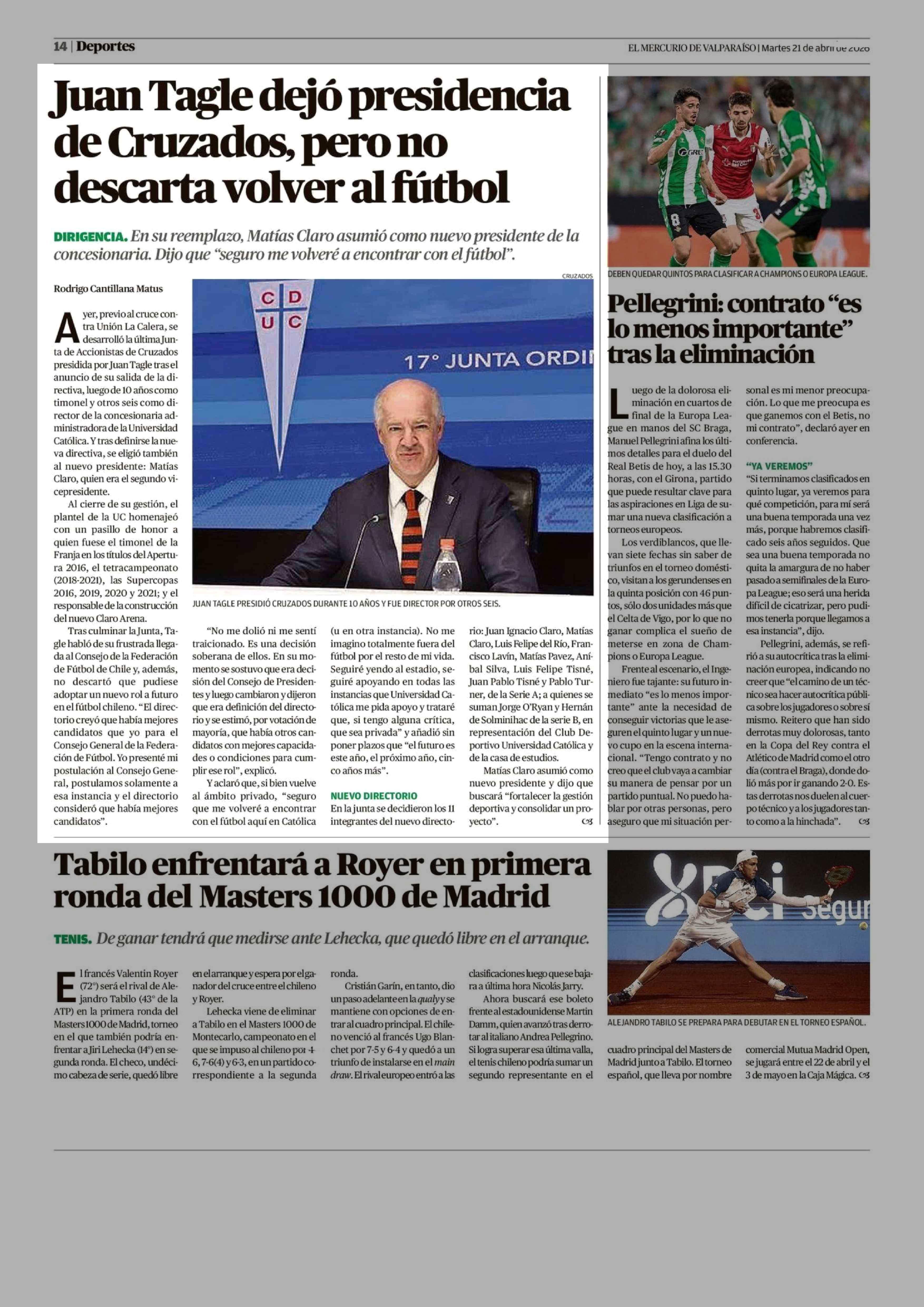 Juan Tagle dejó presidencia de Cruzados, pero no descarta volver al fútbol 21-04-2026 El Mercurio de Valparaíso |