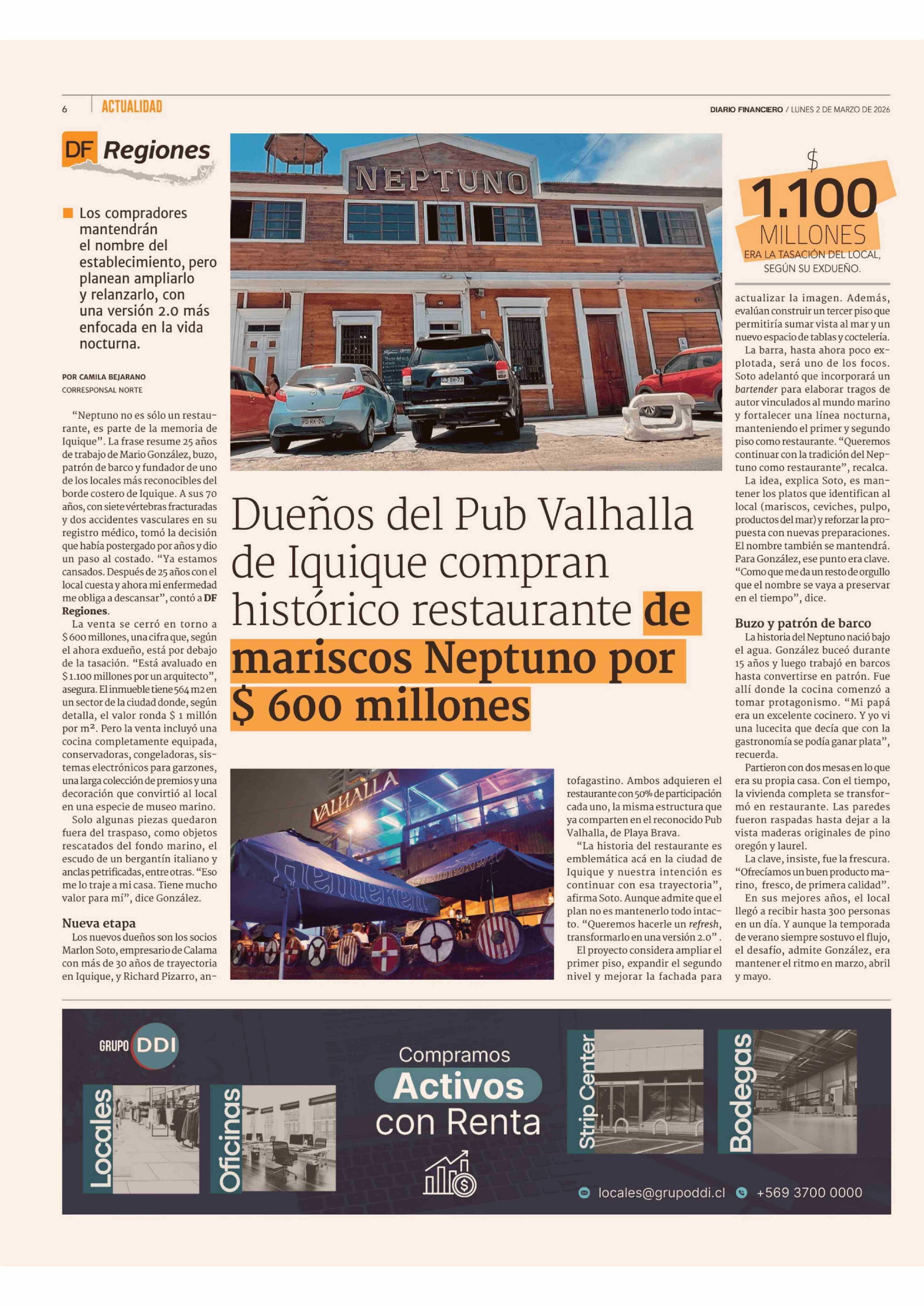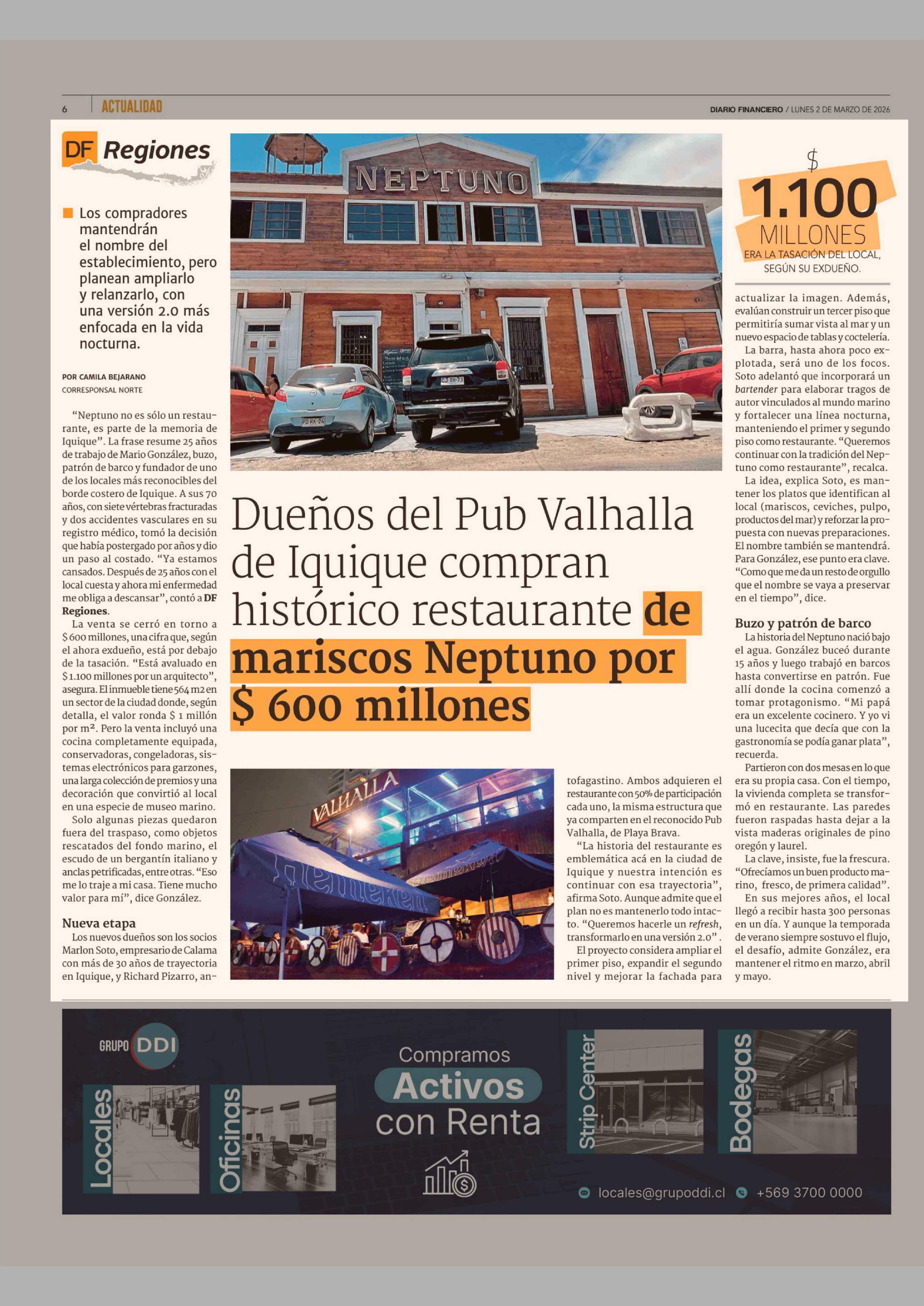 Dueños del Pub Valhalla de Iquique compran histórico restaurante de mariscos Neptuno por $ 600 millones 02-03-2026 Diario Financiero |