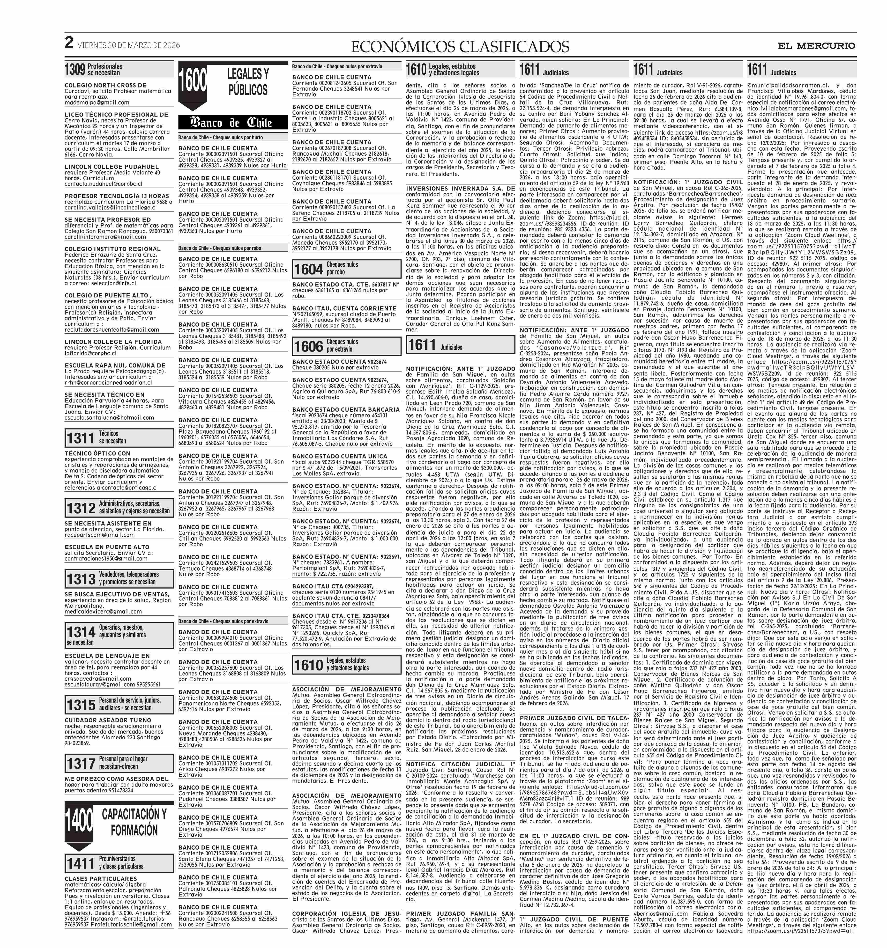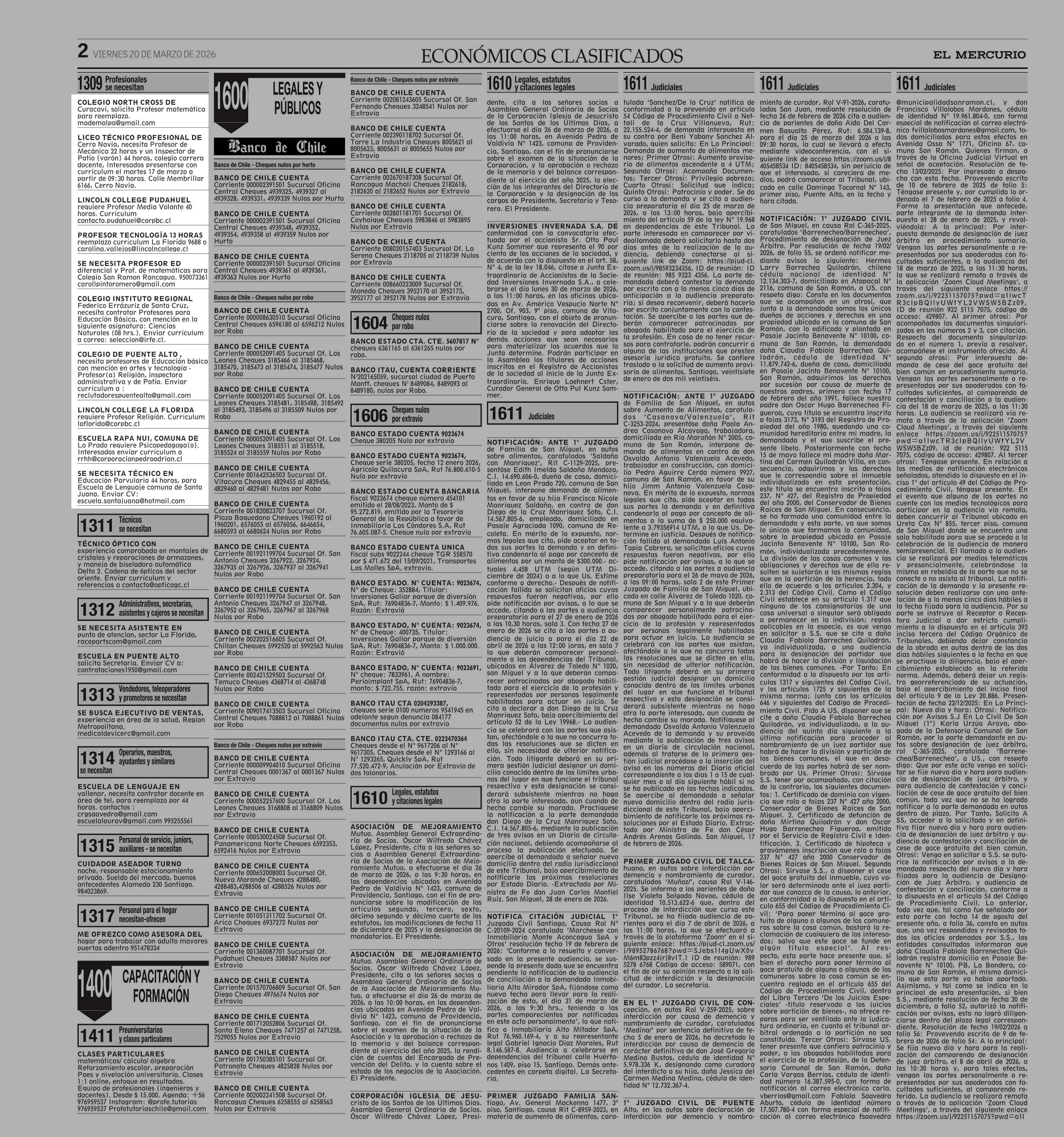 AVISO LICITACIONES: Área Educación 20-03-2026 El Mercurio |