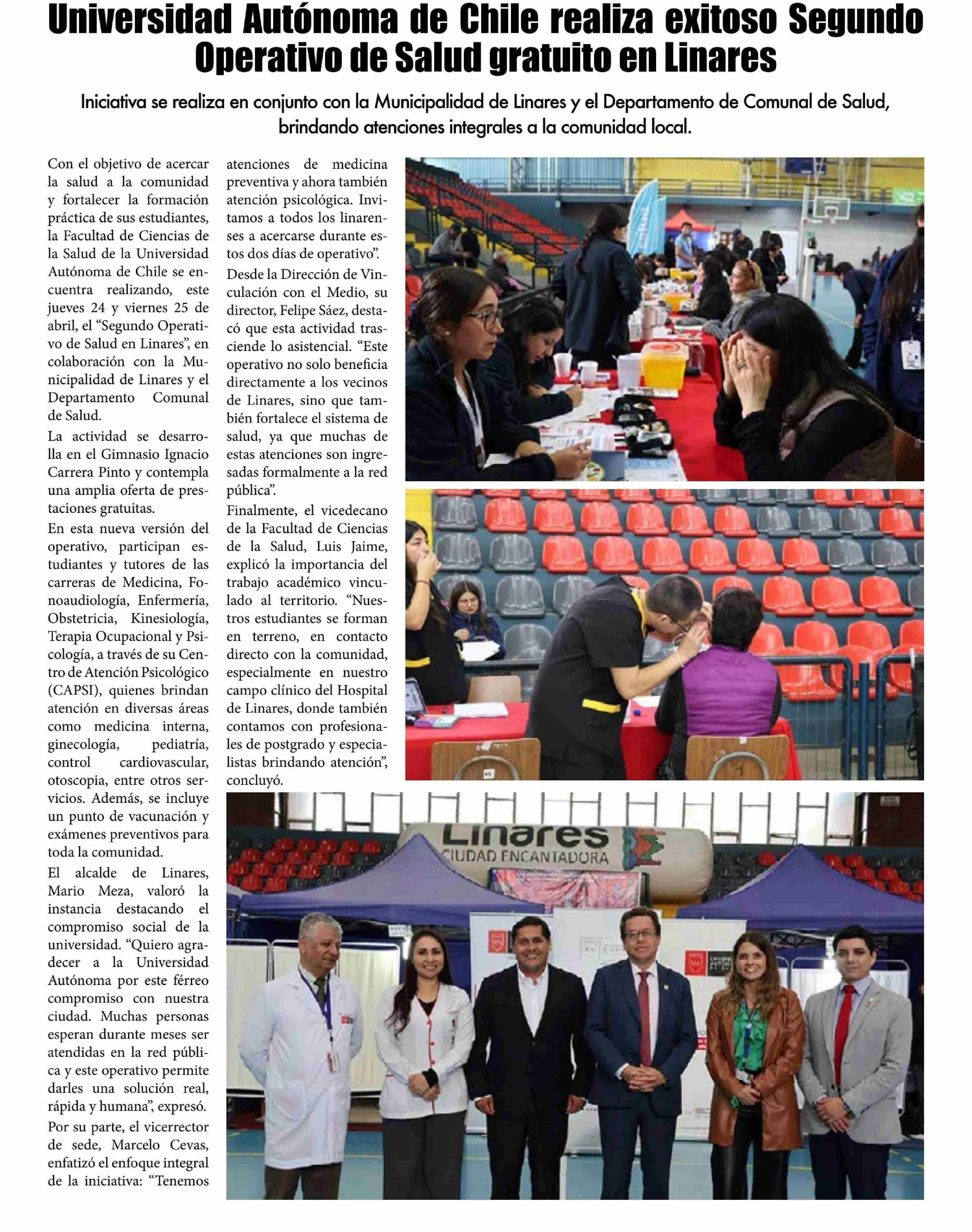 Universidad Autónoma de Chile realiza exitoso Segundo Operativo de Salud gratuito en Linares 26-04-2025 El Lector |