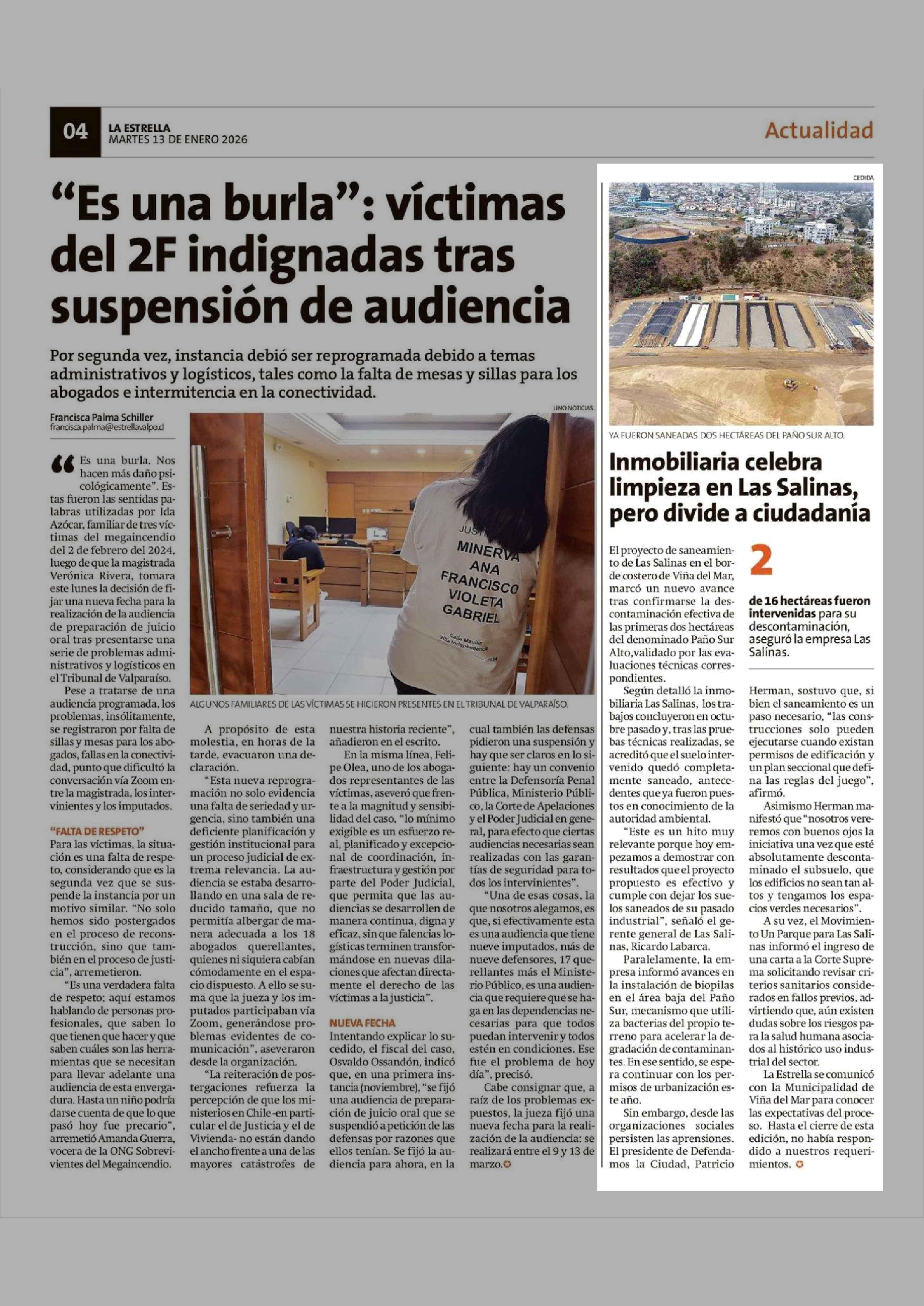 Inmobiliaria celebra limpieza en Las Salinas, pero divide a ciudadanía 13-01-2026 La Estrella de Valparaíso |