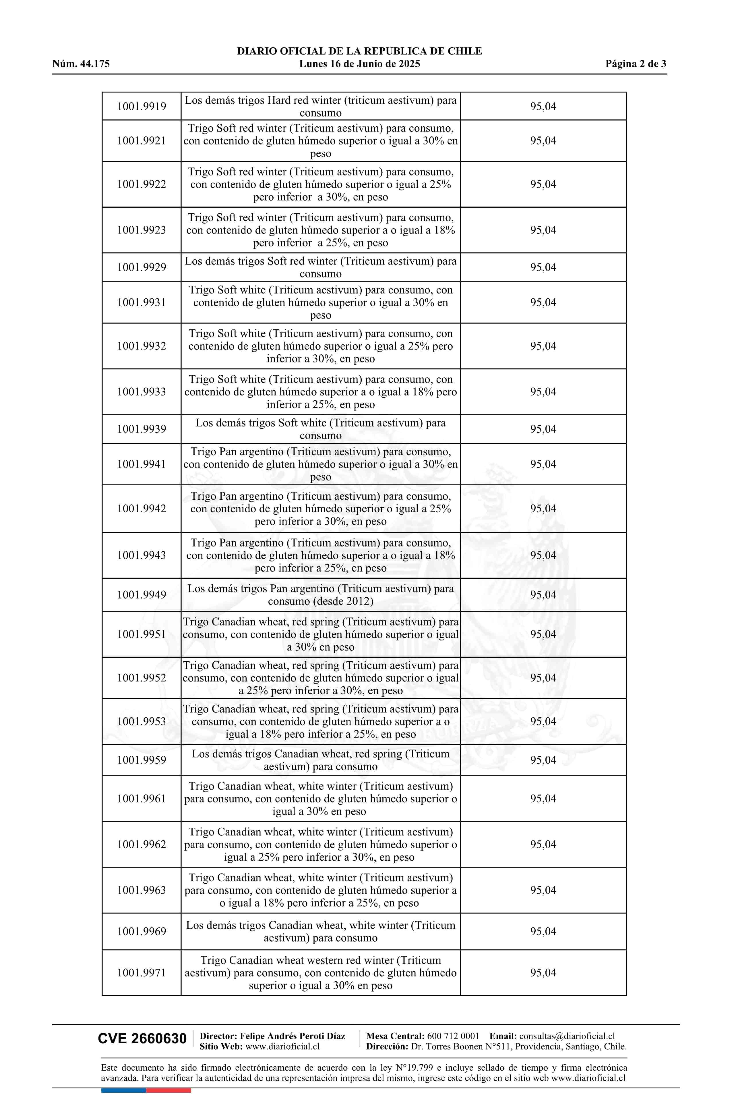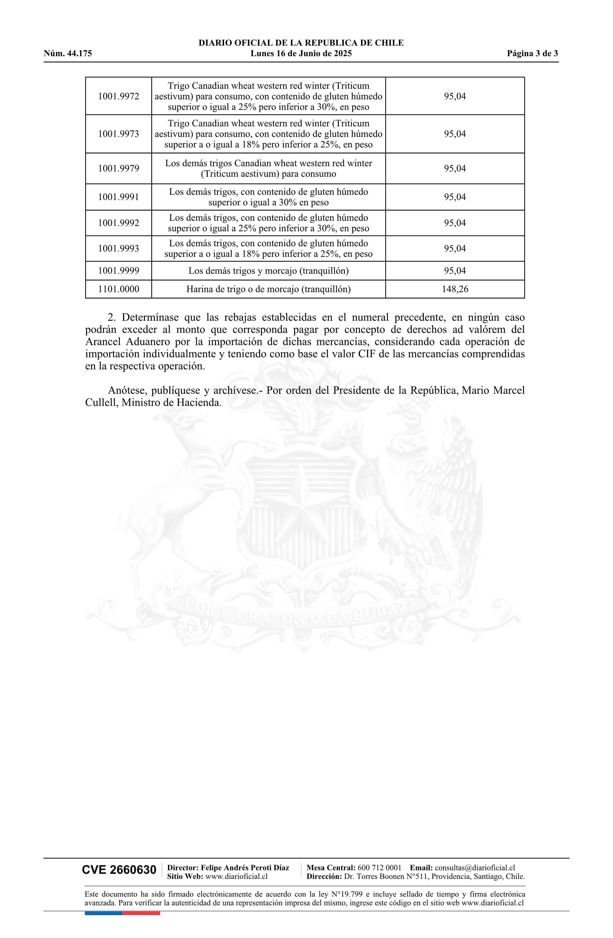 | Título: | Decreto exento número 193, de 2025.- Aplica rebajas de derechos de aduana para la importación de trigo y harina de trigo o de morcajo (tranquillón) |
