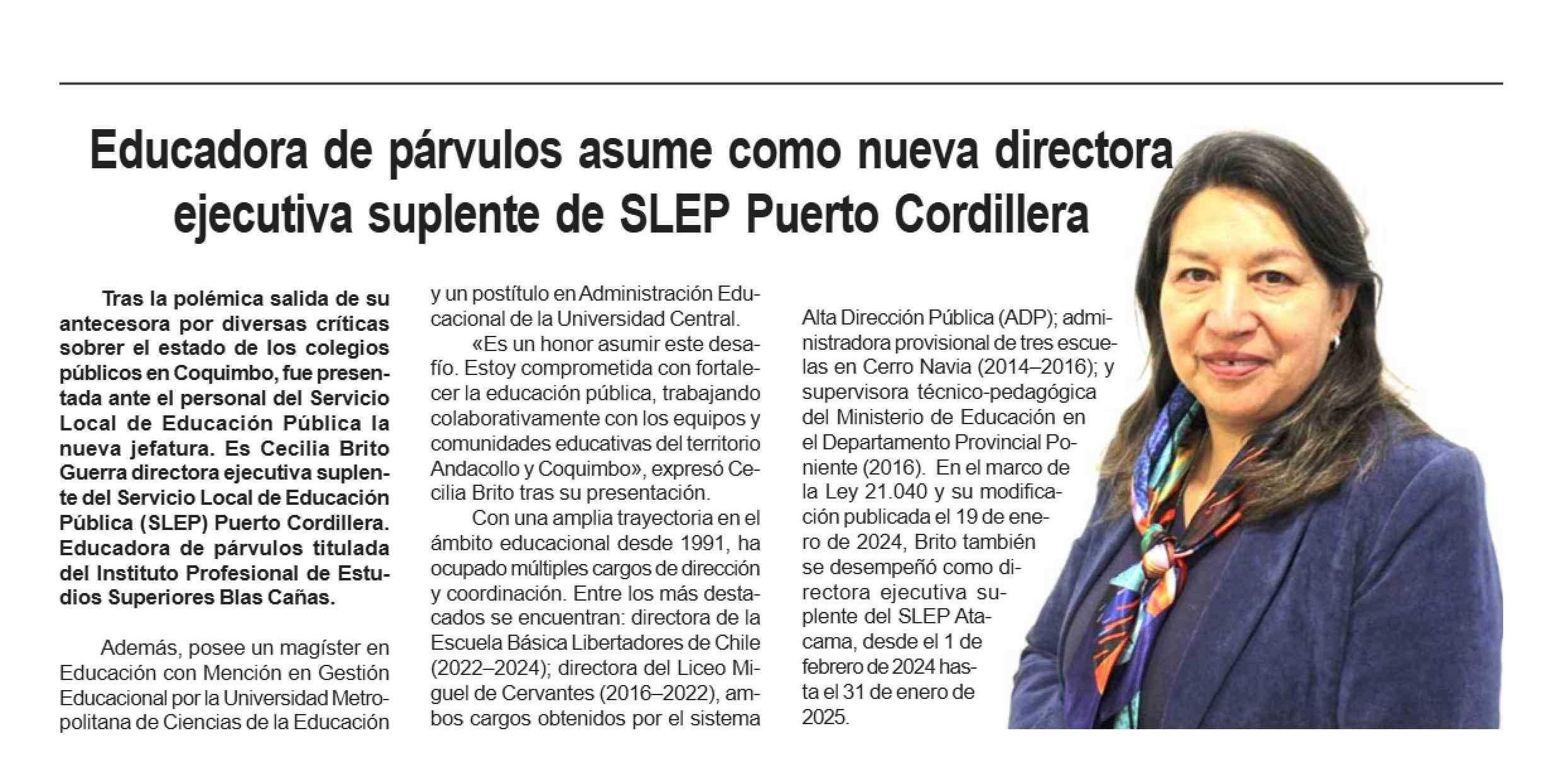 Educadora de párvulos asume como nueva directora ejecutiva suplente de SLEP Puerto Cordillera 07-05-2025 Diario la Región |