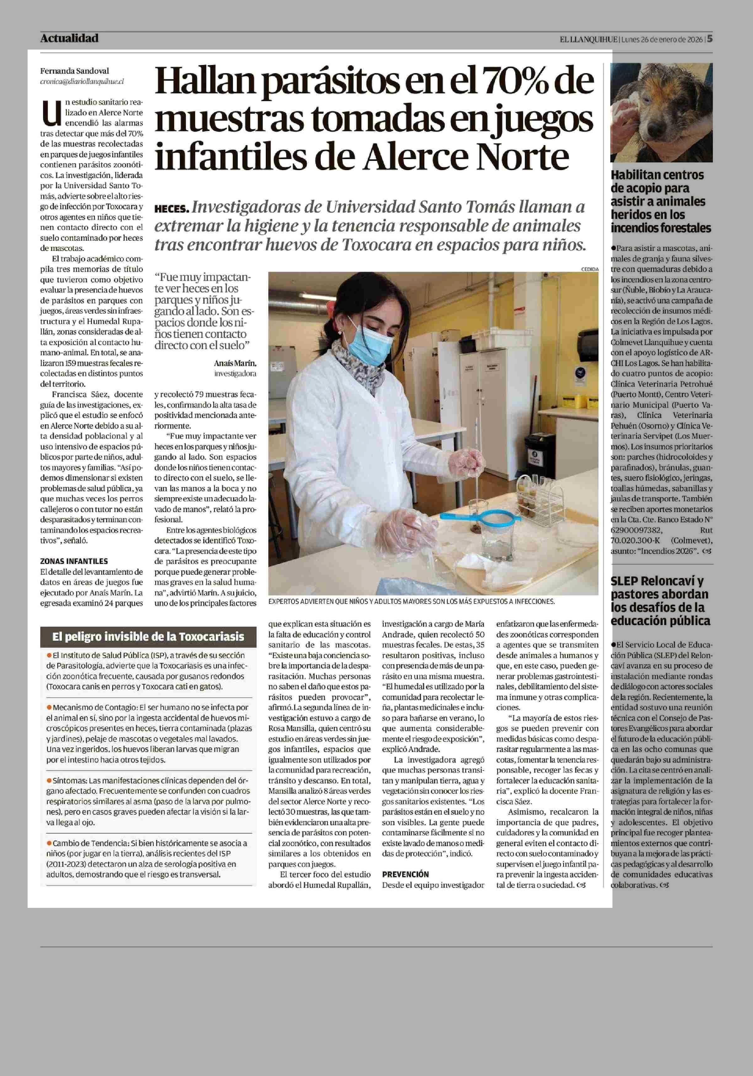 Hallan parásitos en el 70% de muestras tomadas en juegos infantiles de Alerce Norte 26-01-2026 El Llanquihue |