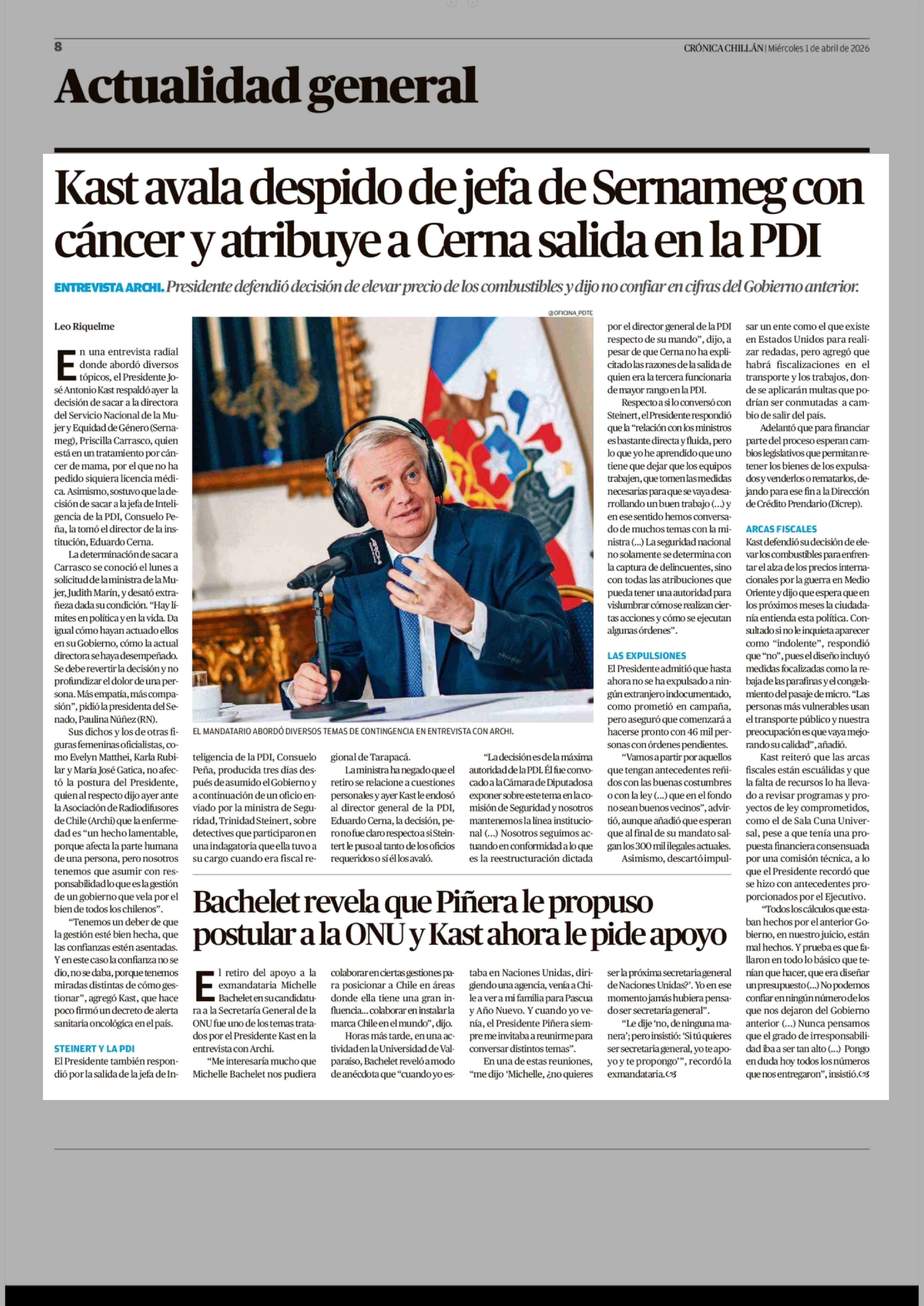 Kast avala despido de jefa de Sernameg con cáncer y atribuye a Cerna salida en la PDI 01-04-2026 Crónica de Chillán |